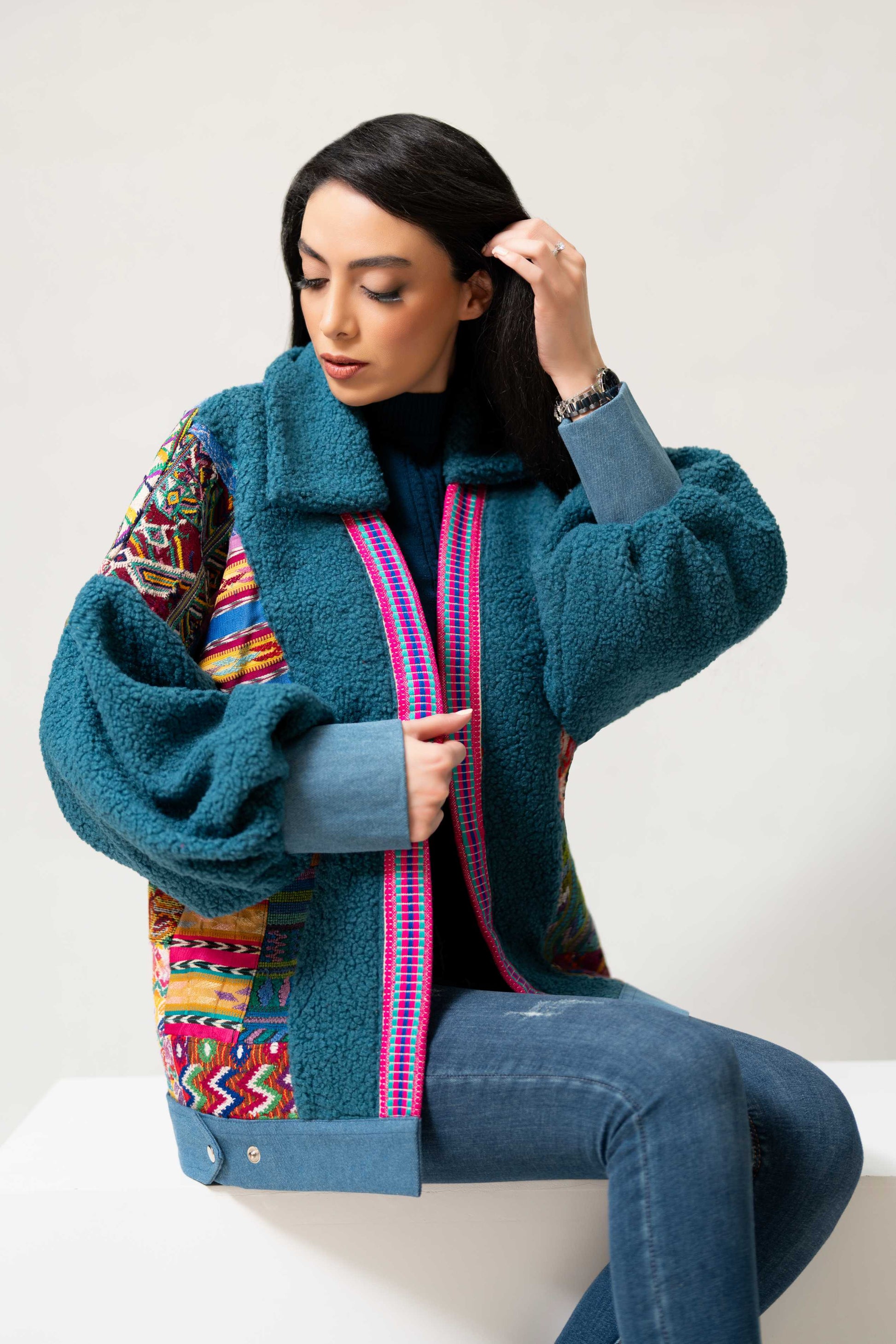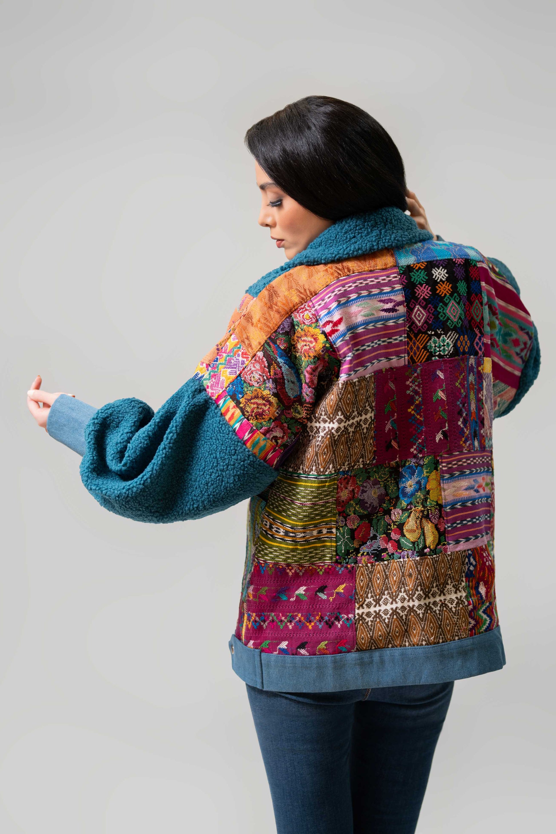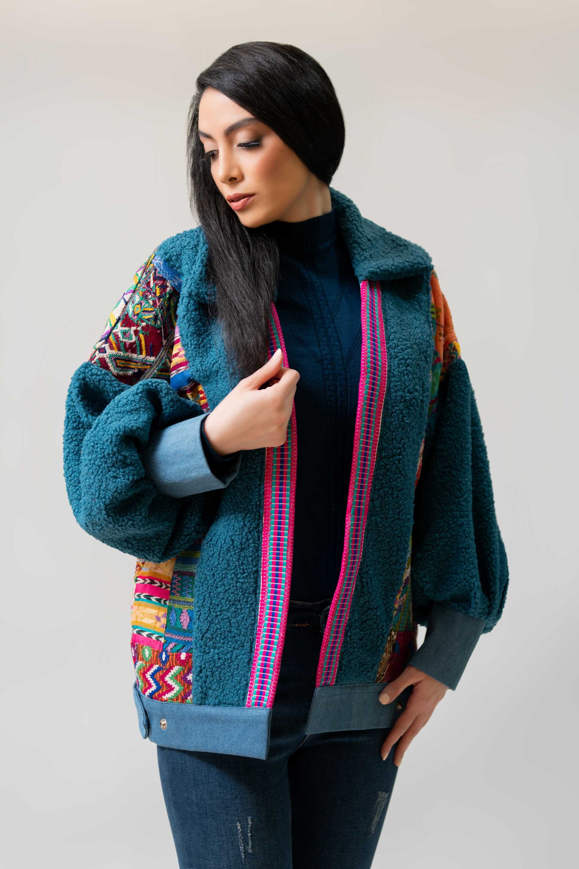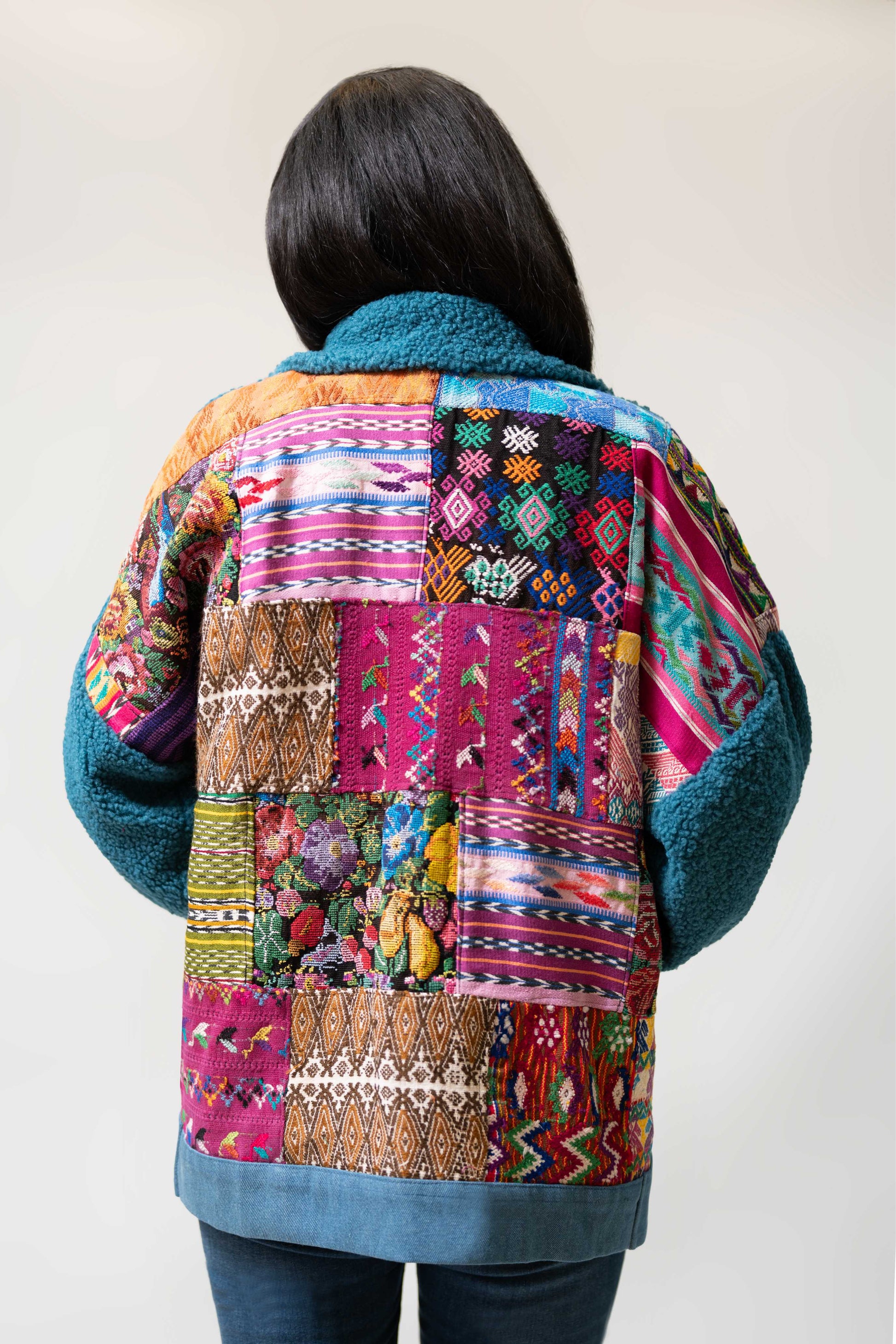 Andes Dream Jacket is a one-of-a-kind handmade statement piece. It features a plush teal fleece front and sleeves for cozy warmth, and the back showcases a vibrant patchwork of colorful textiles inspired by Andean craftsmanship. This free-size design (comfortably fits approximately sizes 36–40) drapes effortlessly, combining comfort with eye-catching style. As a limited edition creation with only one available, this jacket is truly wearable art that will make you stand out.