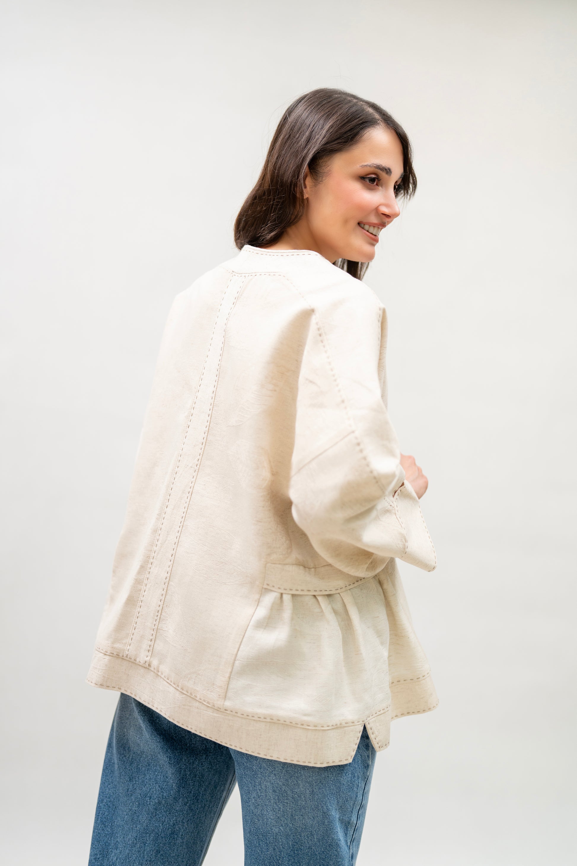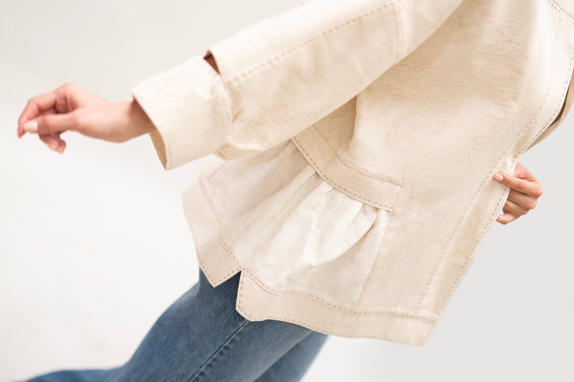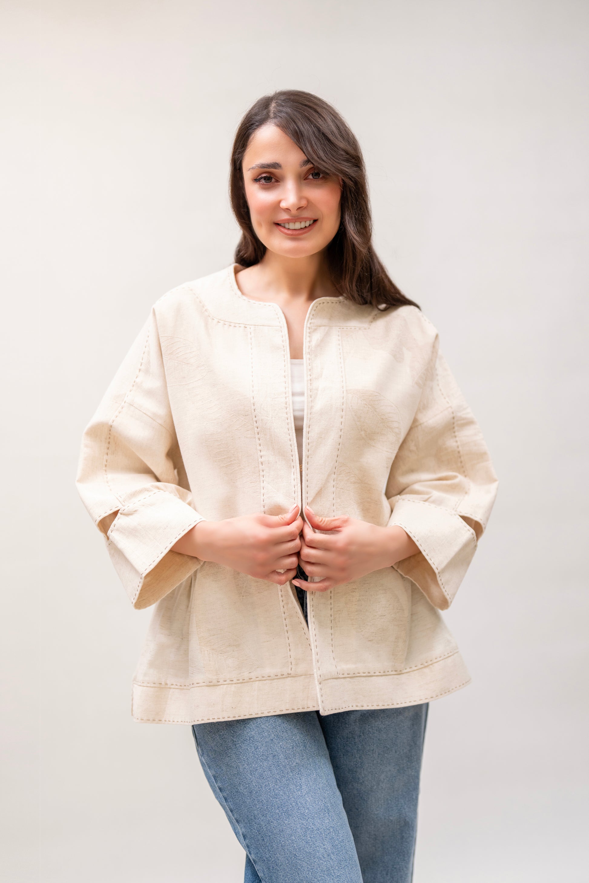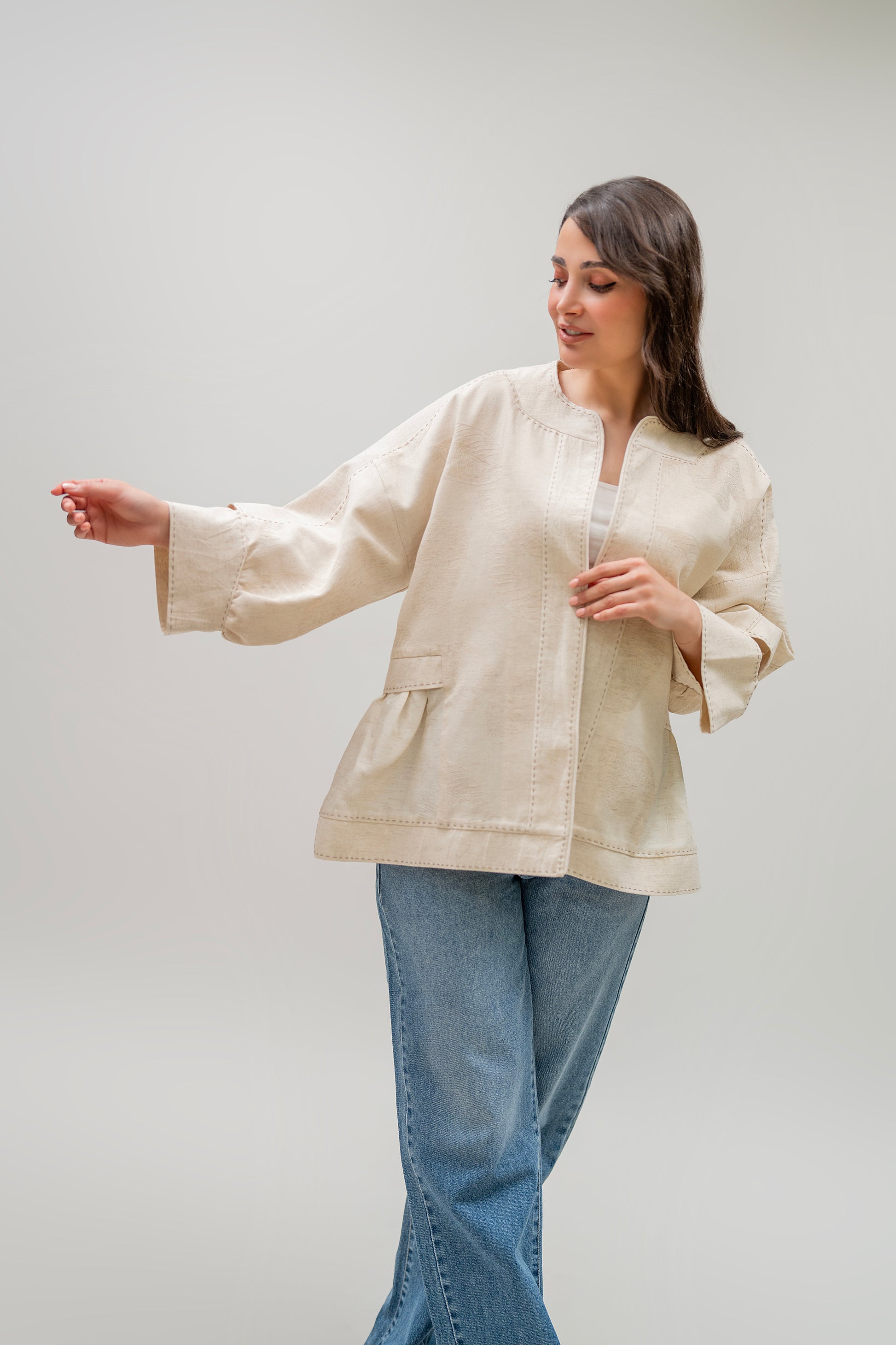 A lightweight, breathable jacket handcrafted from soft beige cotton. Designed for effortless layering in spring and summer, with wide sleeves, hand-stitched details, and gathered side pockets for added charm.