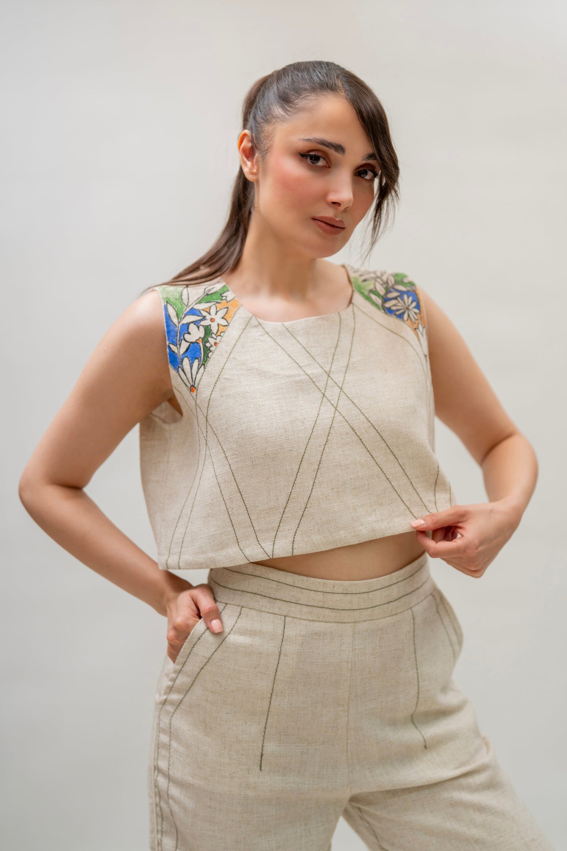 Beige Linen Crop Top with Hand-Painted Floral Detail