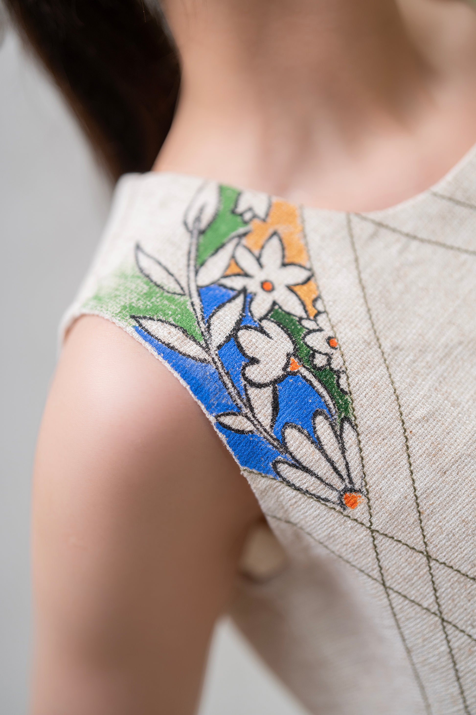 A breathable beige linen top elevated with hand-painted floral artwork on the shoulders. Lightweight and artistic, it's a perfect summer statement piece.