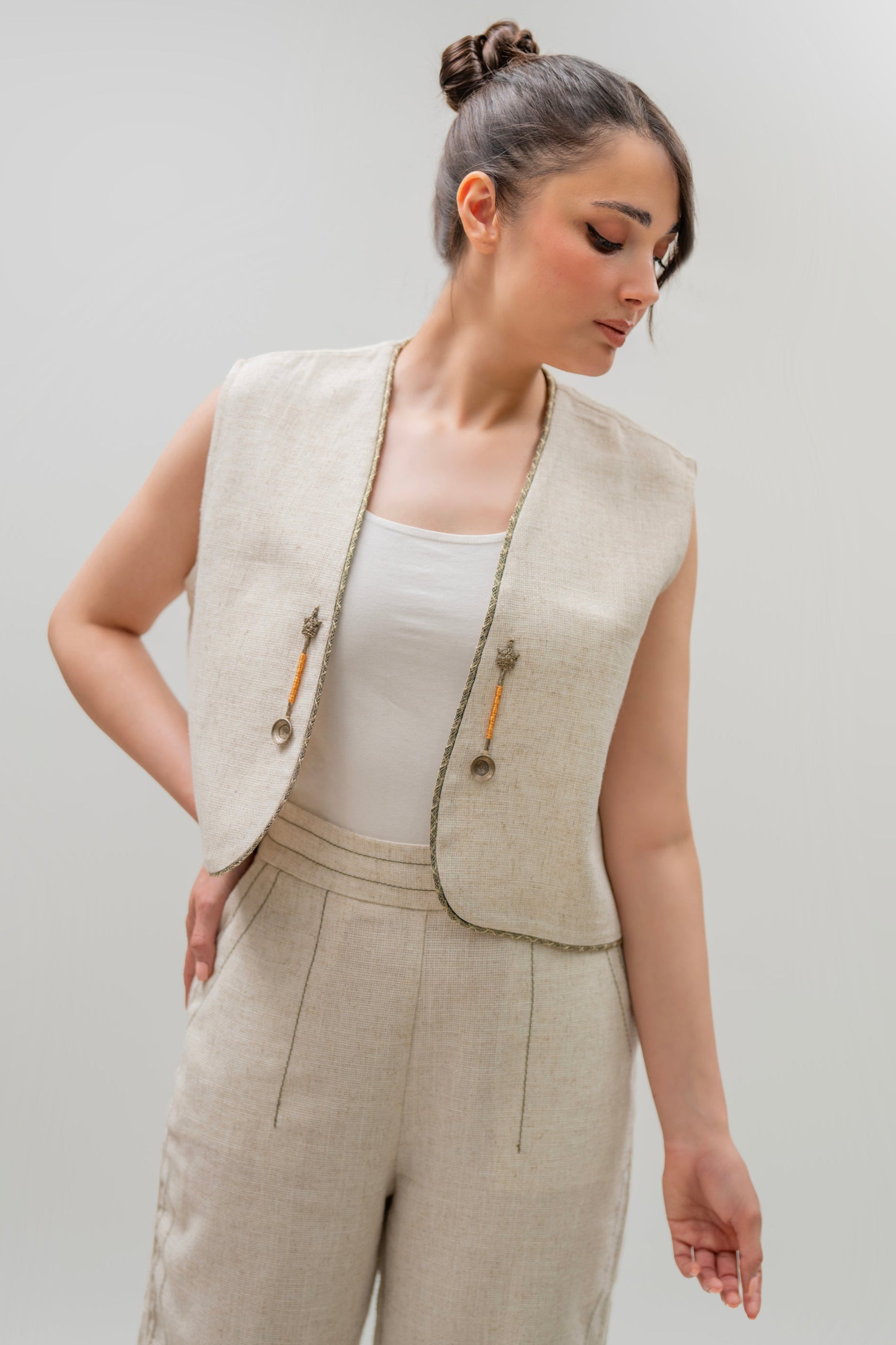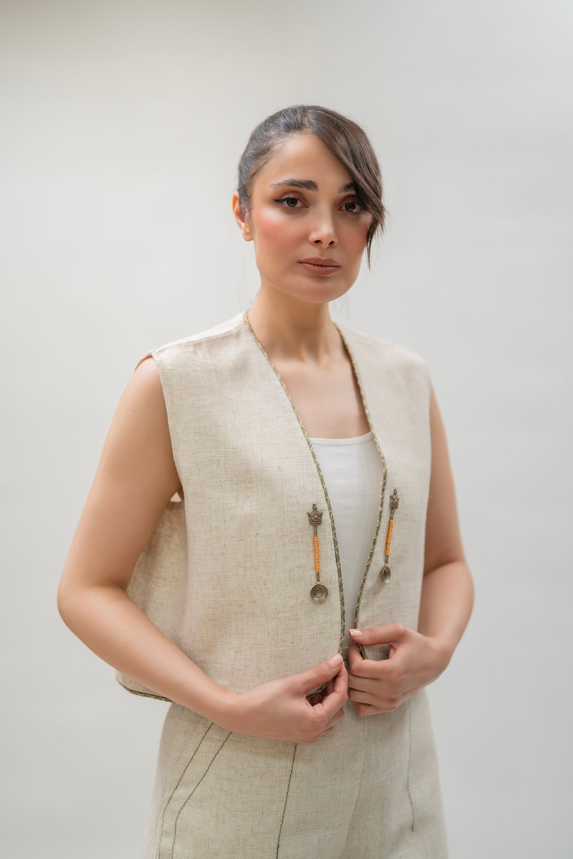 A tailored beige vest made from breathable linen, featuring unique ornamental closures with antique-style charms. A perfect layering piece for boho, minimalist, or artisan looks.