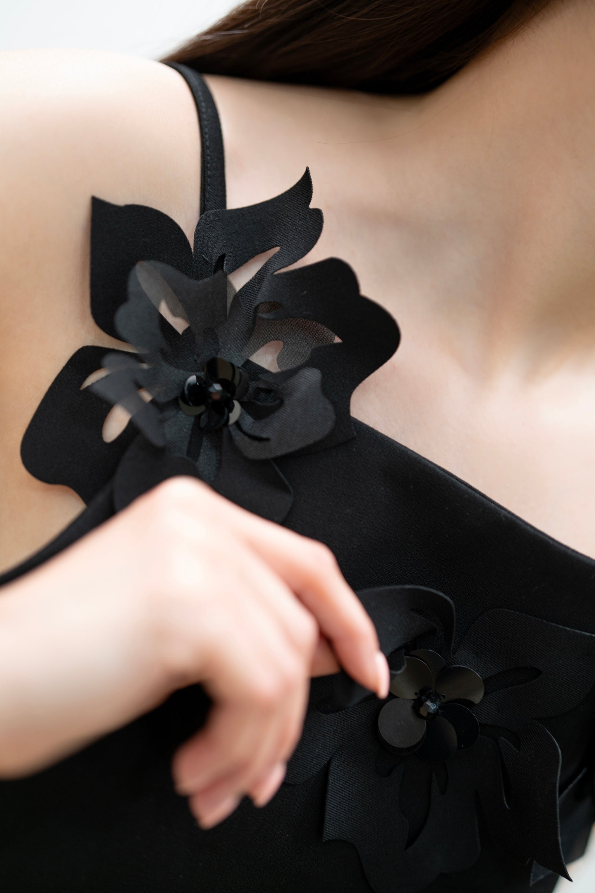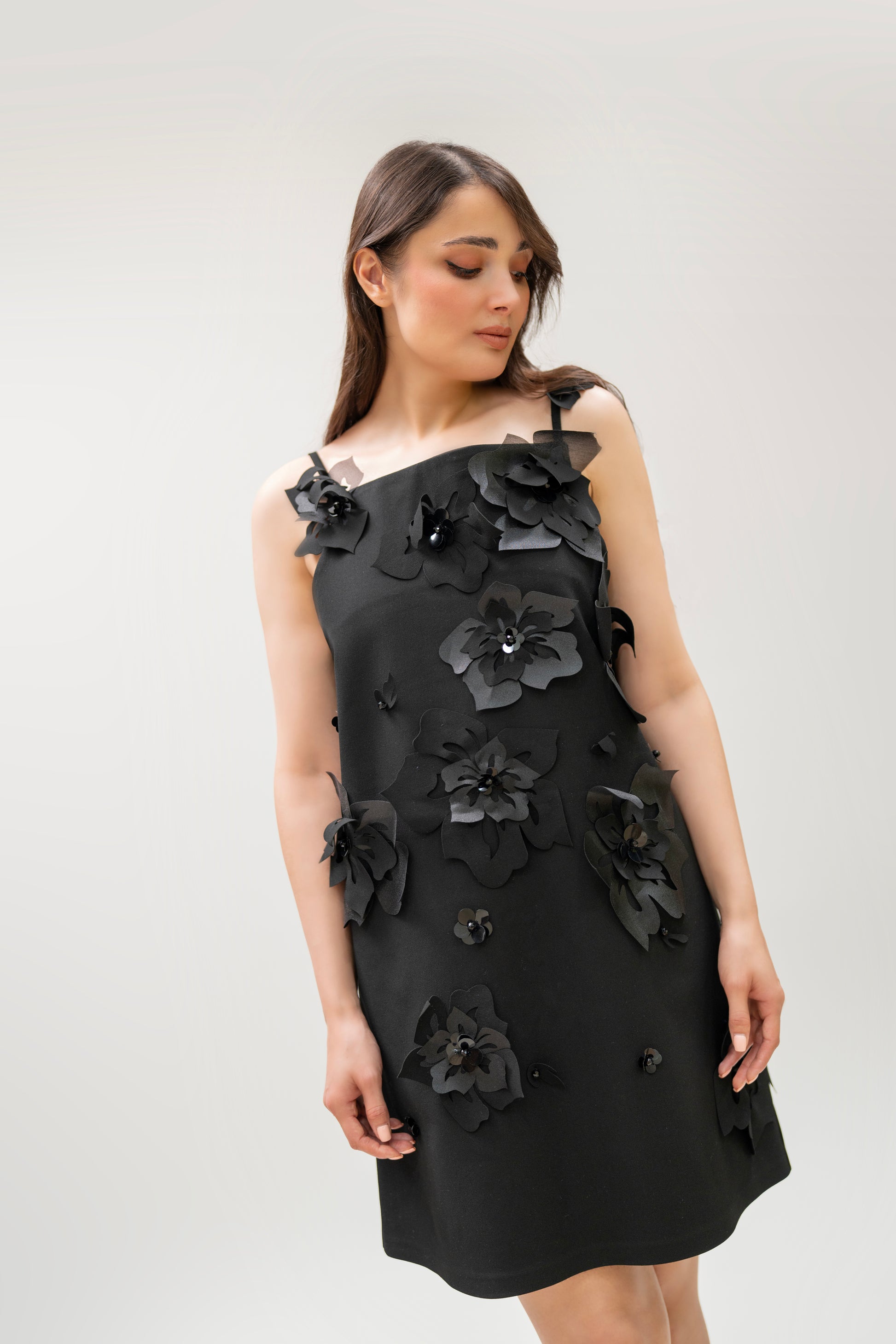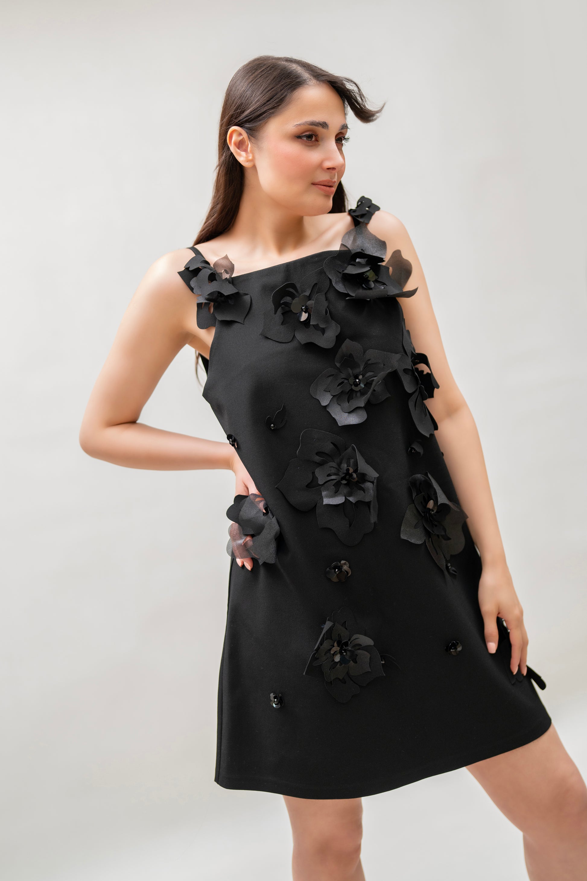 A timeless little black dress elevated with handmade 3D floral appliqués. This sculptural A-line silhouette blends elegance with edge, perfect for events, cocktails, or creative styling.