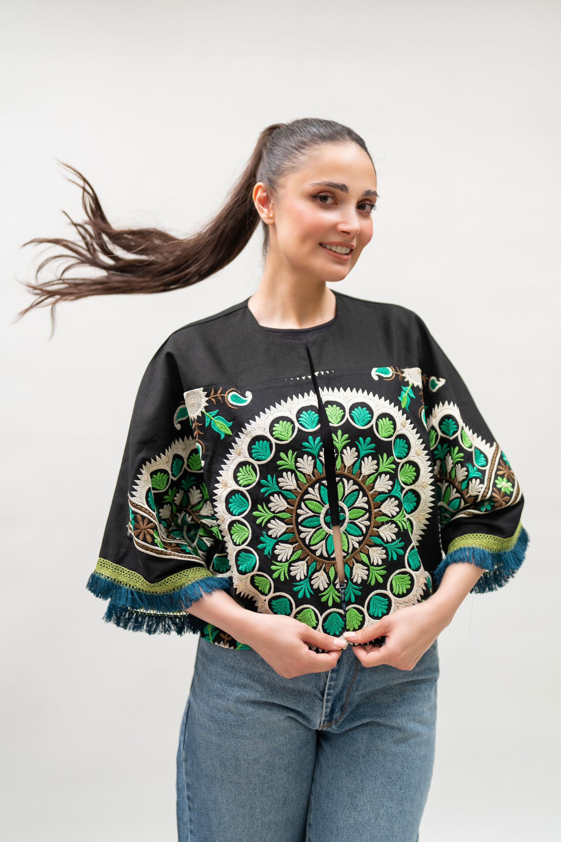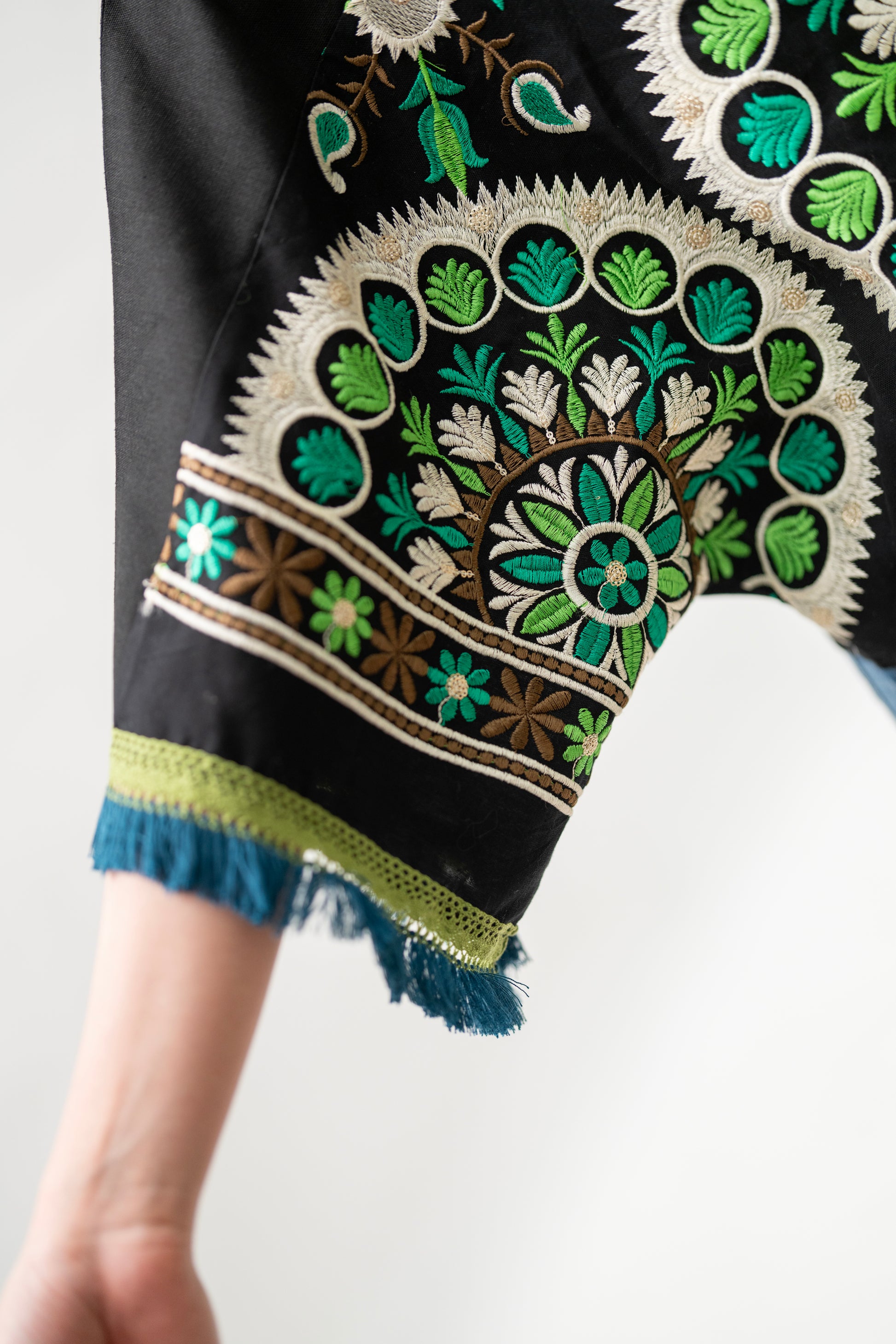 A bold, handmade jacket featuring vibrant green and blue embroidery, finished with statement fringe details, perfect for layering in spring and summer.