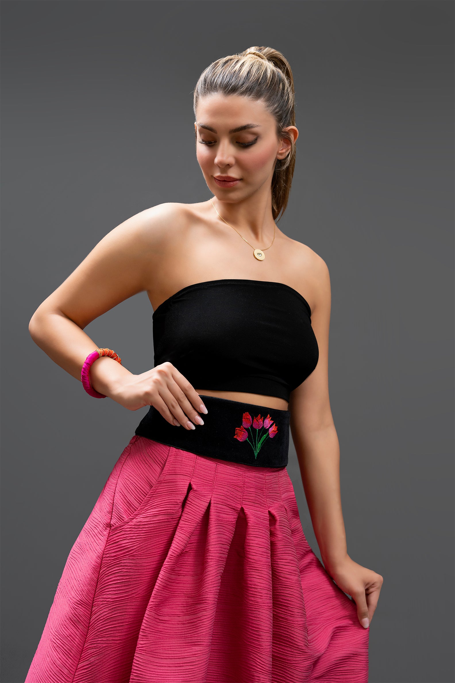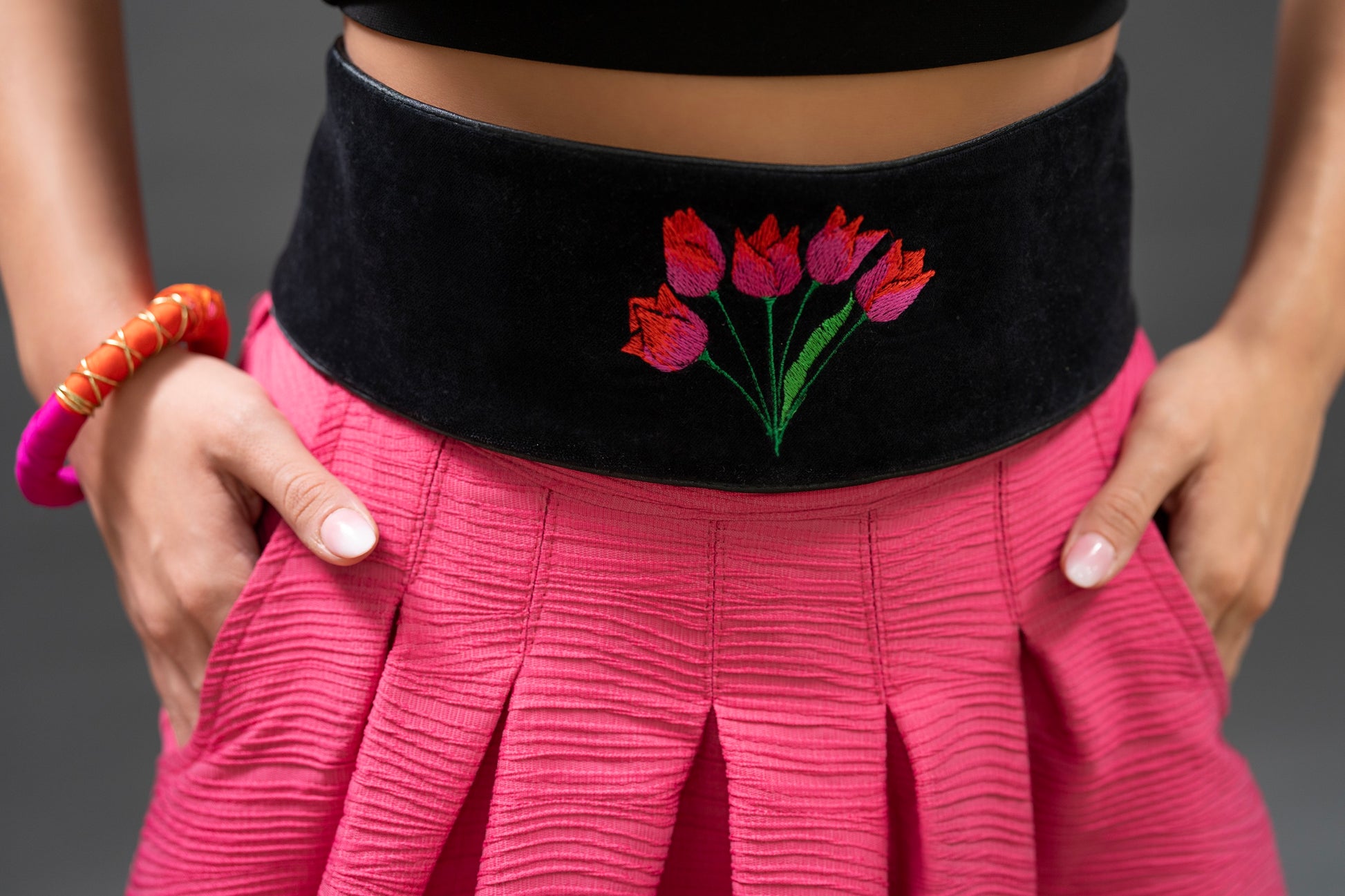 Handmade black velvet belt with vibrant tulip embroidery — a unique accessory to elevate any look.