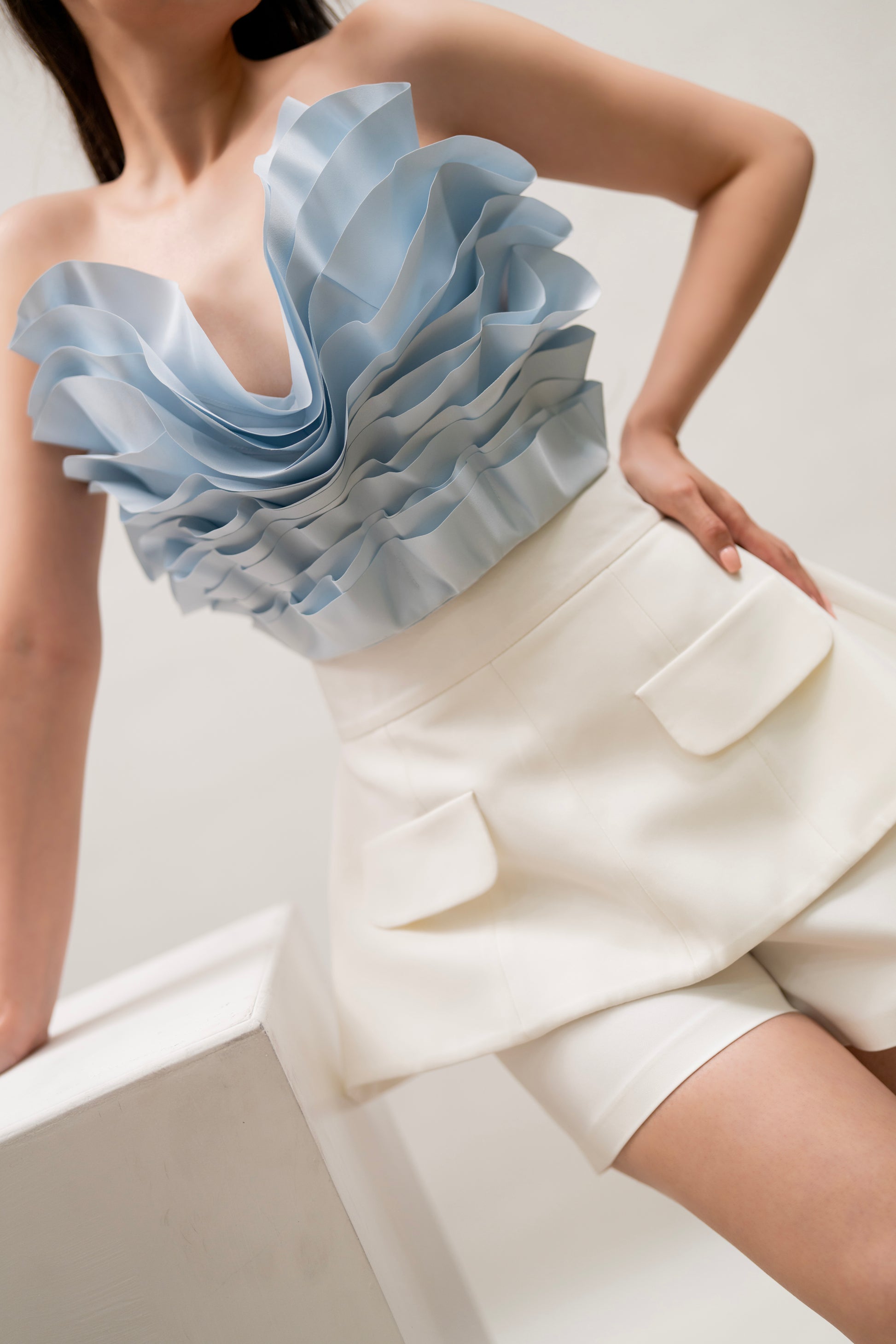 A bold and elegant strapless top with sculptural ruffles and a lace-up back.