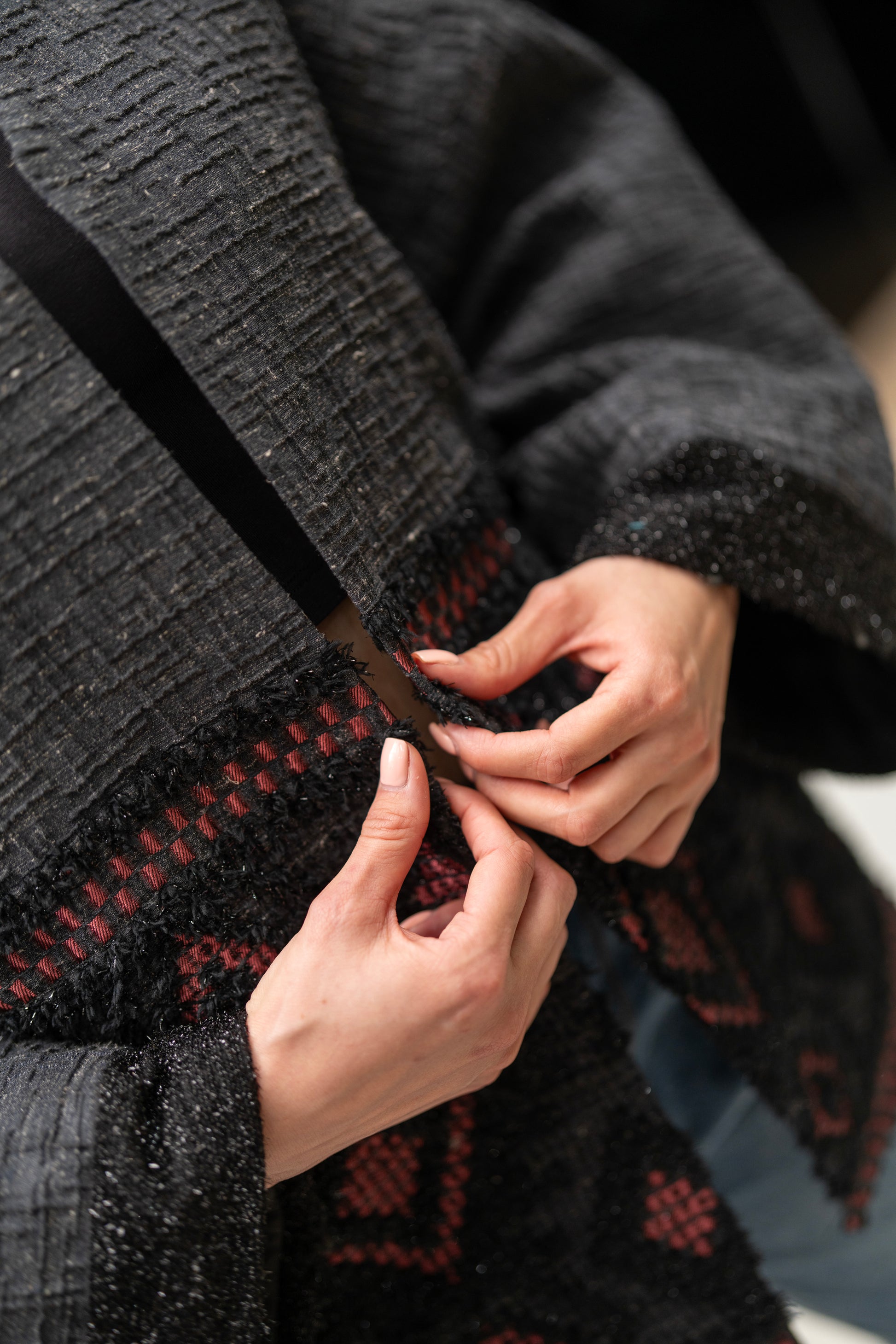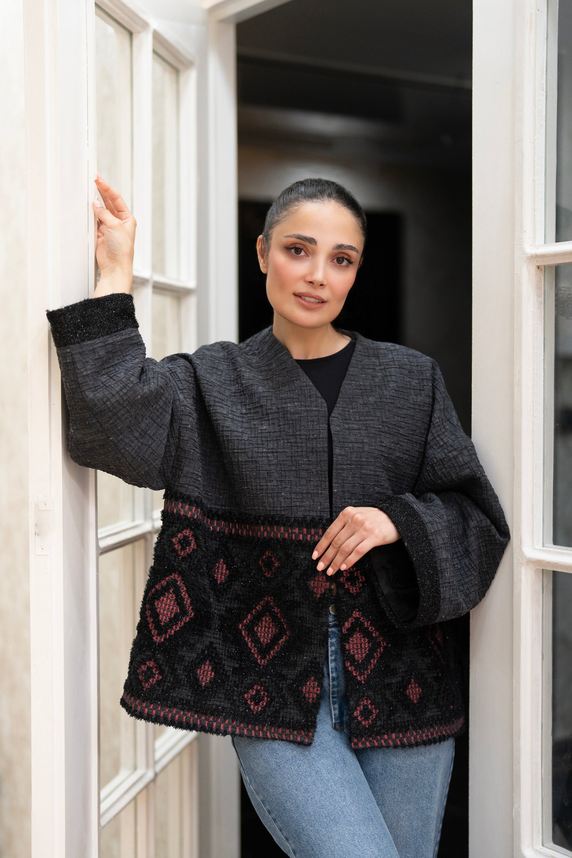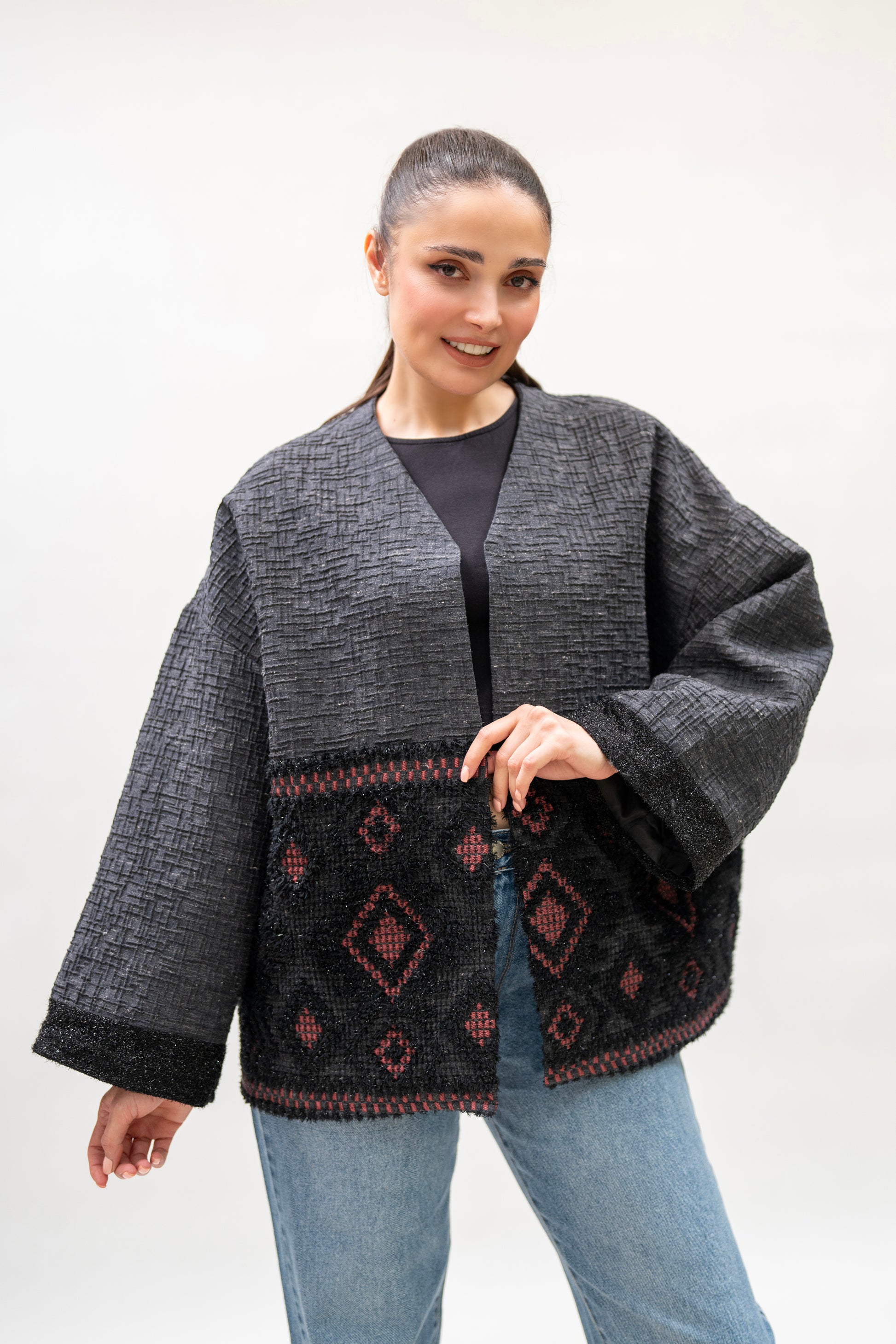A sophisticated black and charcoal open-front jacket featuring a rich woven texture and bold red geometric patterns. This statement piece combines structure and comfort for an effortlessly elevated everyday look.