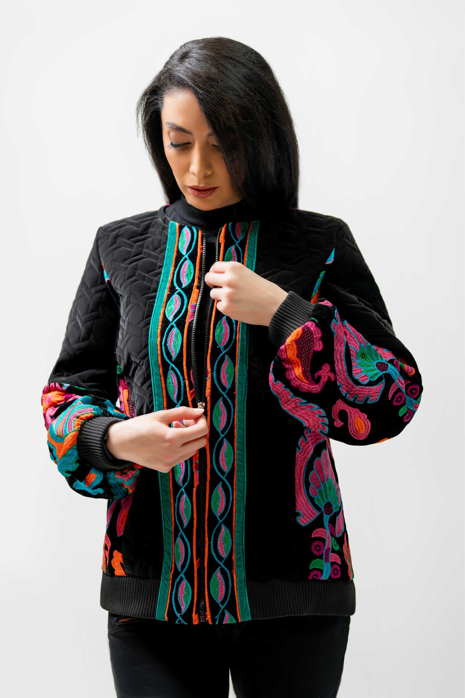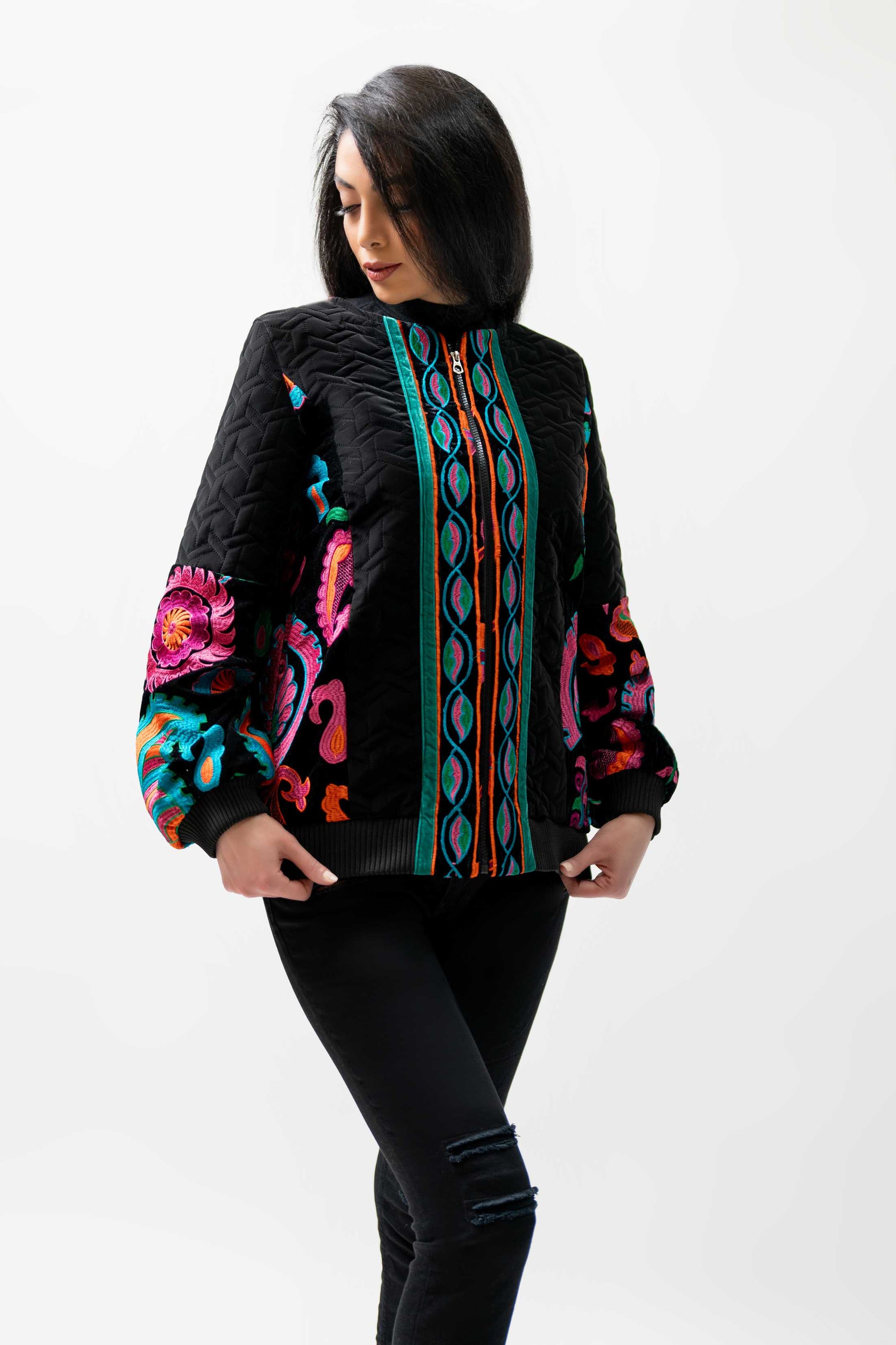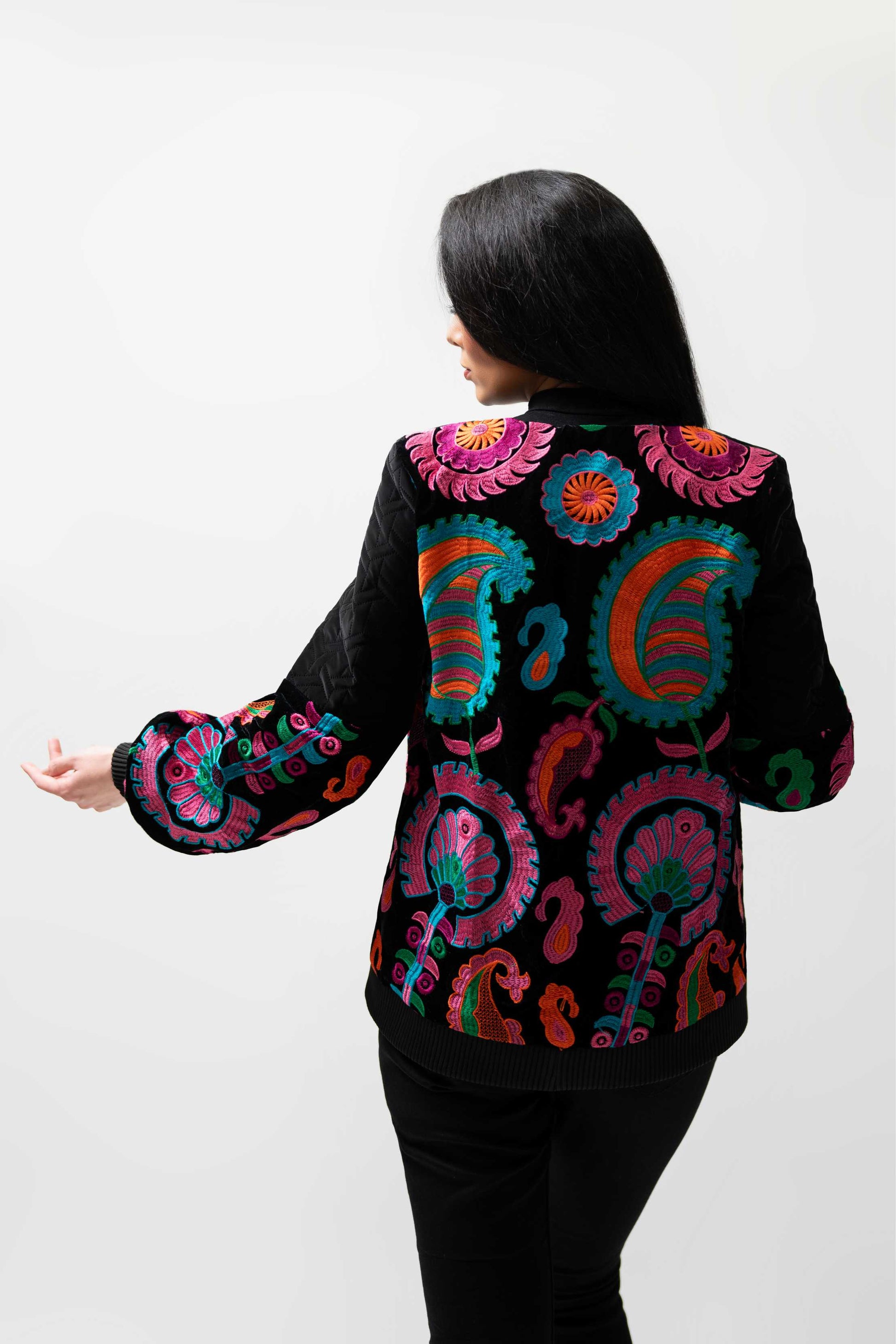 Limited-edition vibrant and artistic, the Nomad Spirit Jacket brings a bold splash of color to your wardrobe. Featuring intricate multicolor embroidery on rich black velvet.