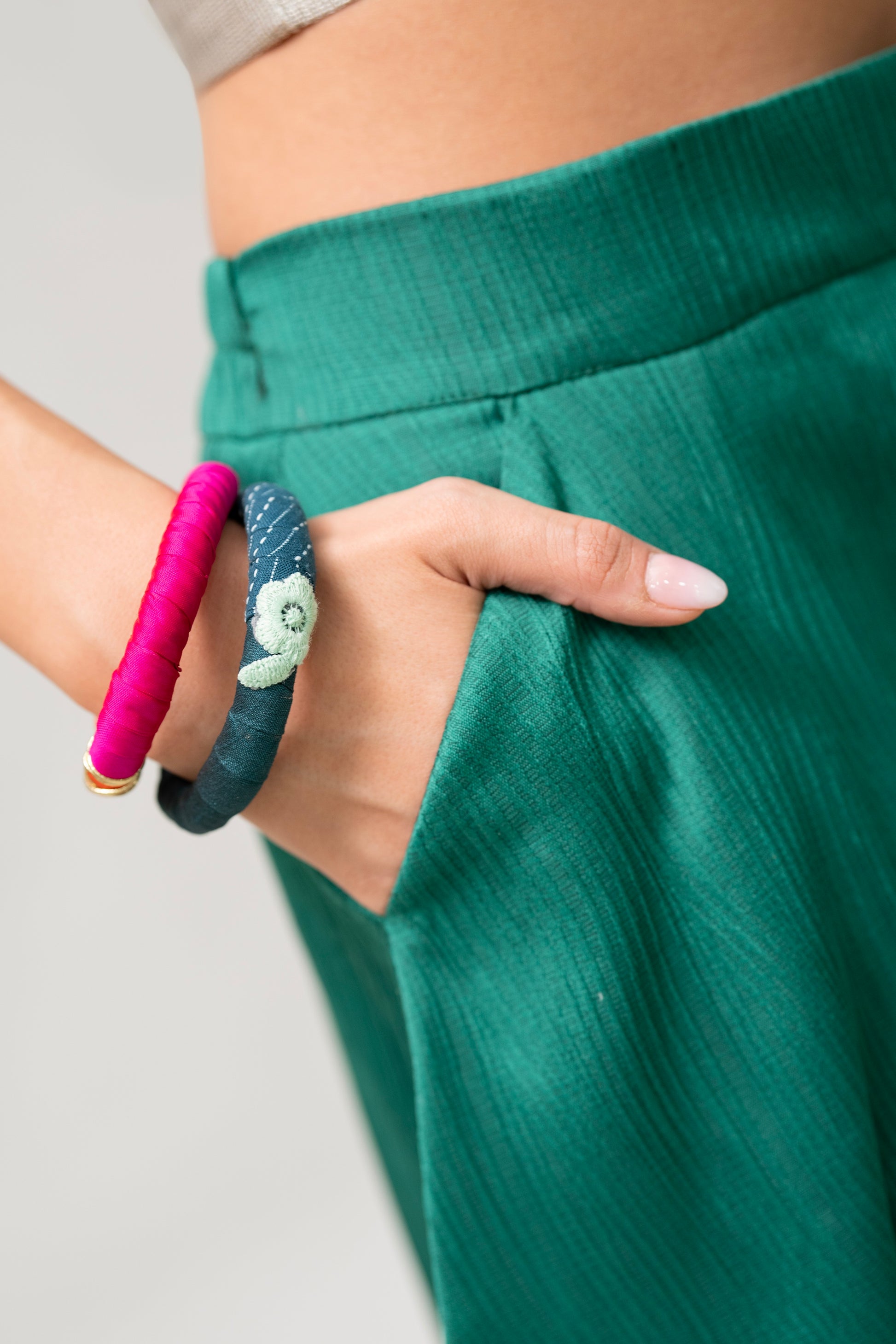 Handmade emerald green wide-leg pants with side pockets and a relaxed fit.