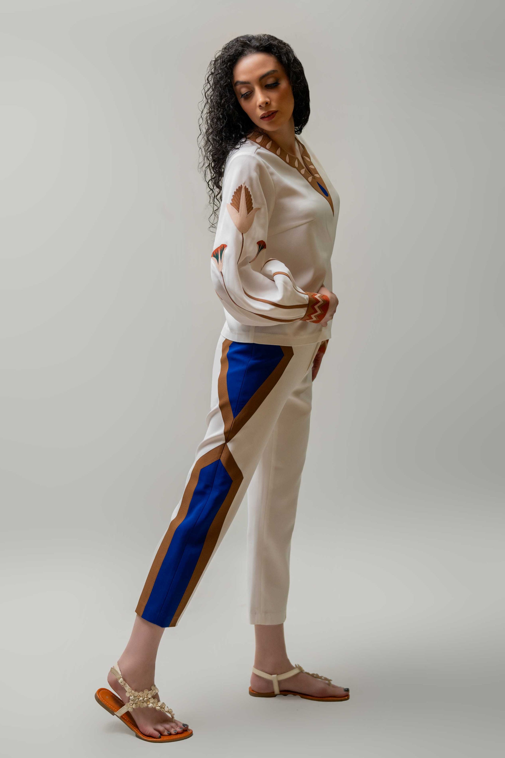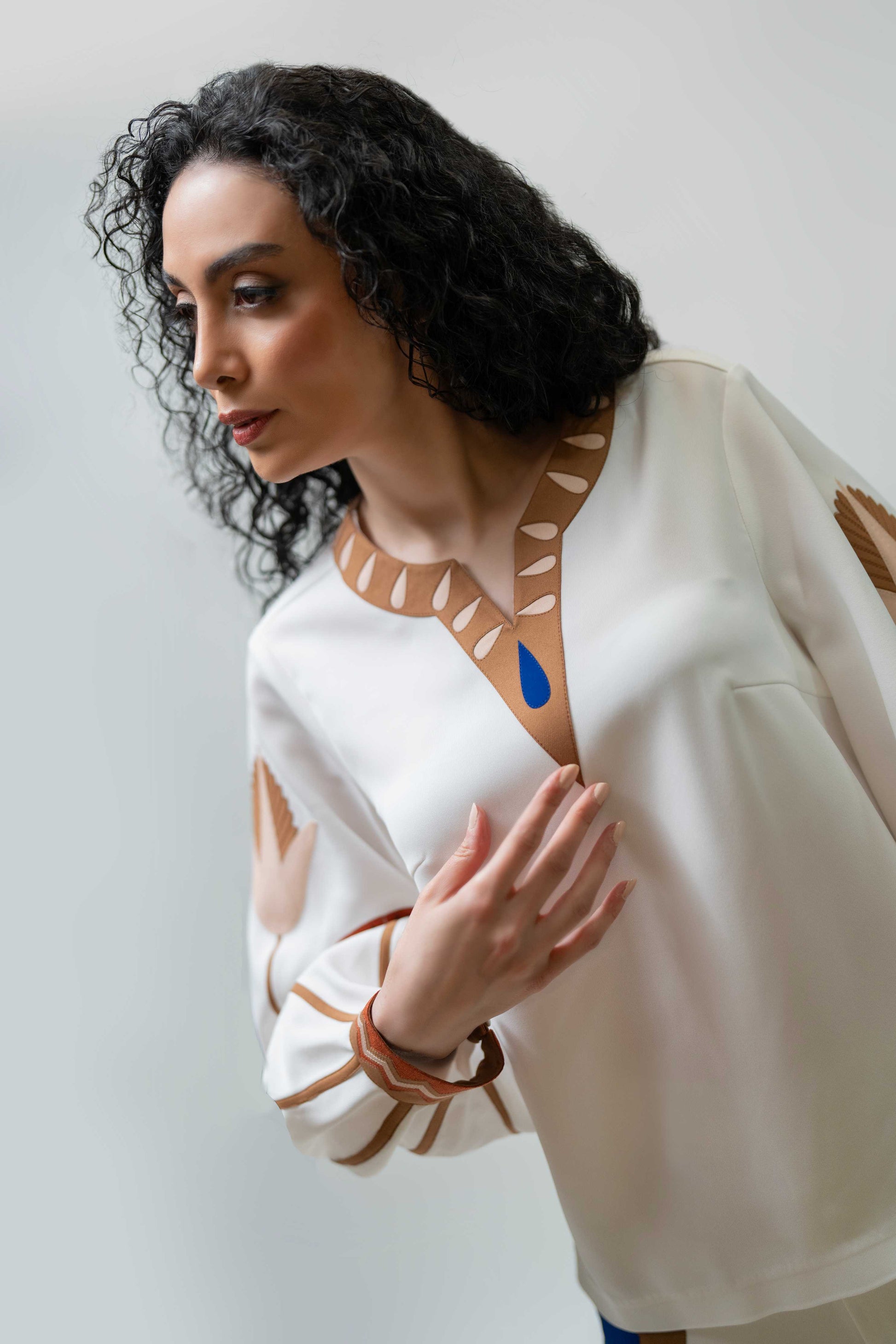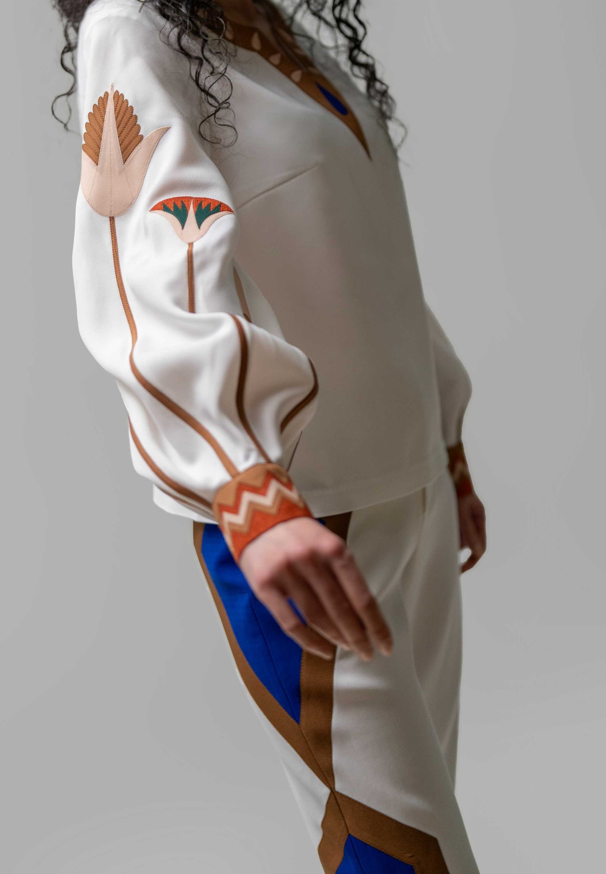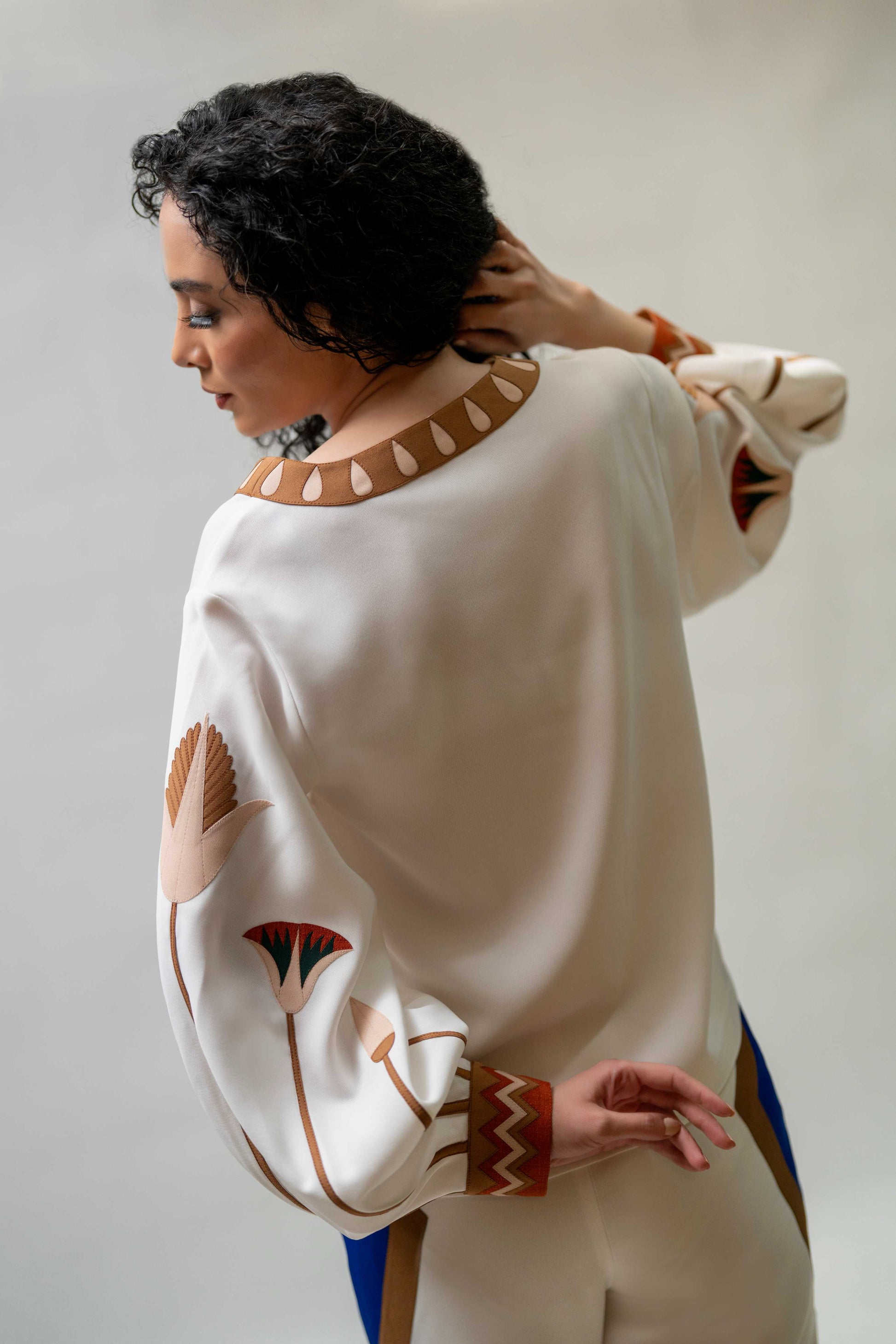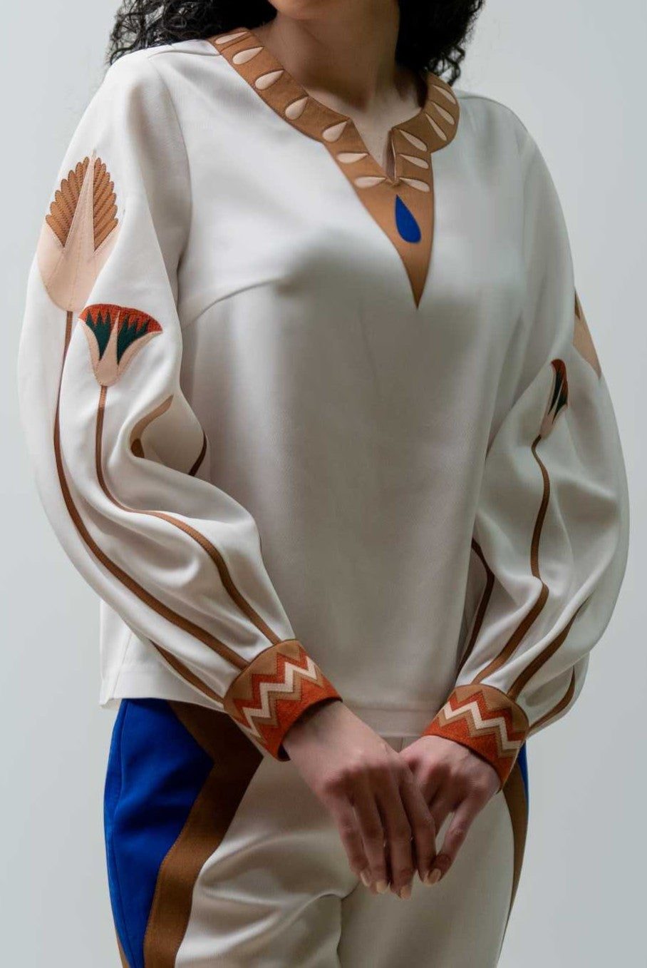Cream top with puffed sleeves, floral appliqué, and geometric trim details. A bold yet graceful look.