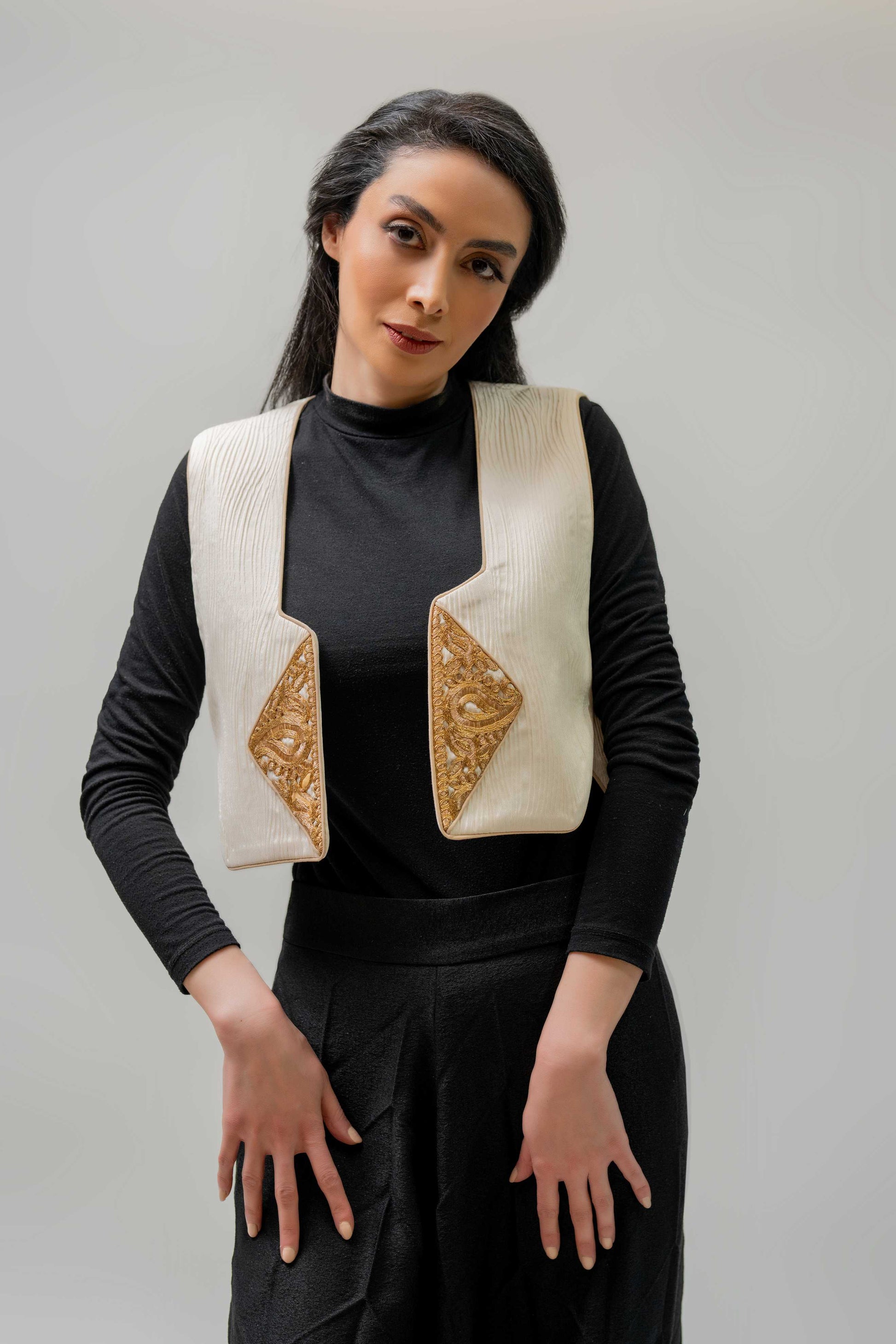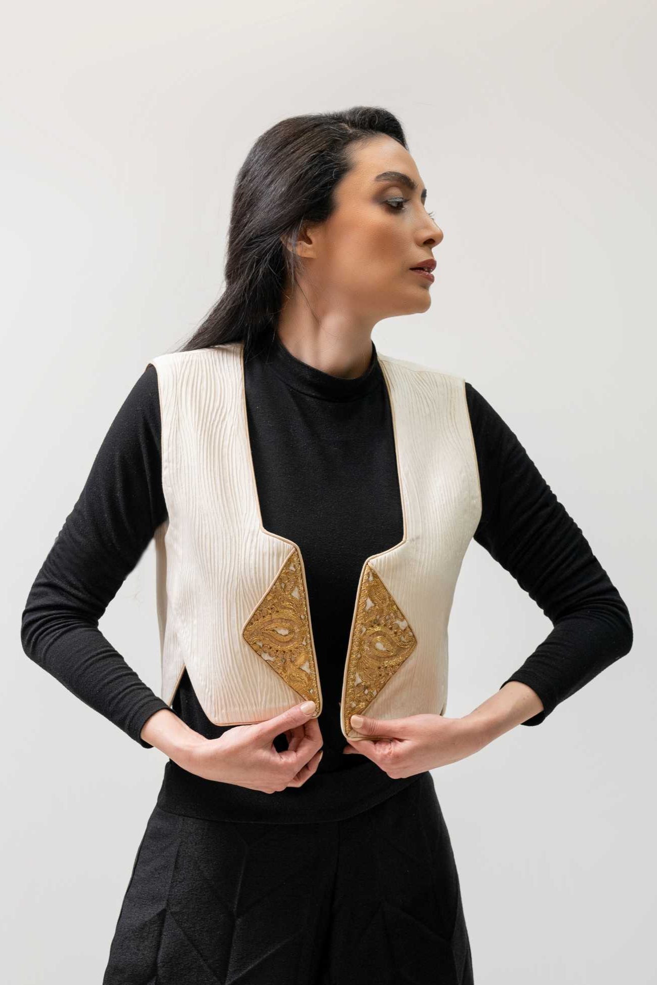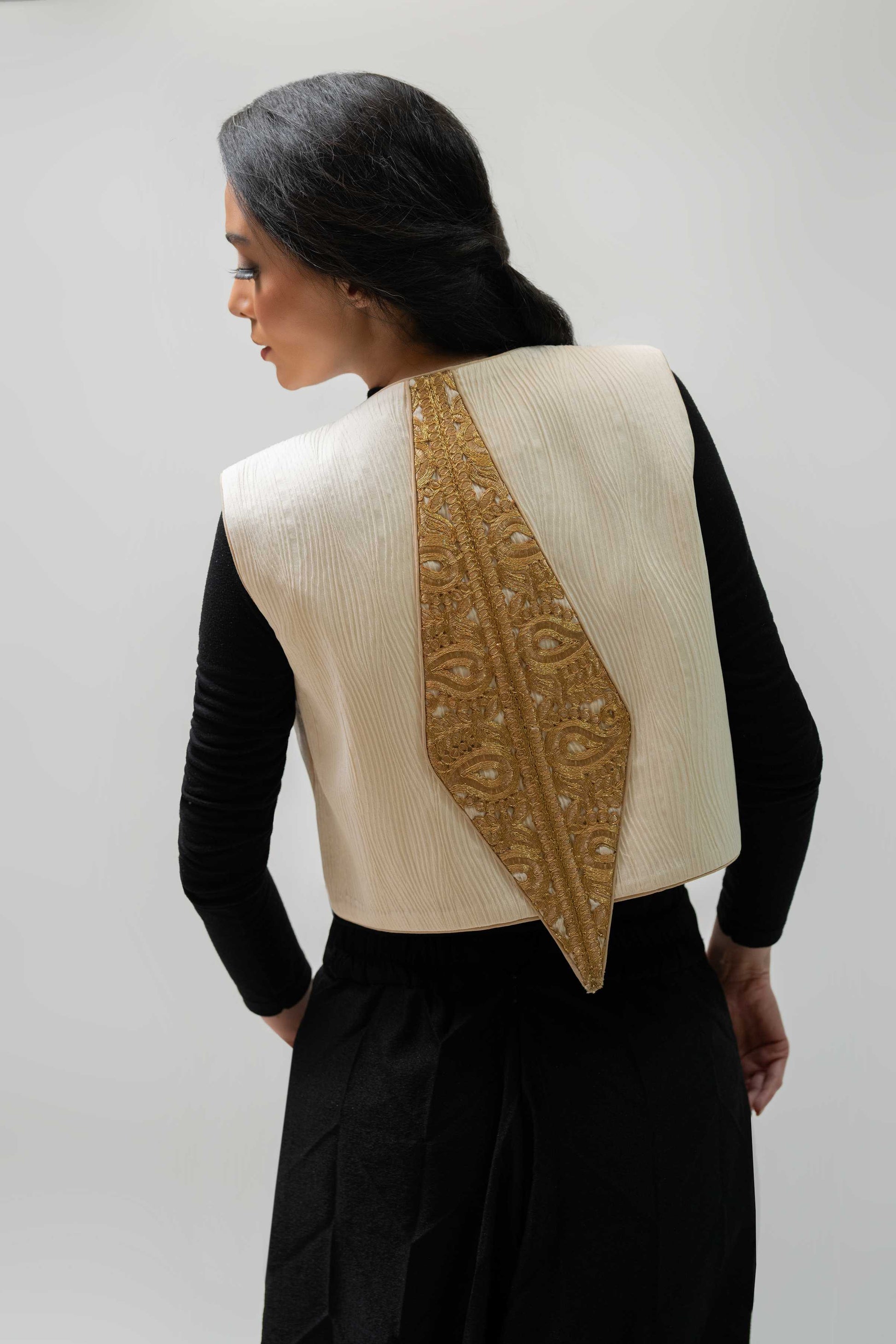 A structured cream vest with intricate gold embroidery panels, timeless charm with a bold twist.