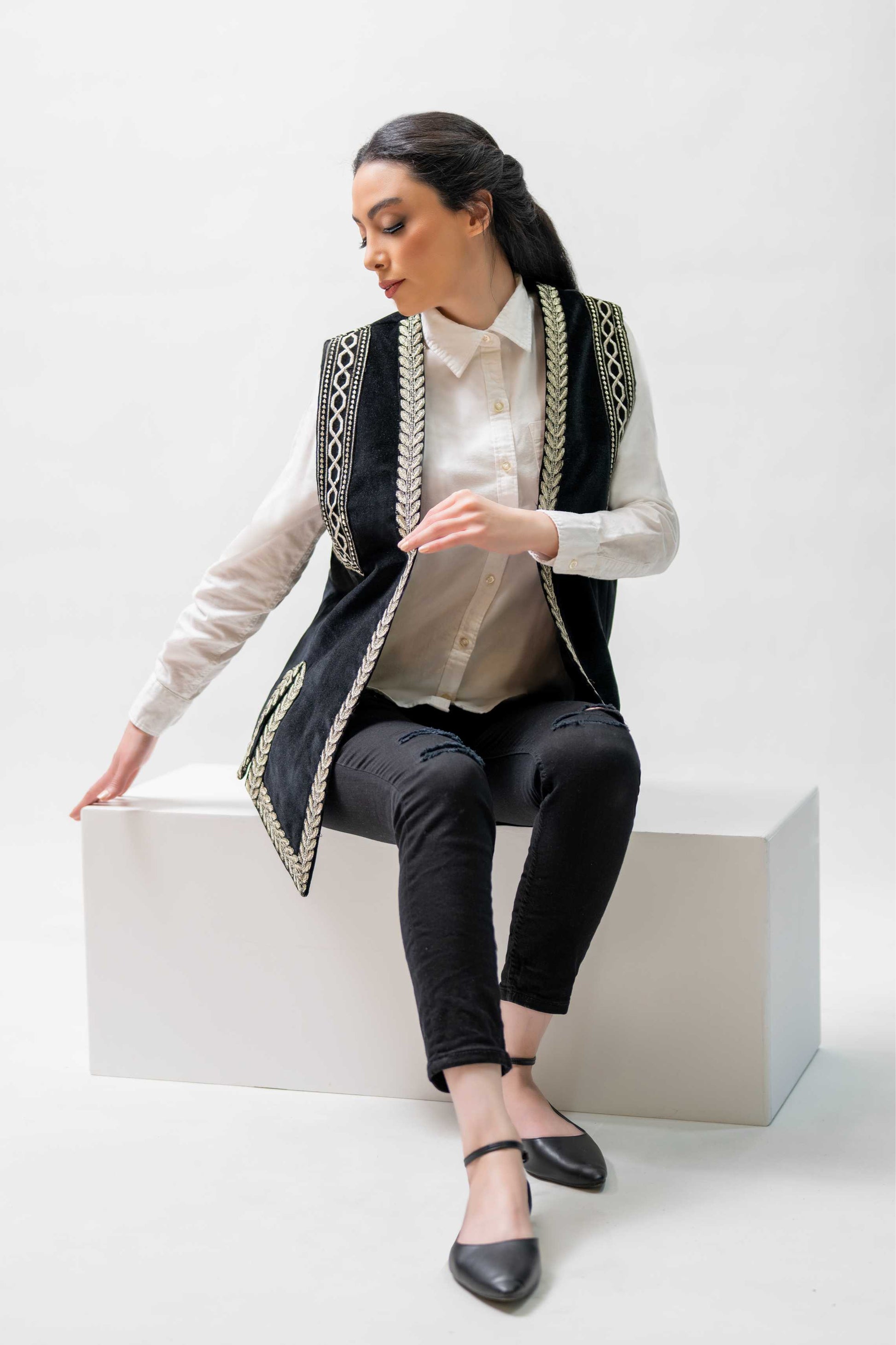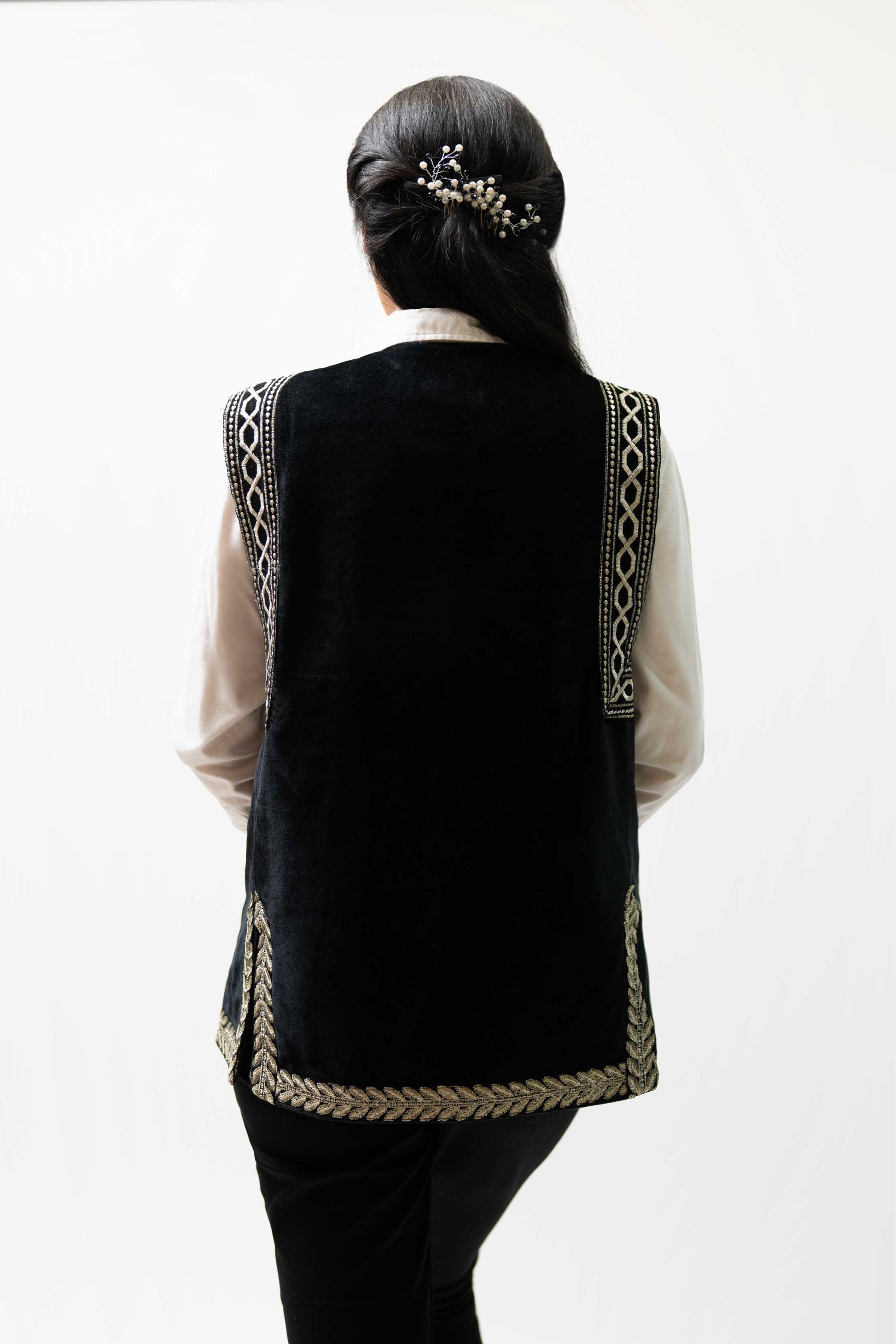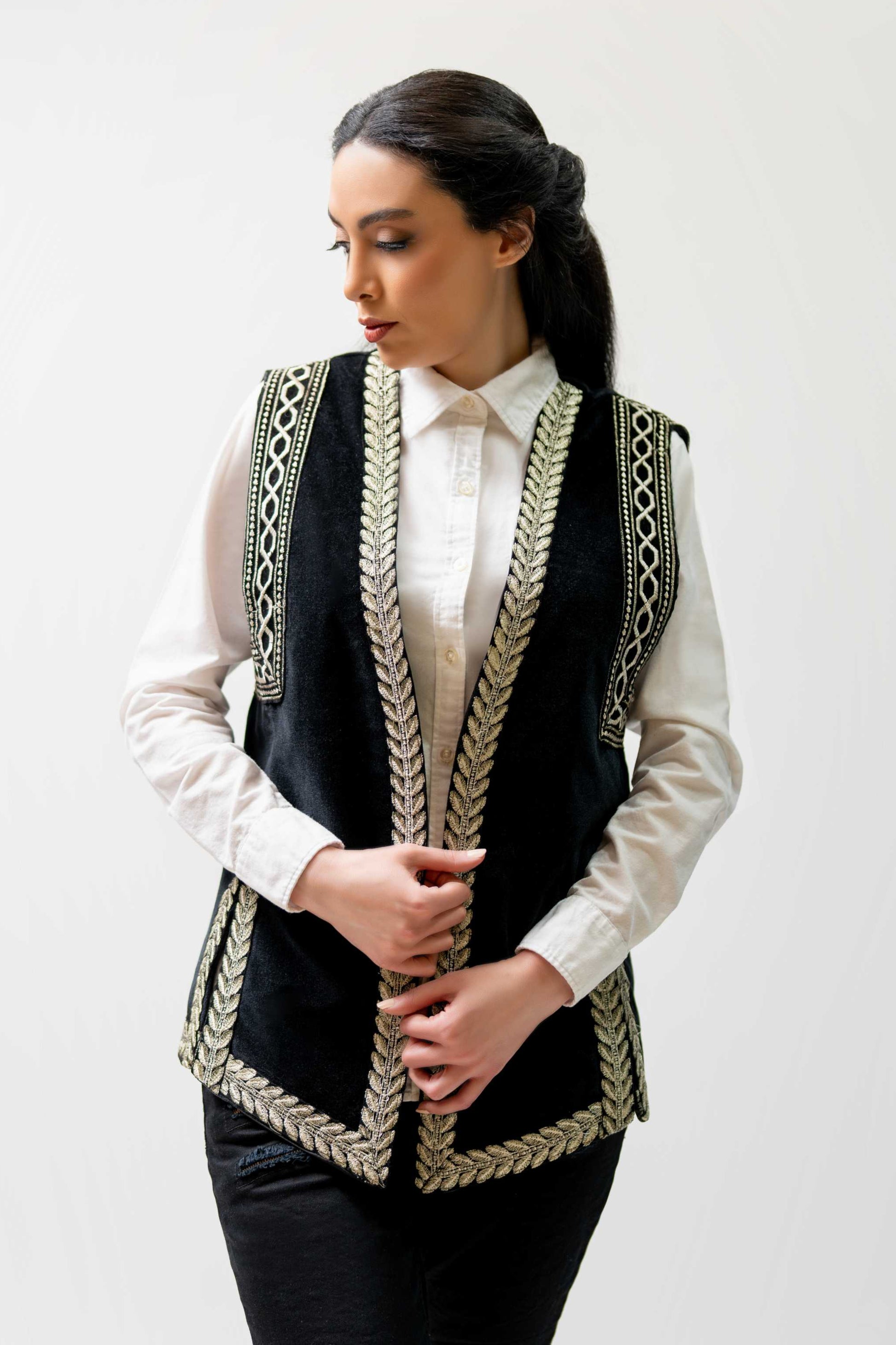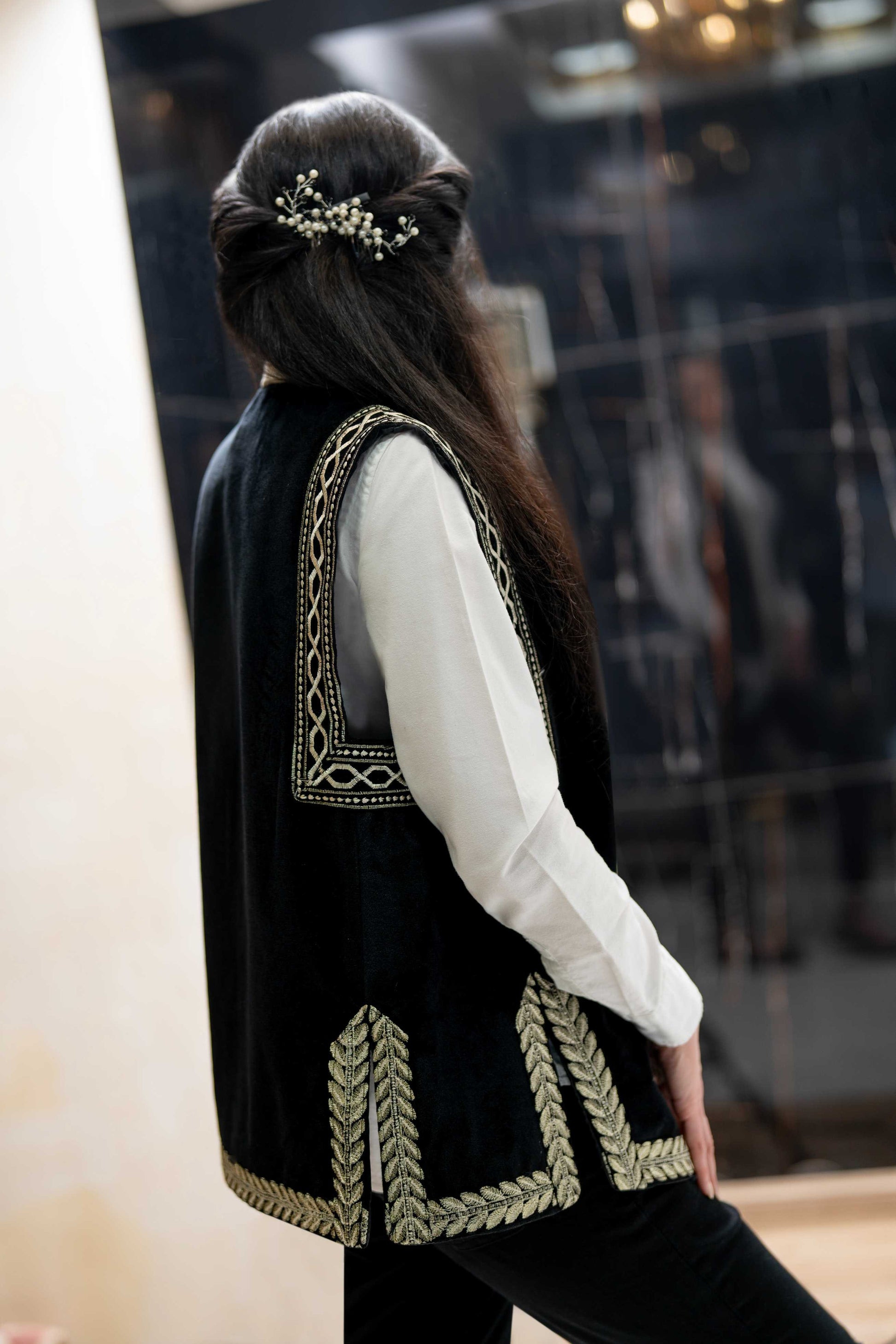 Elegant black velvet vest featuring intricate gold embroidery. Handmade with fine craftsmanship for a classic and sophisticated look.