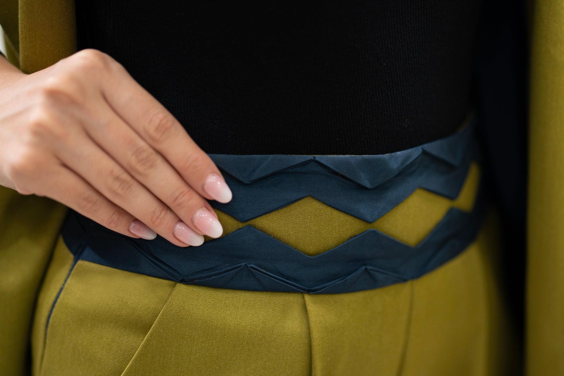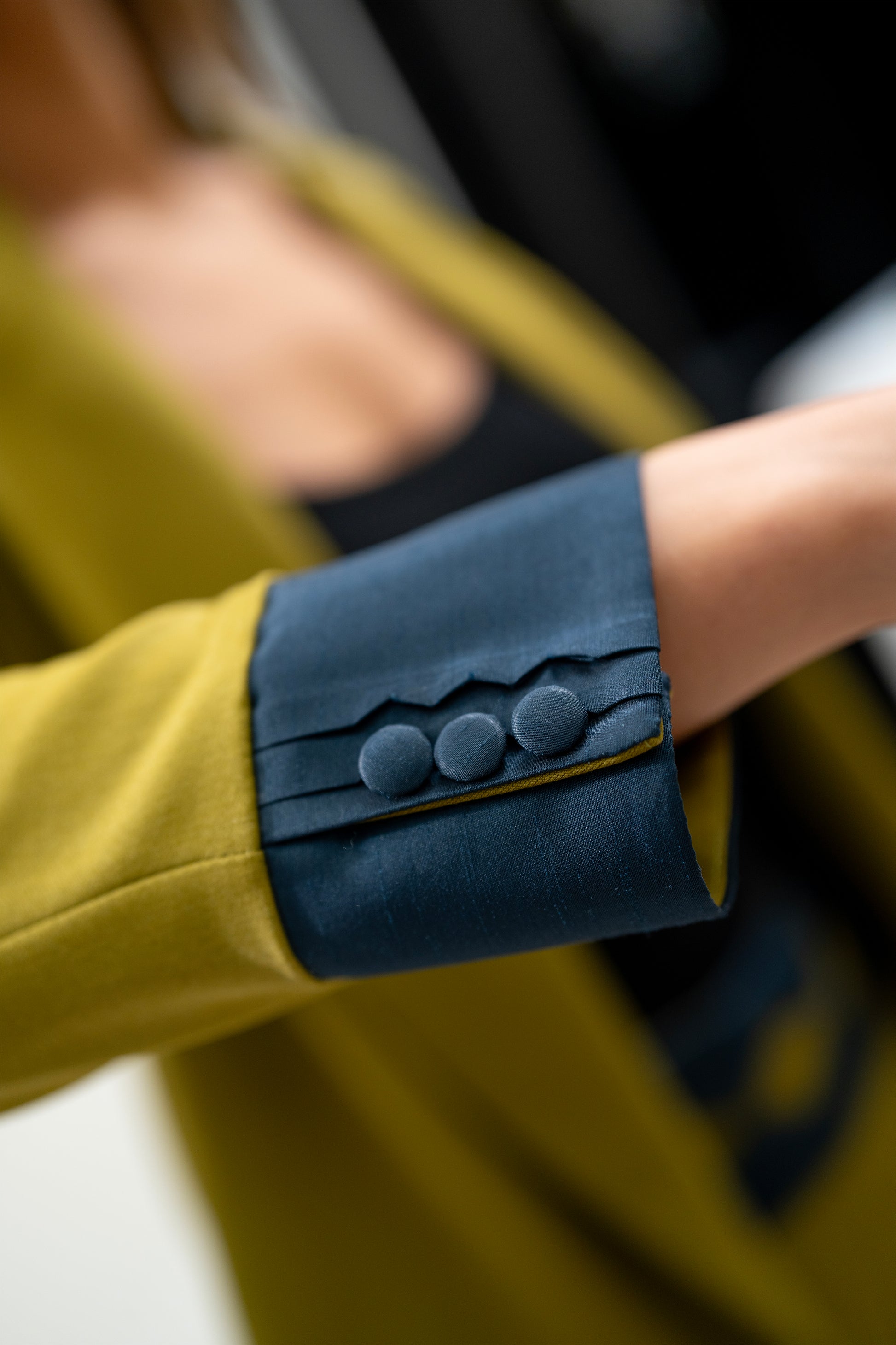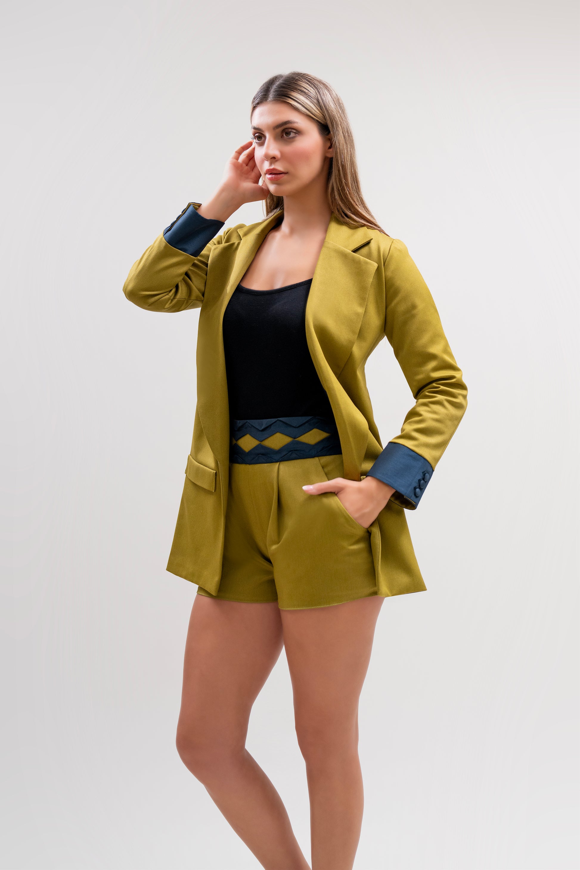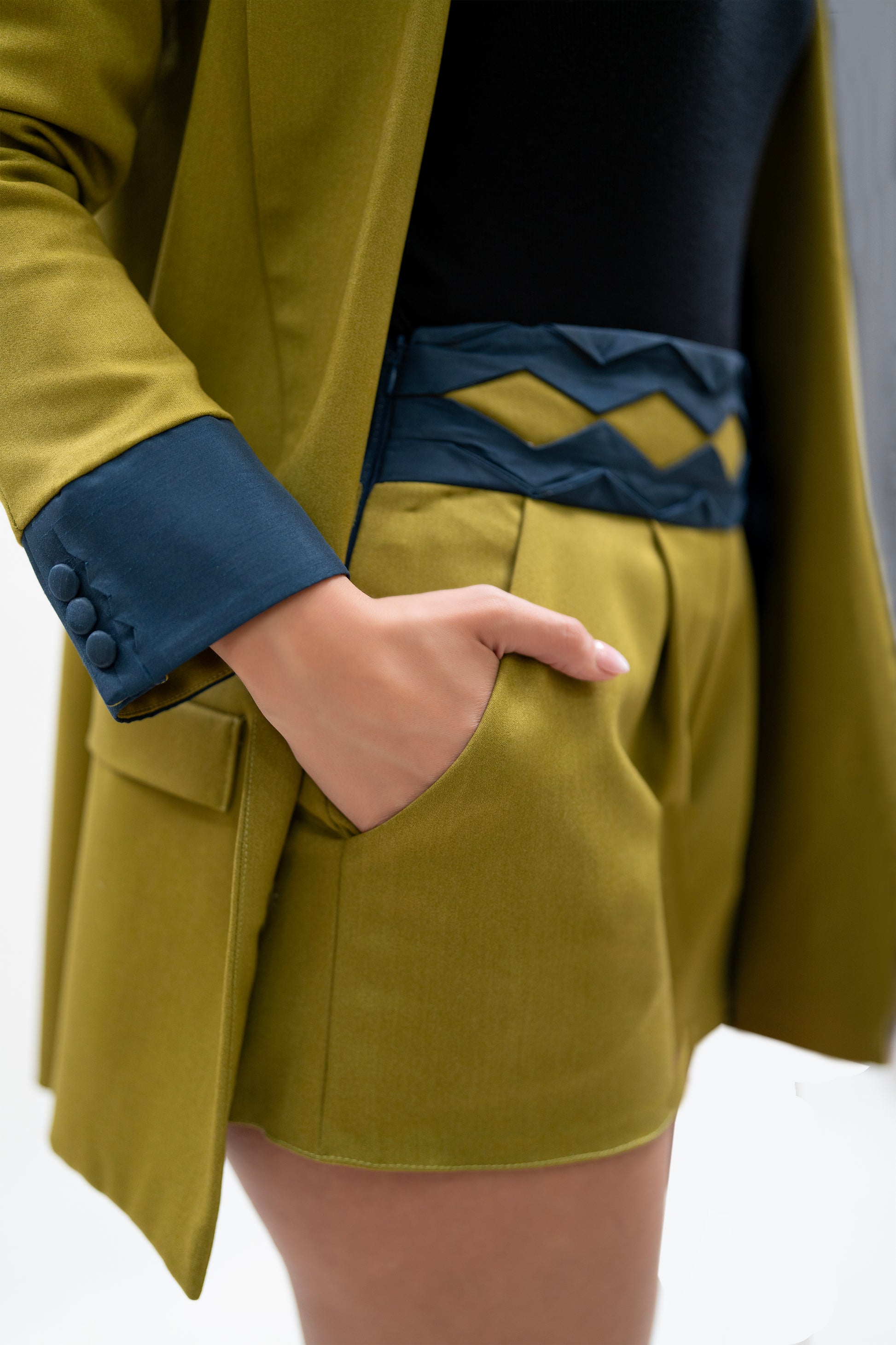 Handmade olive green blazer & shorts set with navy accents.