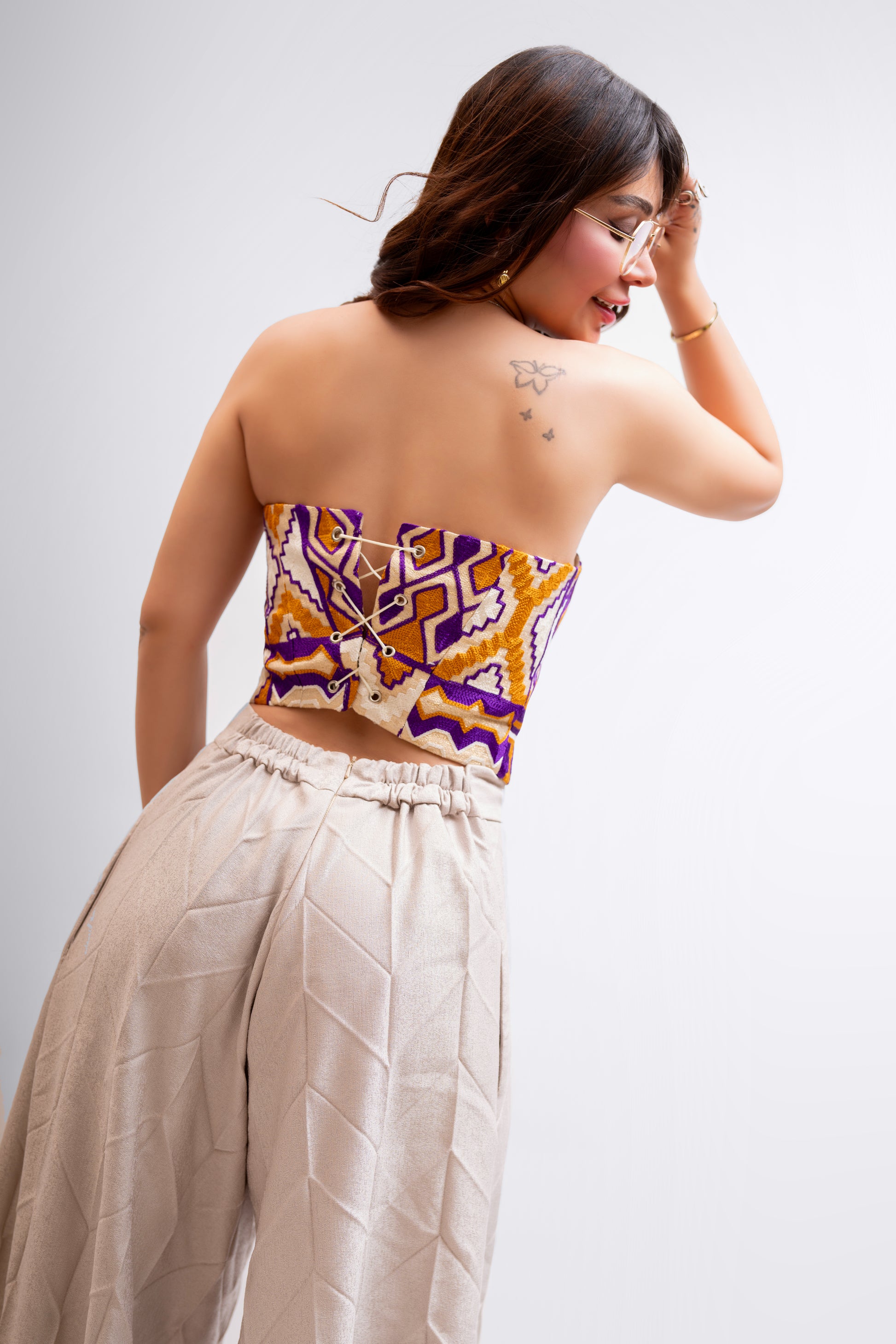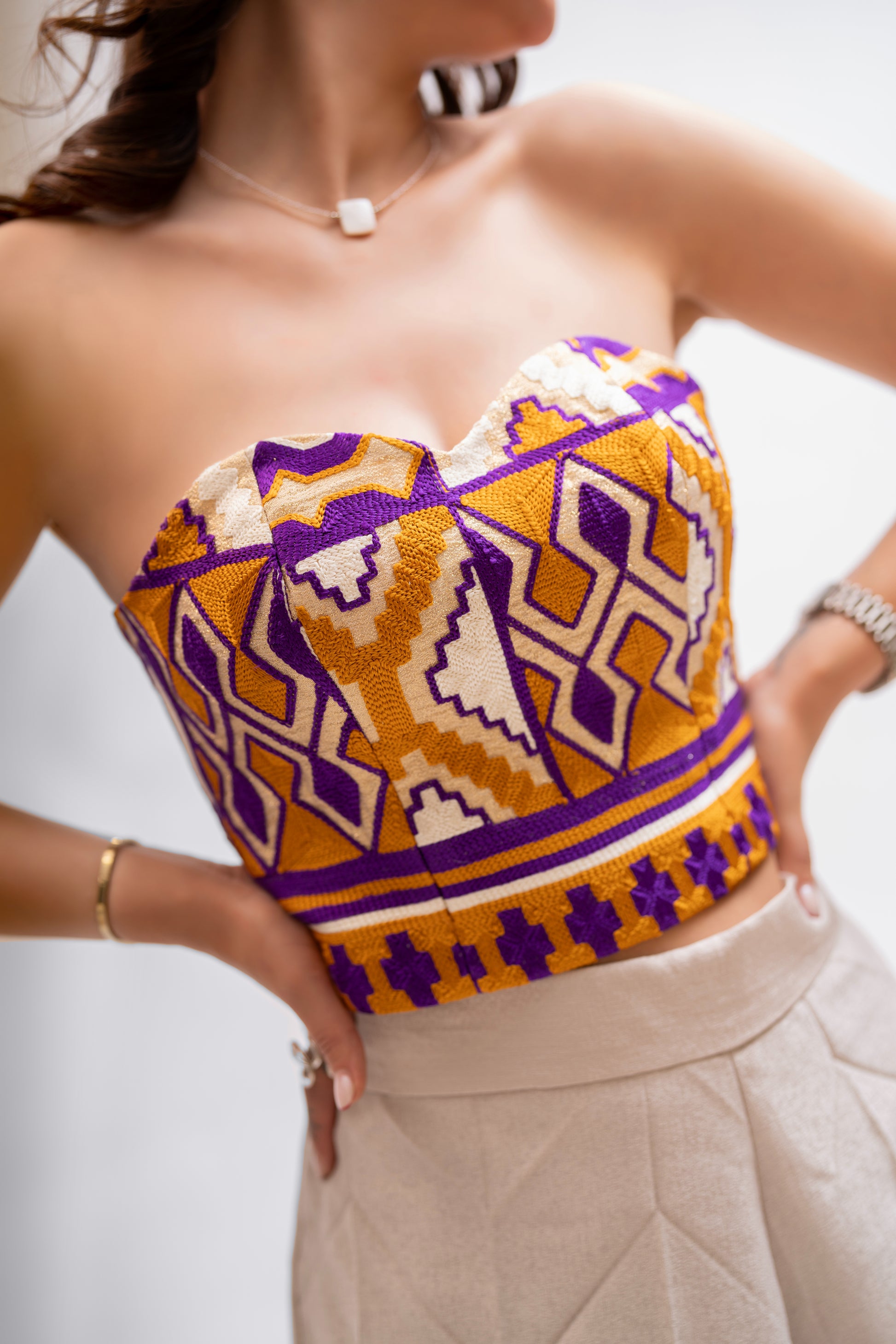 Handmade strapless top with striking yellow and purple embroidery, featuring a fitted bustier style with back lace-up detail.