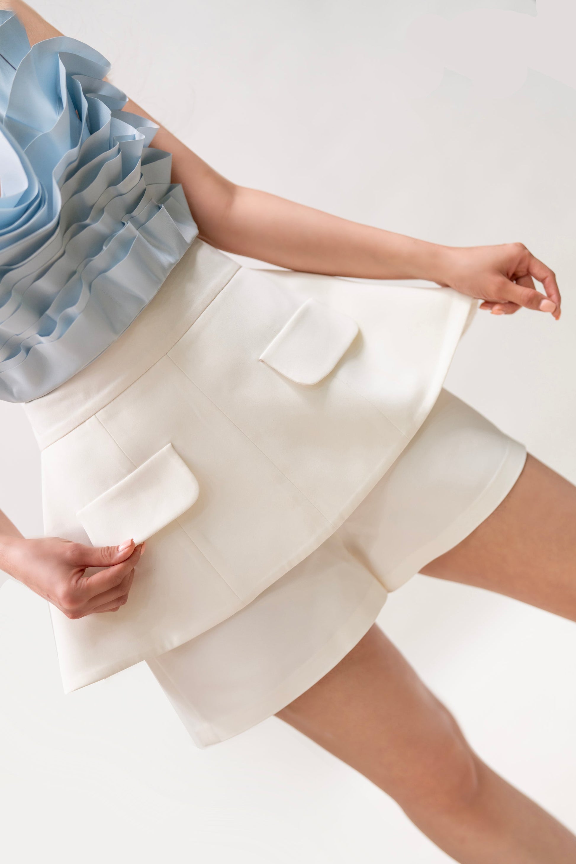 A crisp and clean skirt that balances playfulness with polish. Featuring a layered skirt silhouette over practical shorts.