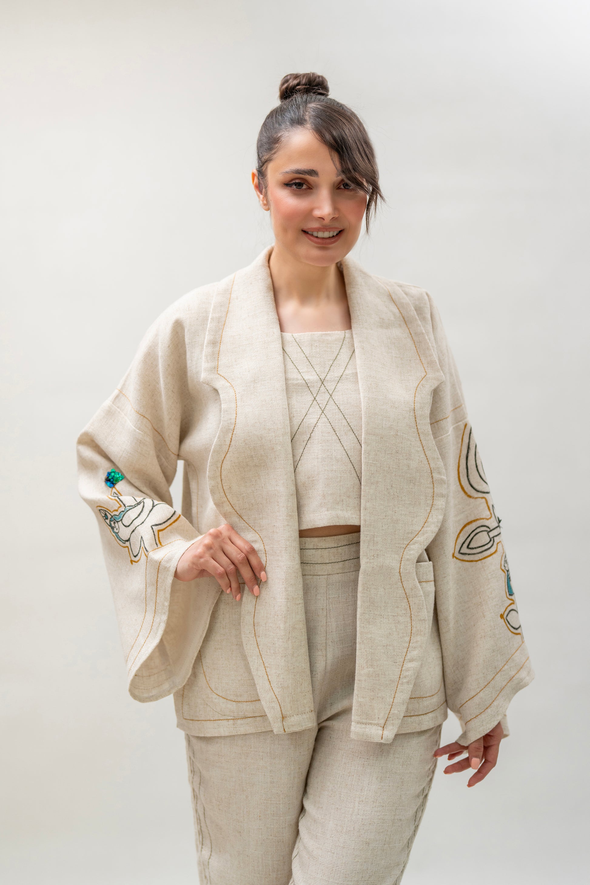 This artistic linen blazer features a relaxed-fit blazer with hand-painted bird designs on the sleeves. Breathable, bold, and beautiful.