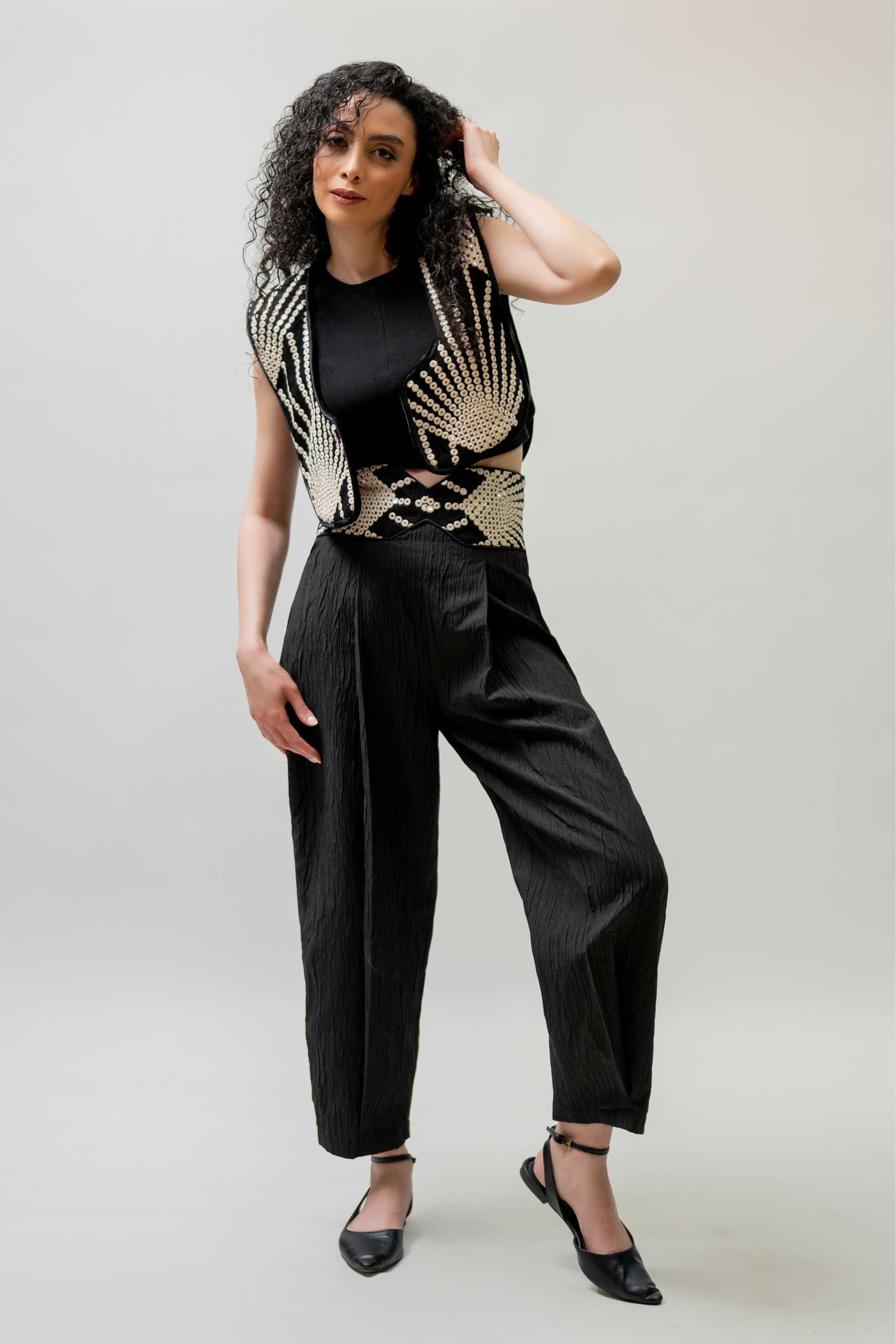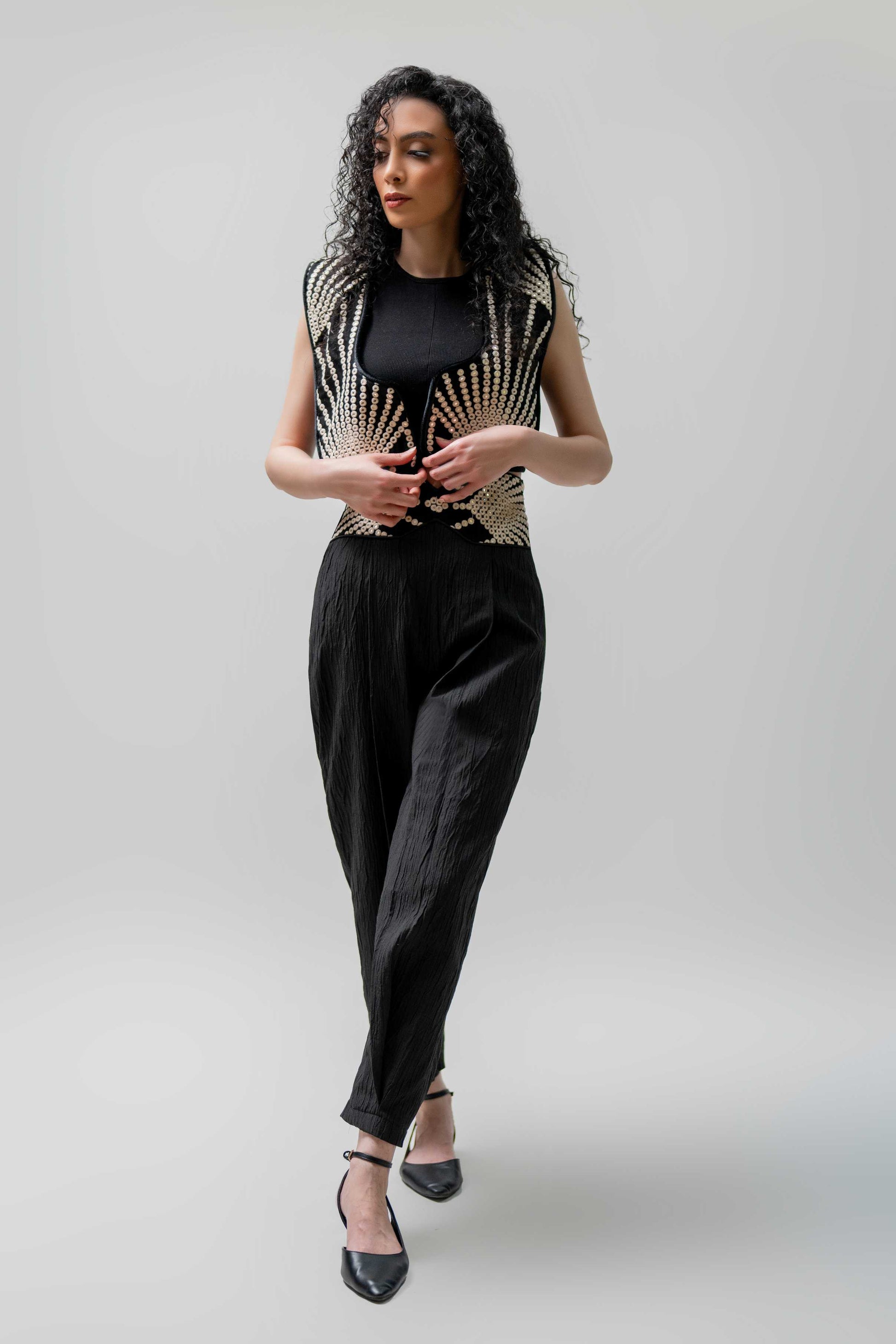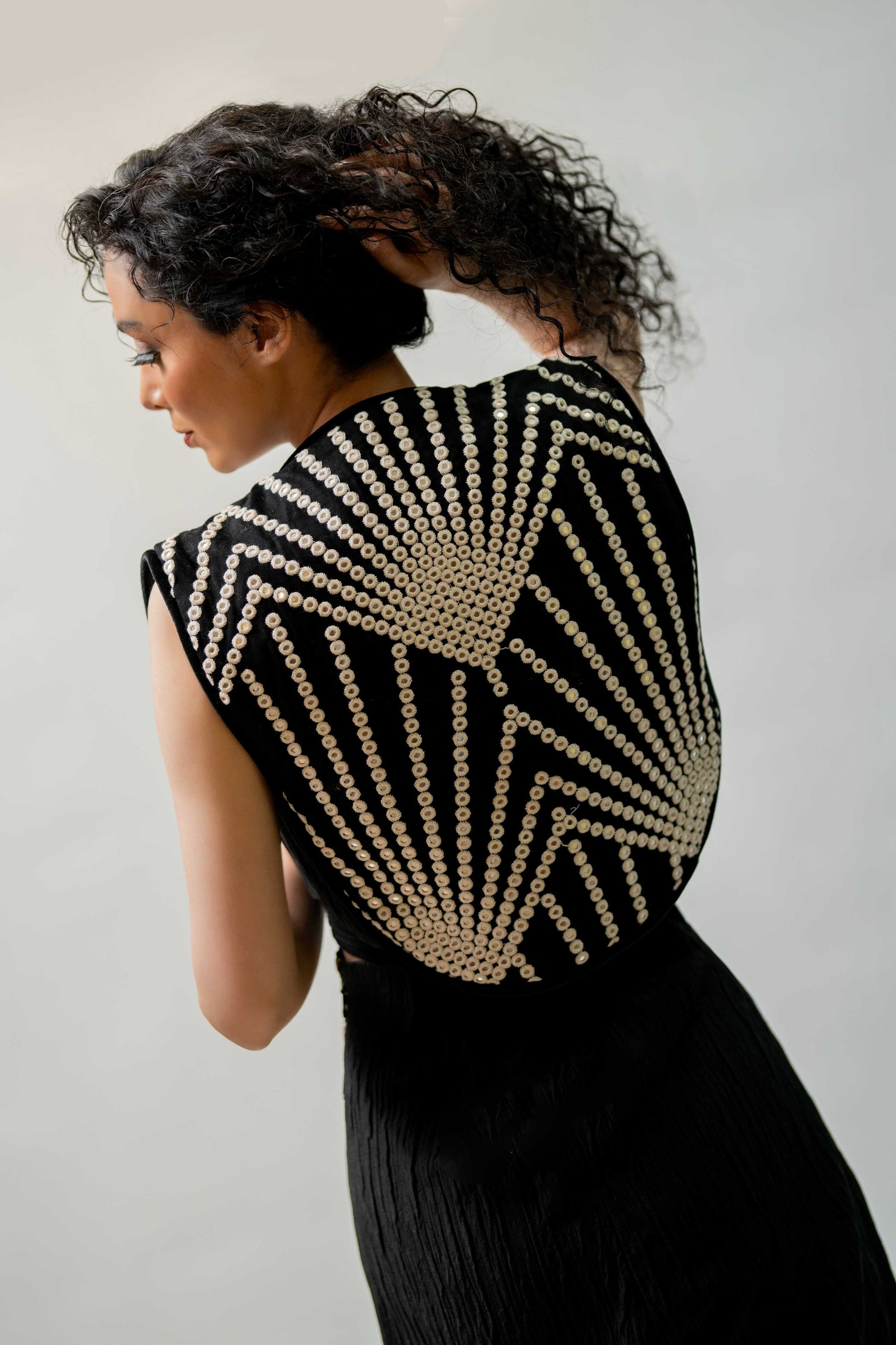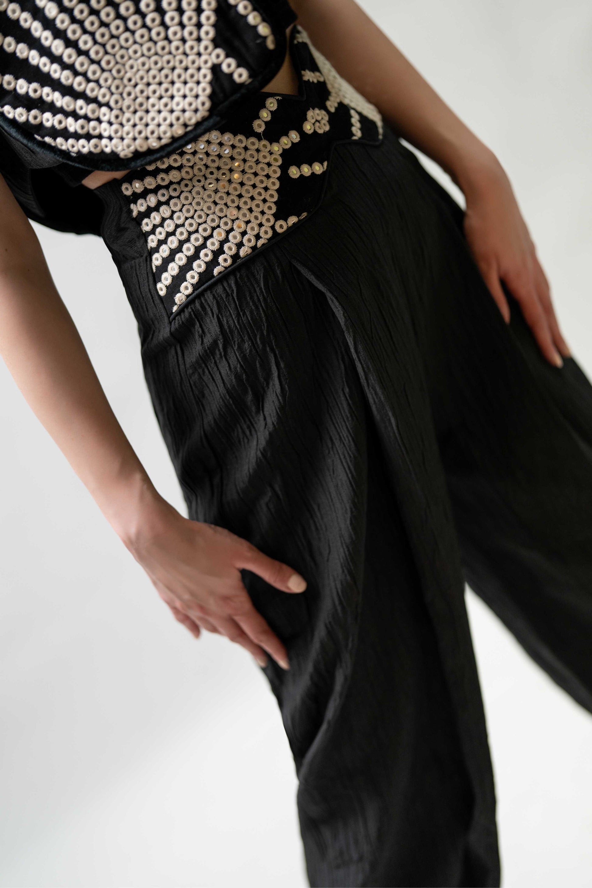 Striking black set with shimmering pearl embroidery and a sculpted waist. Bold, modern, unforgettable.