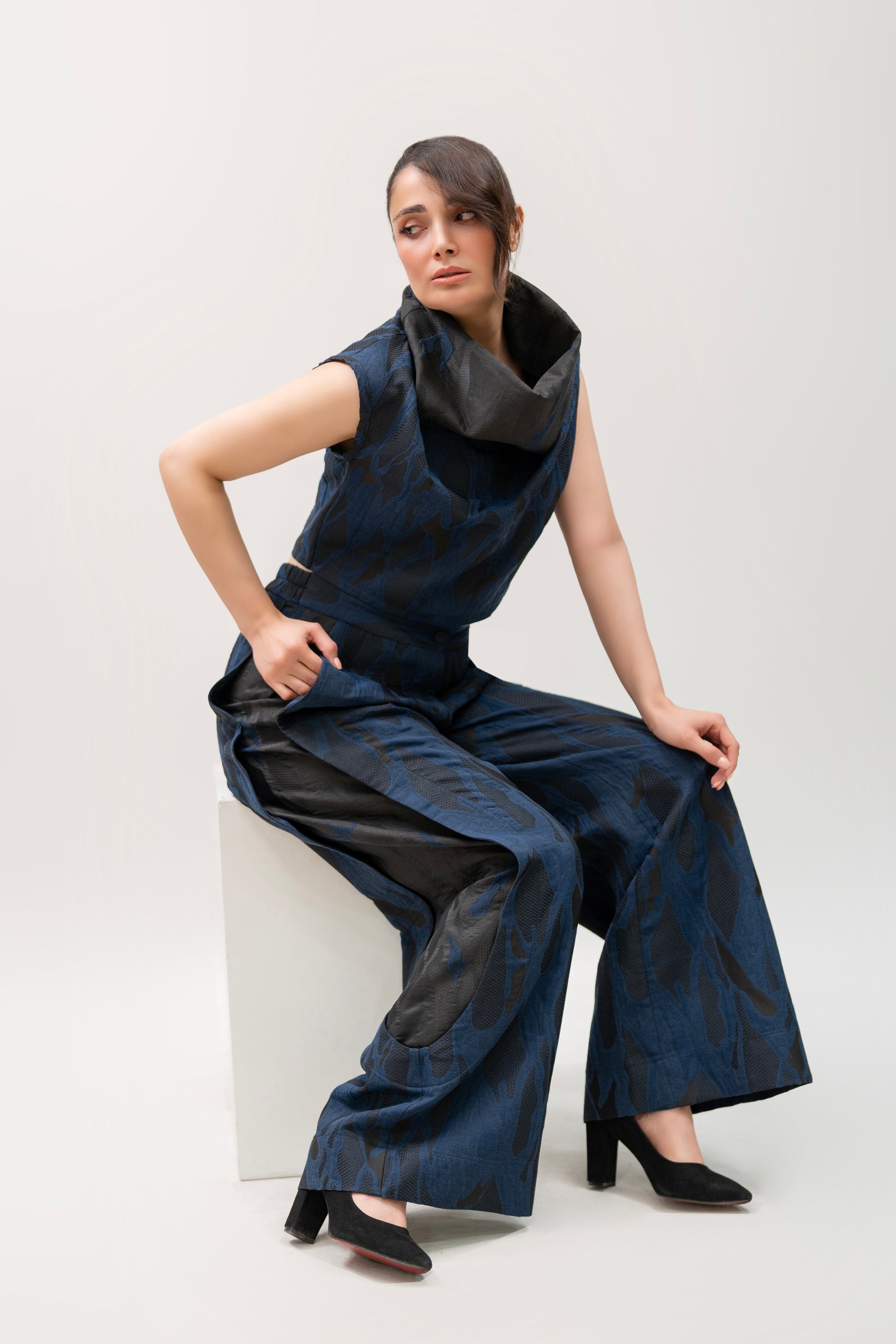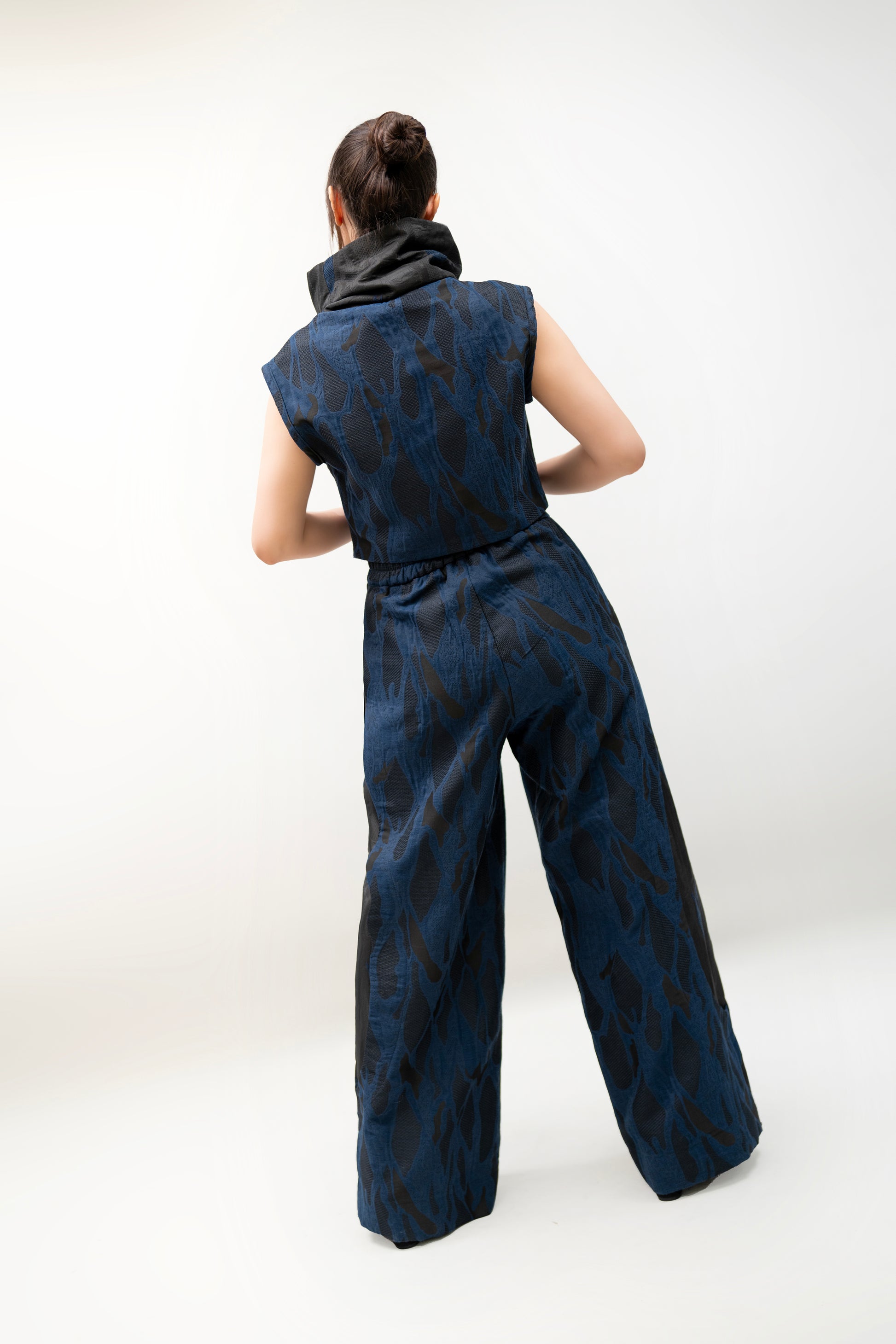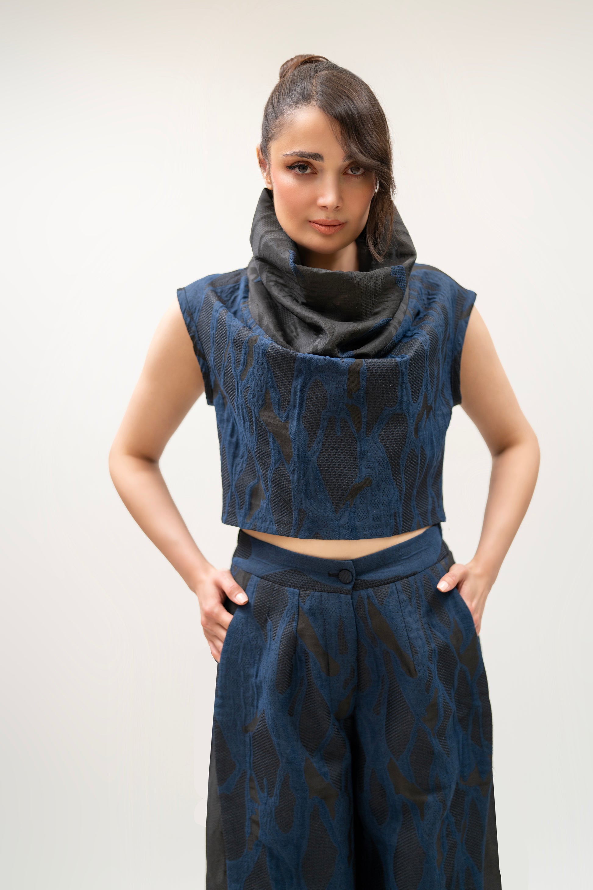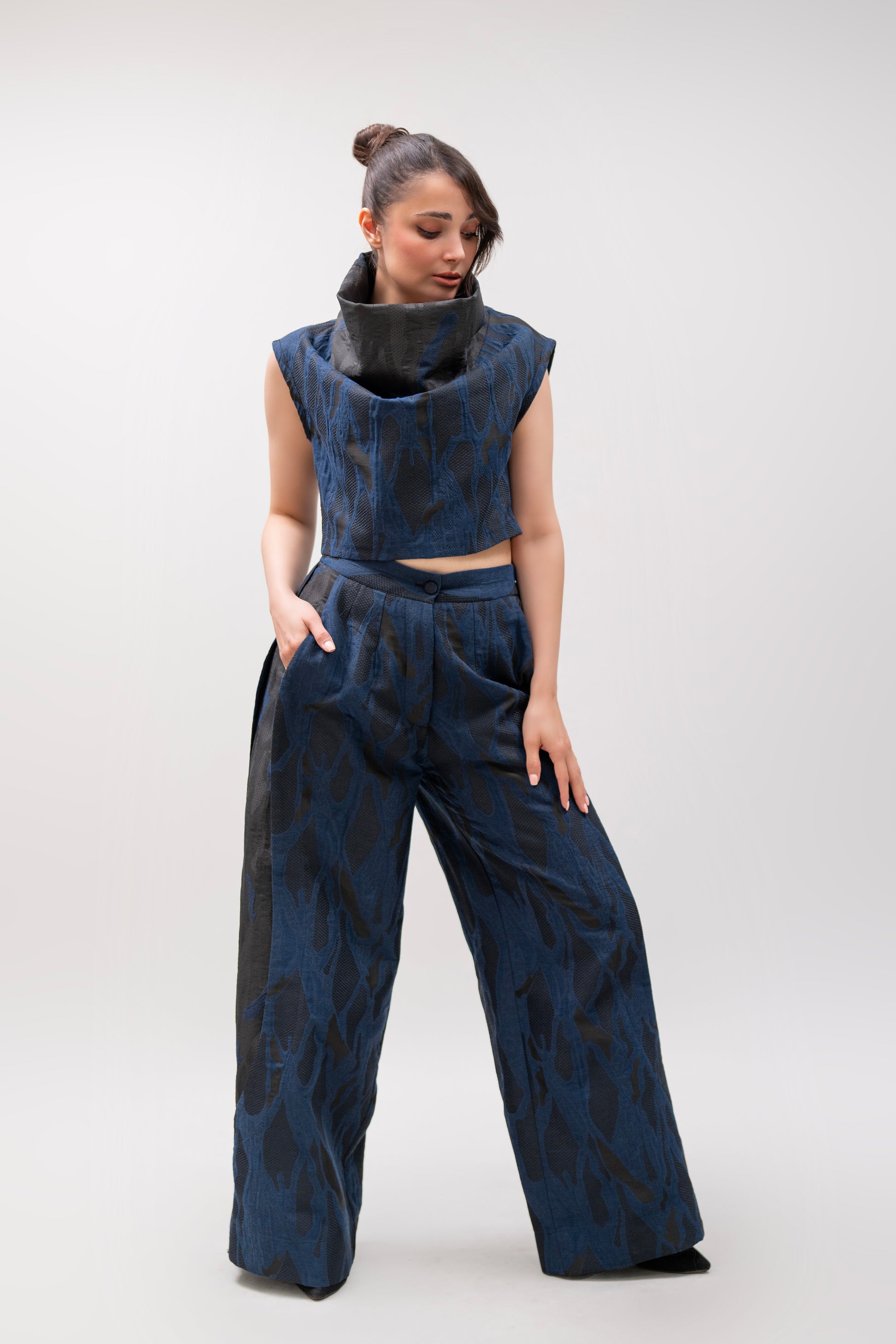 A modern two-piece set featuring a sculpted cowl-neck crop top and wide-leg pants with bold black contrast panels. Textured jacquard fabric in deep navy adds structure and elegance.