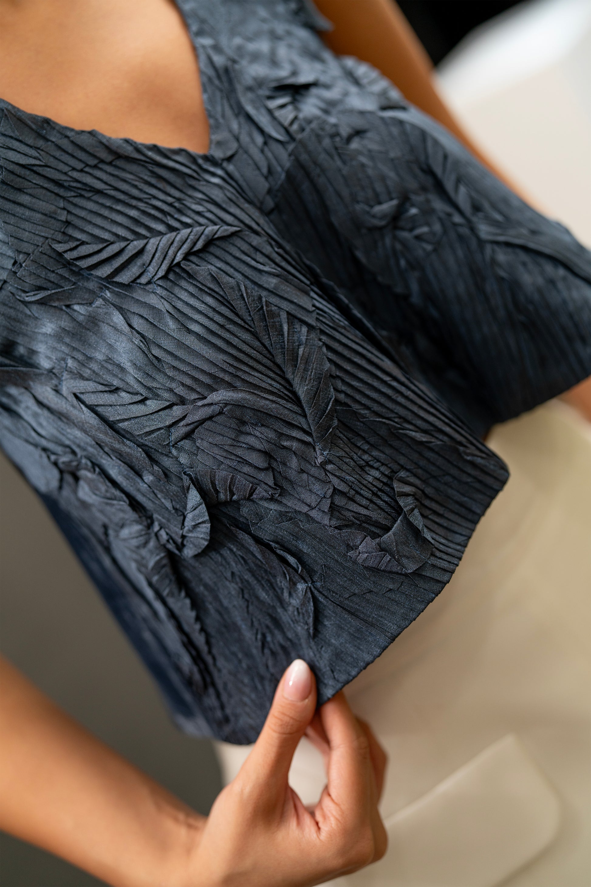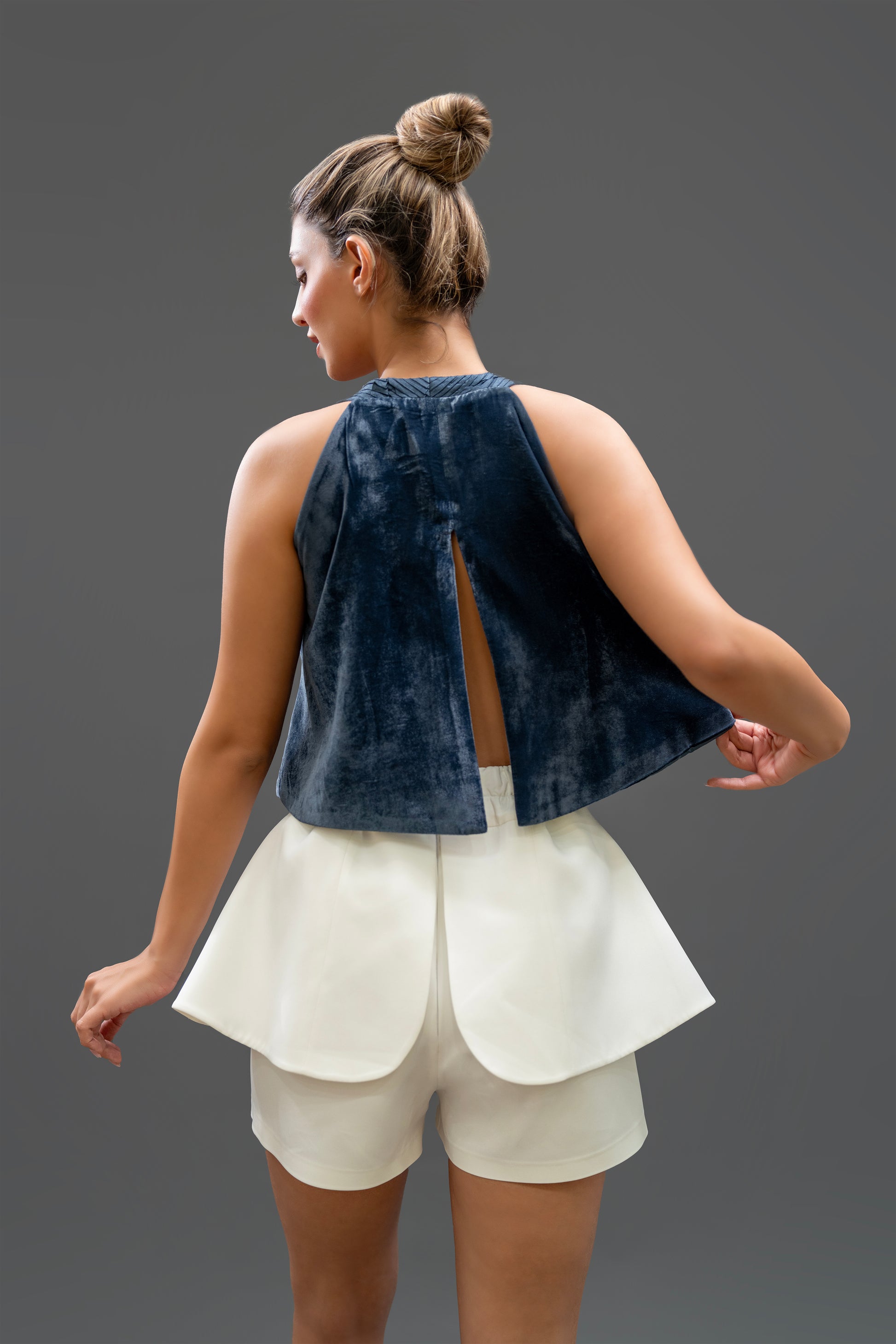 Handmade navy sleeveless top with textured fabric and open-back slit.