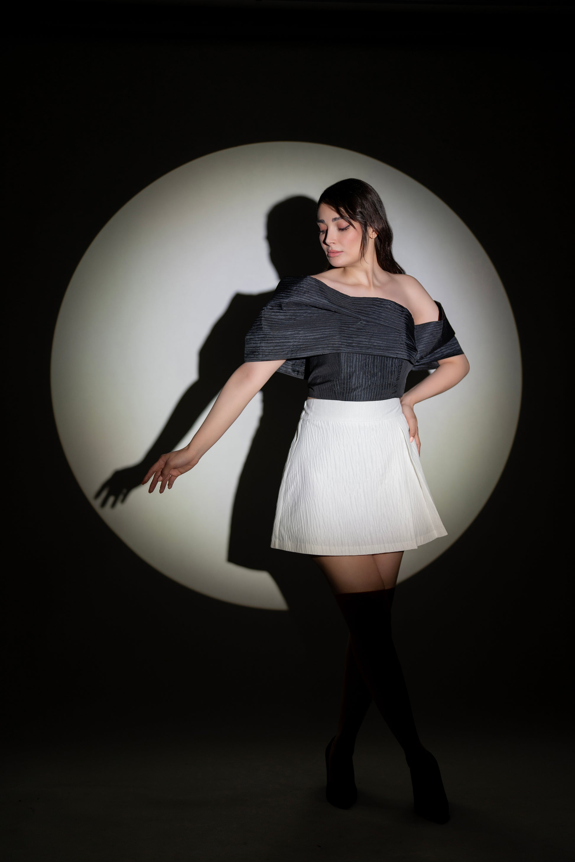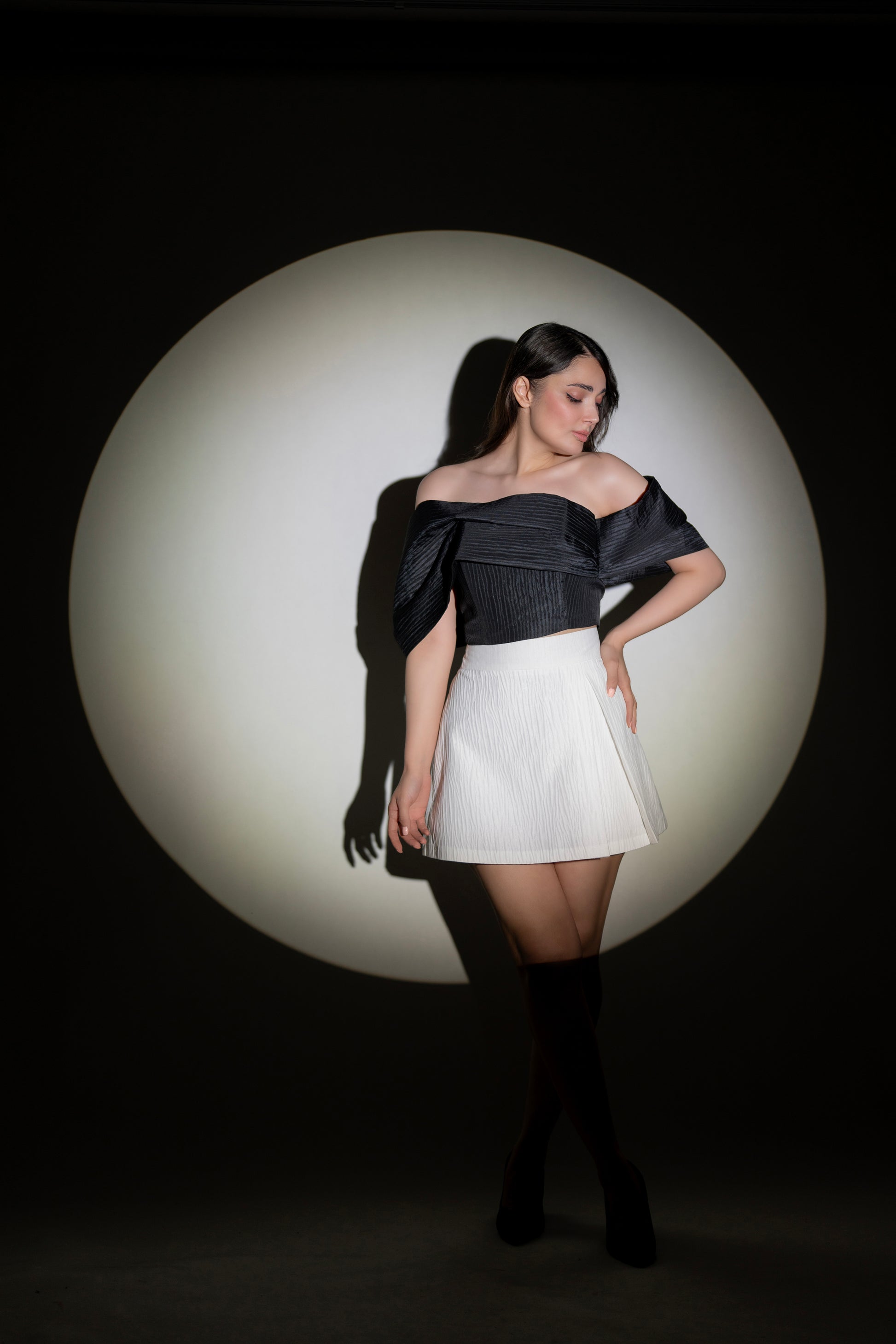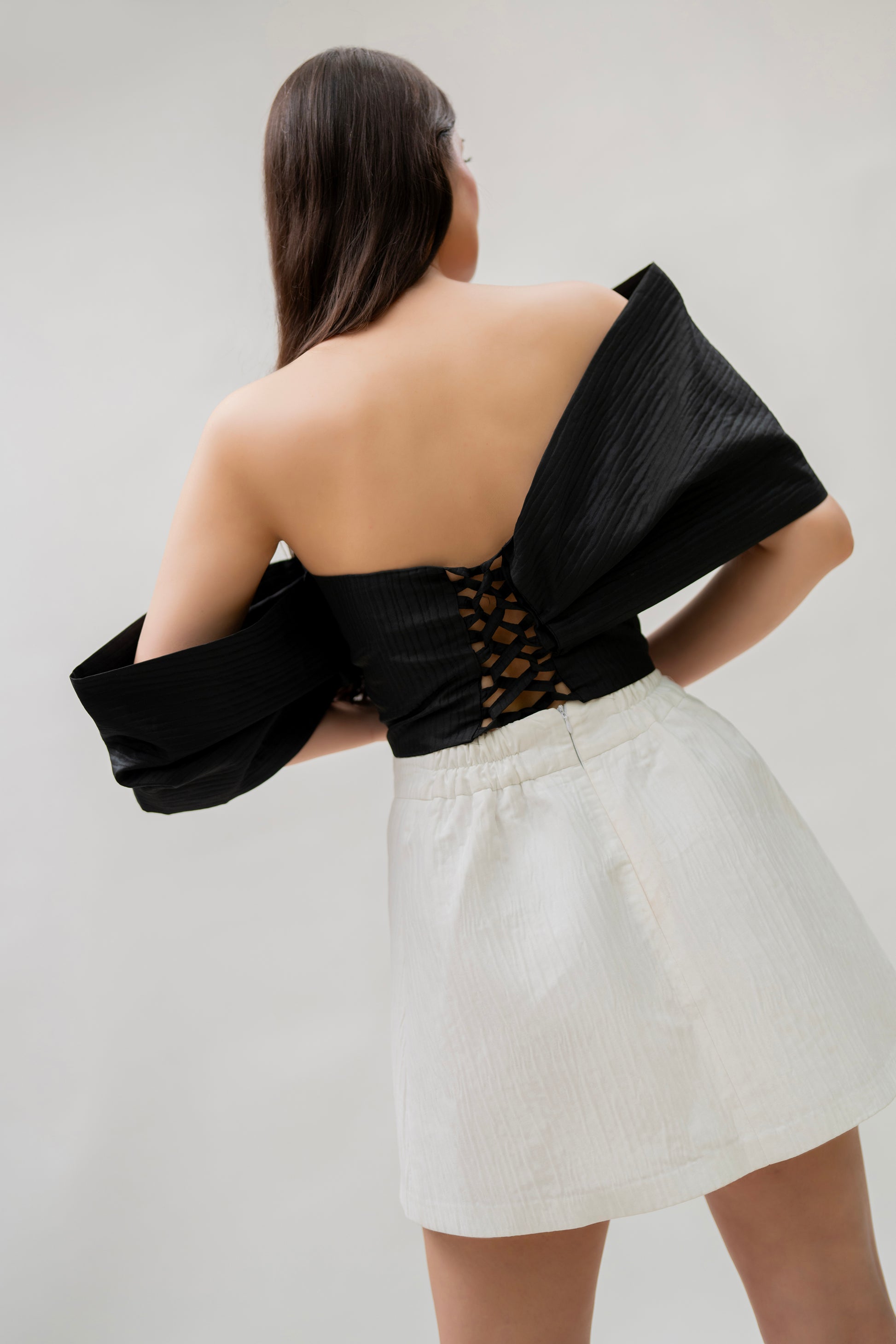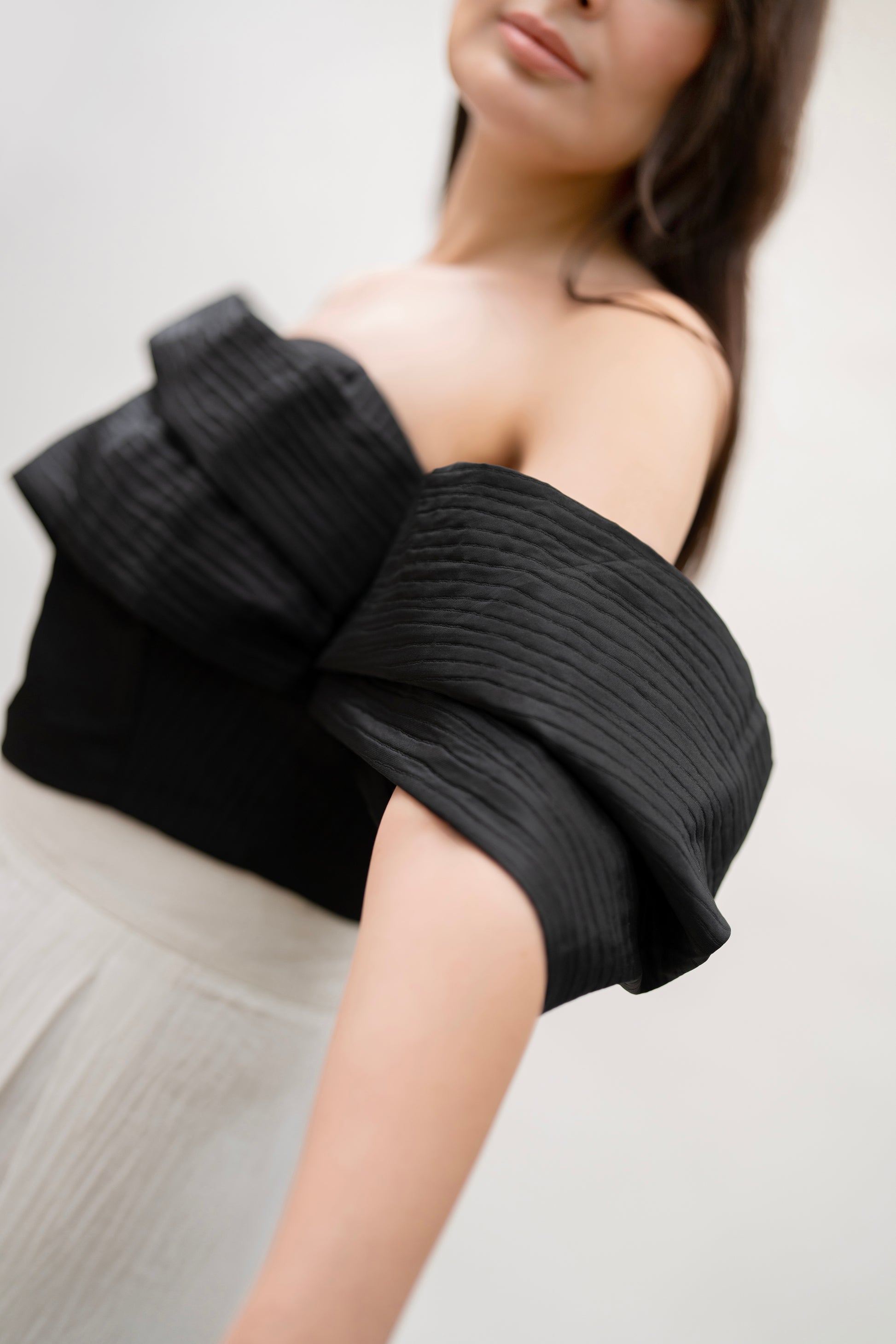Make a bold statement with this structured off-shoulder black top featuring dramatic sculpted folds and a lace-up back. Handmade and designed to fit EU sizes 36–38, it’s the perfect mix of elegance and edge for evening looks.