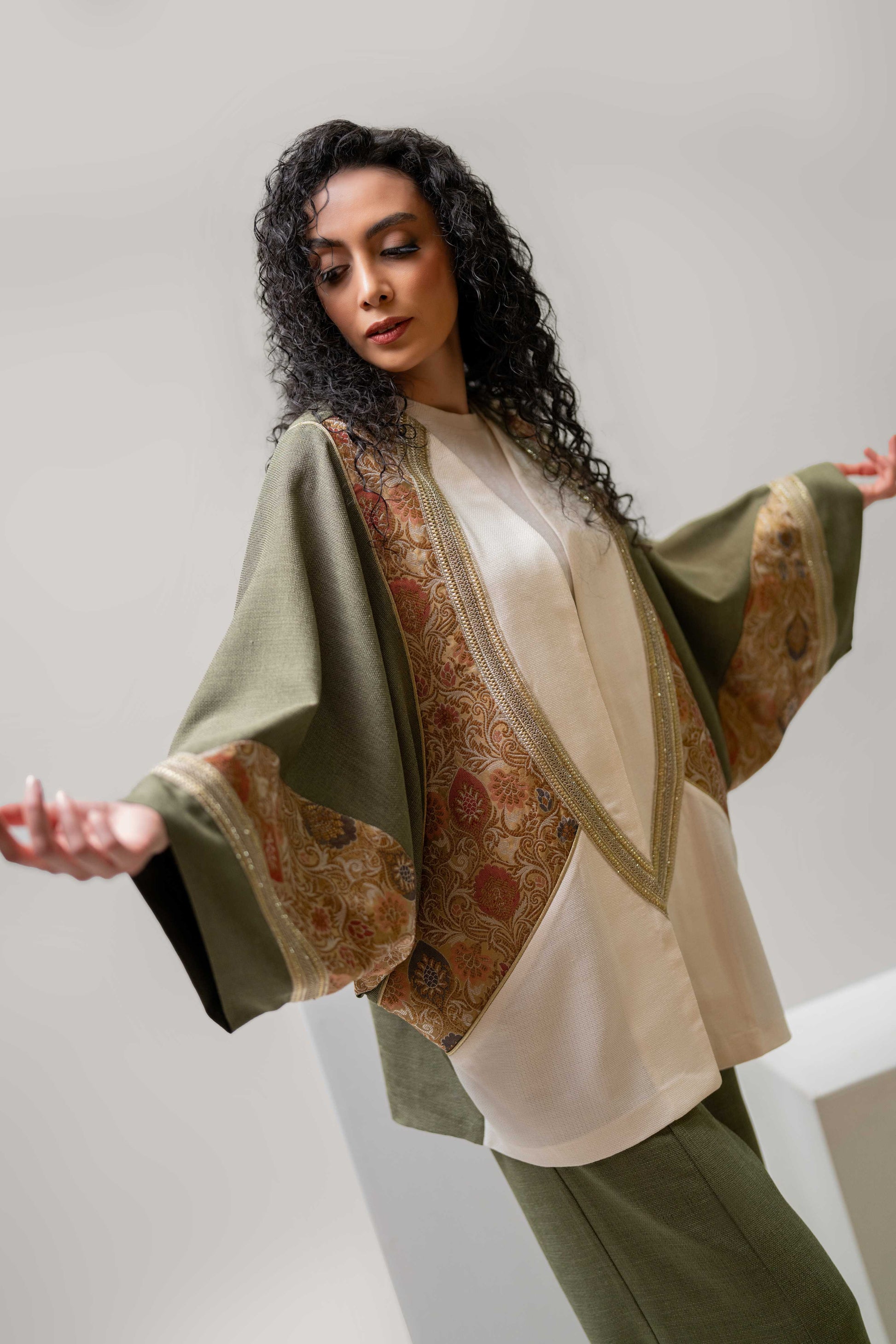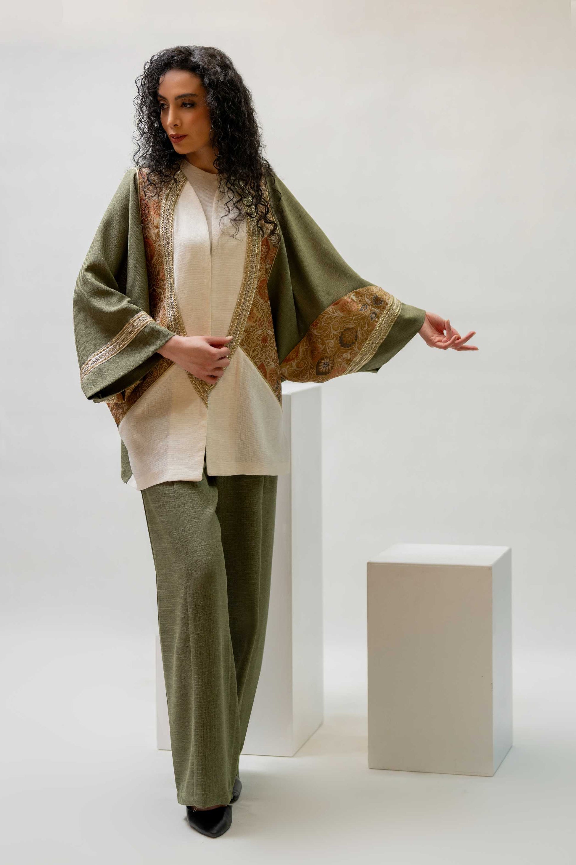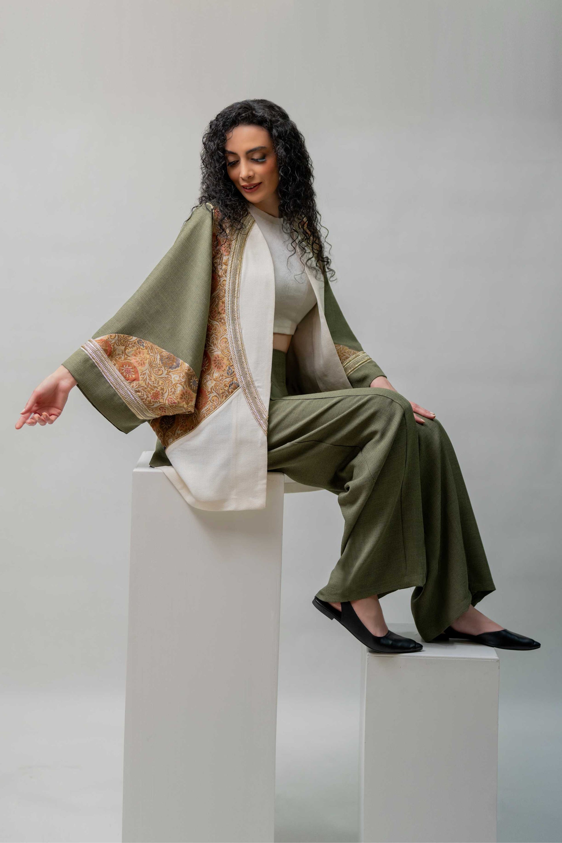 Two-piece set features a flowing olive-green kimono jacket with intricate paisley trim, paired with matching high-waist wide-leg pants.
