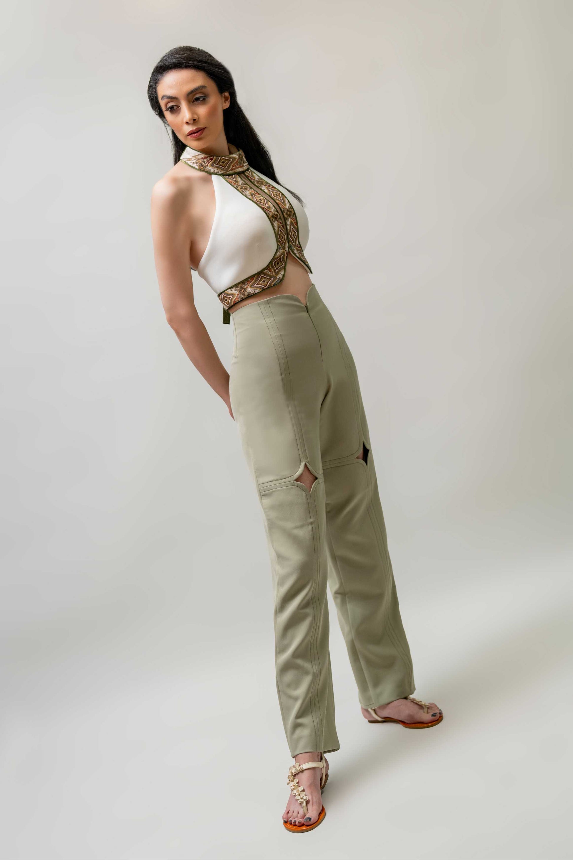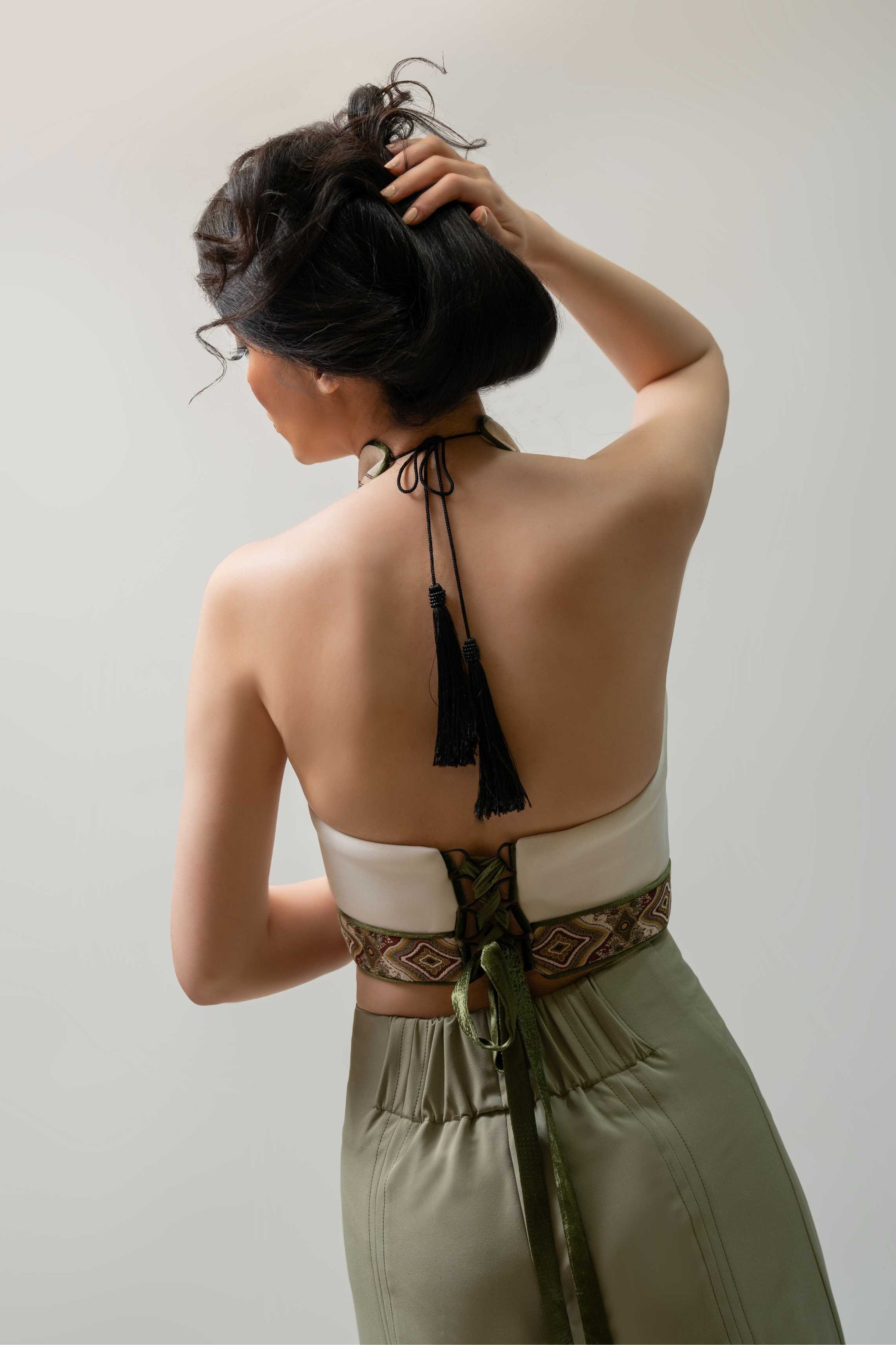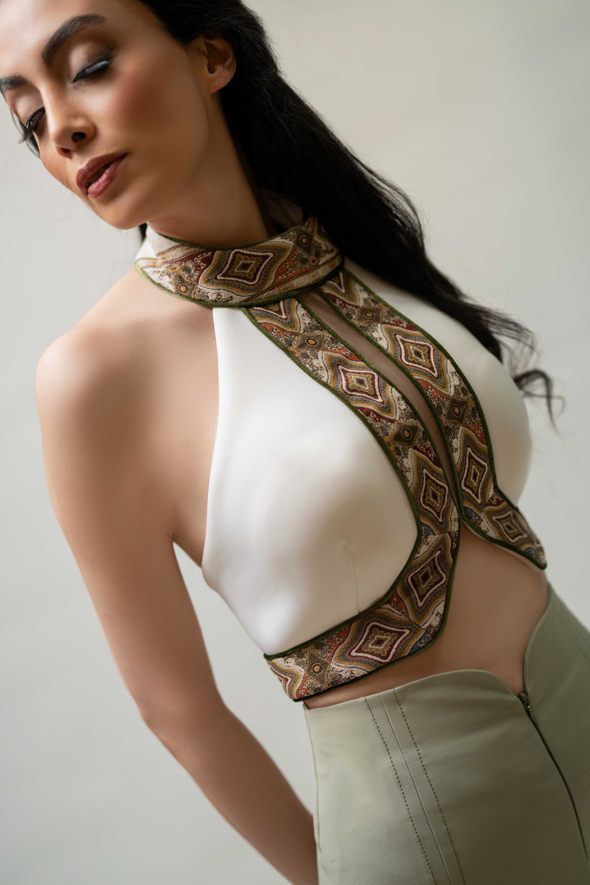 A vibrant crop top with red floral embroidery and an adjustable lace-up back. Bold and elegant.