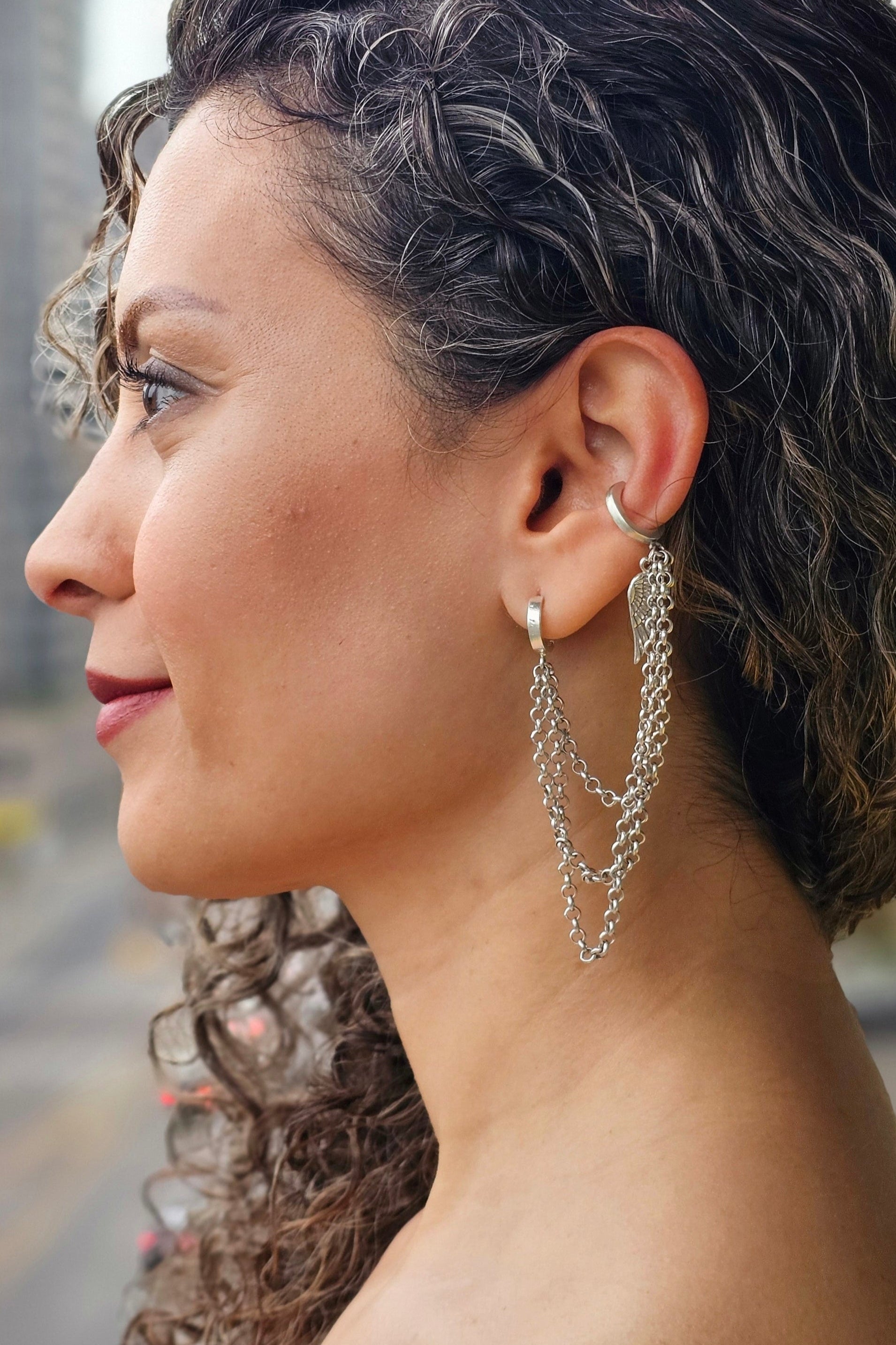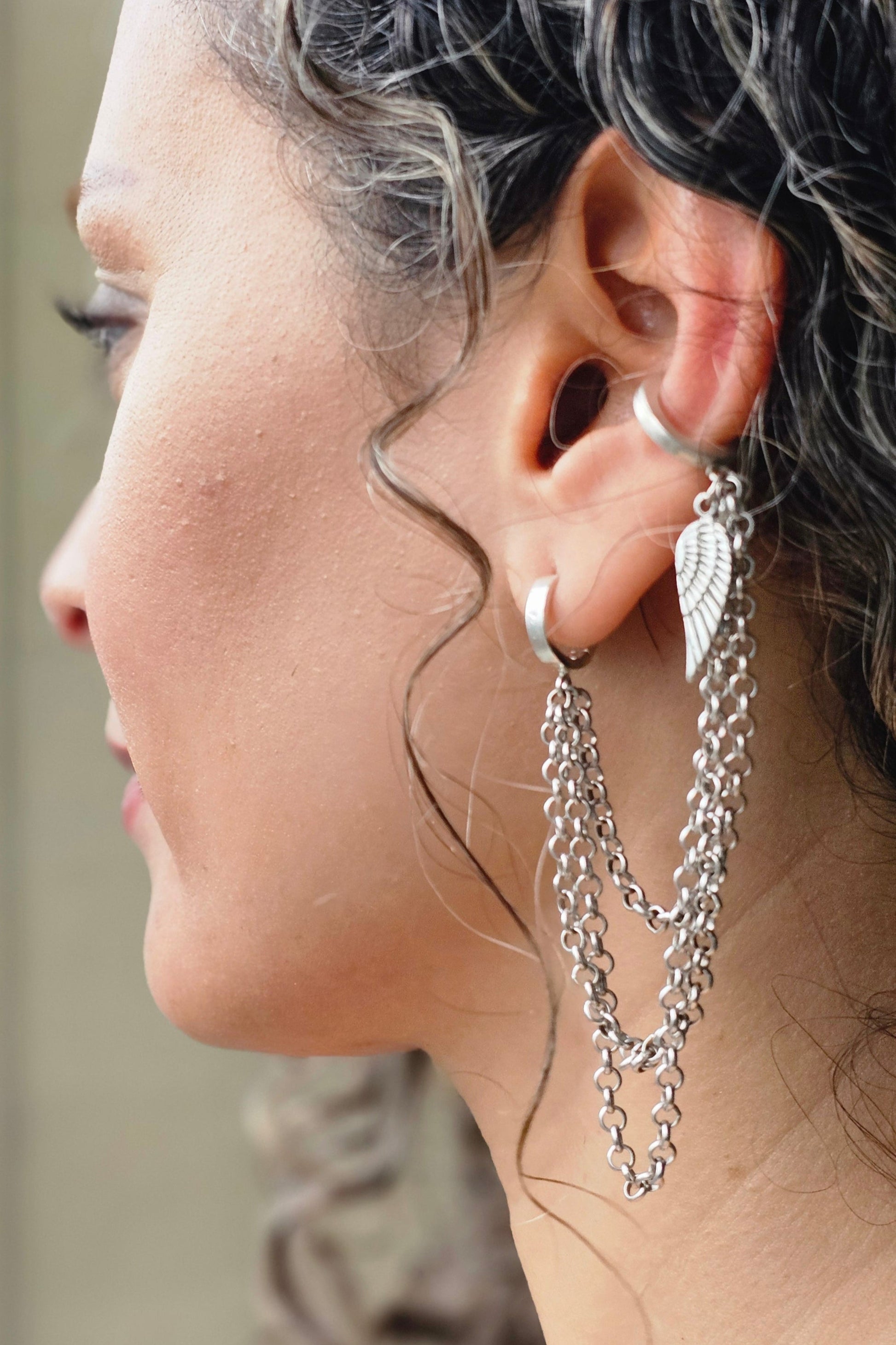 A striking silver ear cuff earring featuring layered chains and a delicate leaf charm, designed for a bold, boho-chic look with no piercing required.