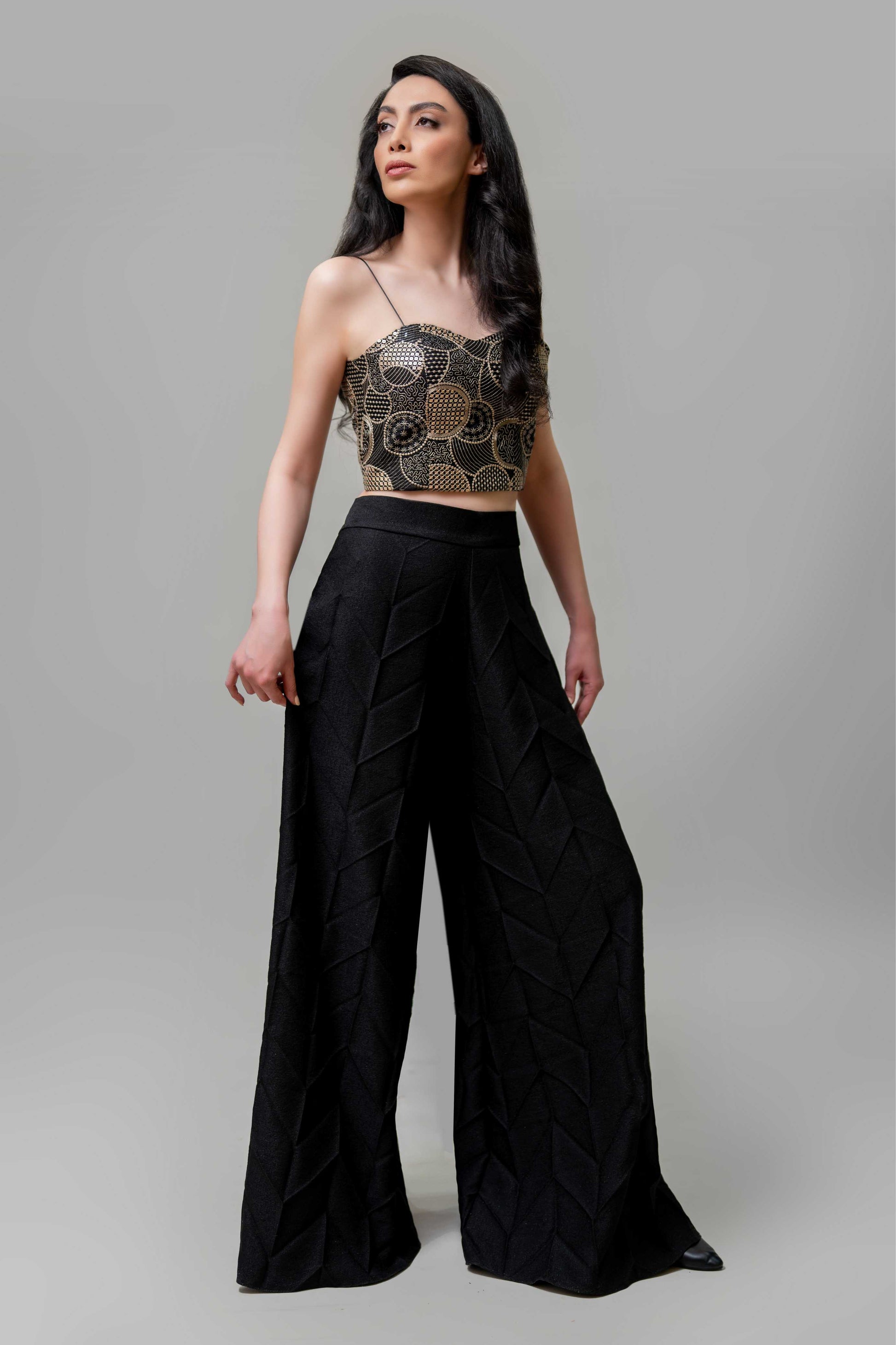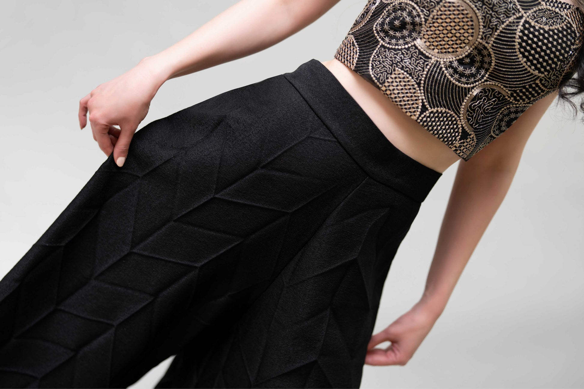 Statement high-waisted pants with geometric texture. Flowy, flattering, and made to move.