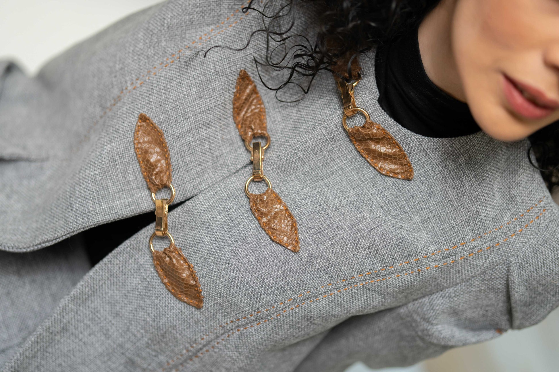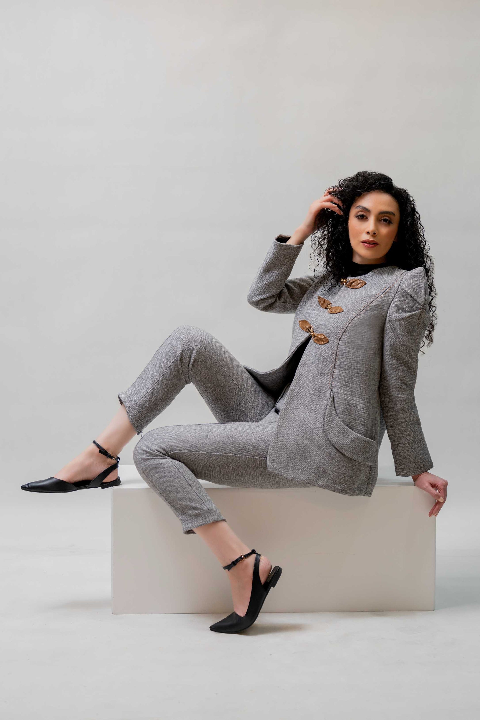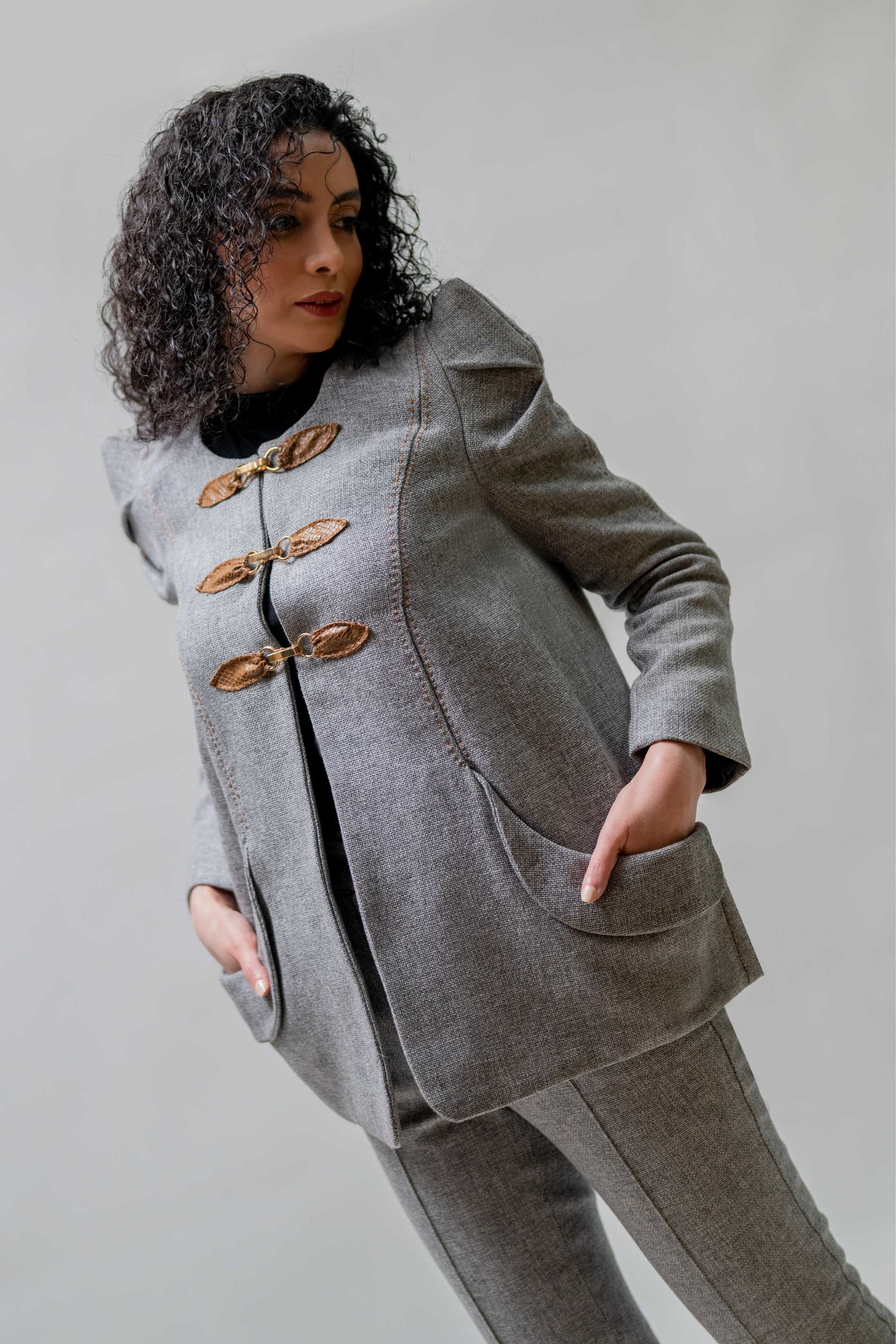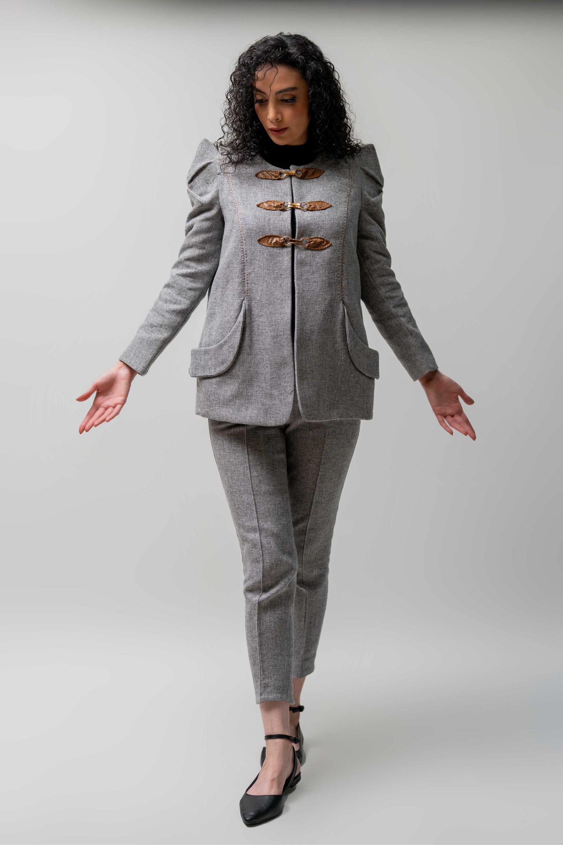 Structured elegance in a gray tweed jacket and pant set with luxe brown clasp details. Perfectly tailored for a bold, modern silhouette.
