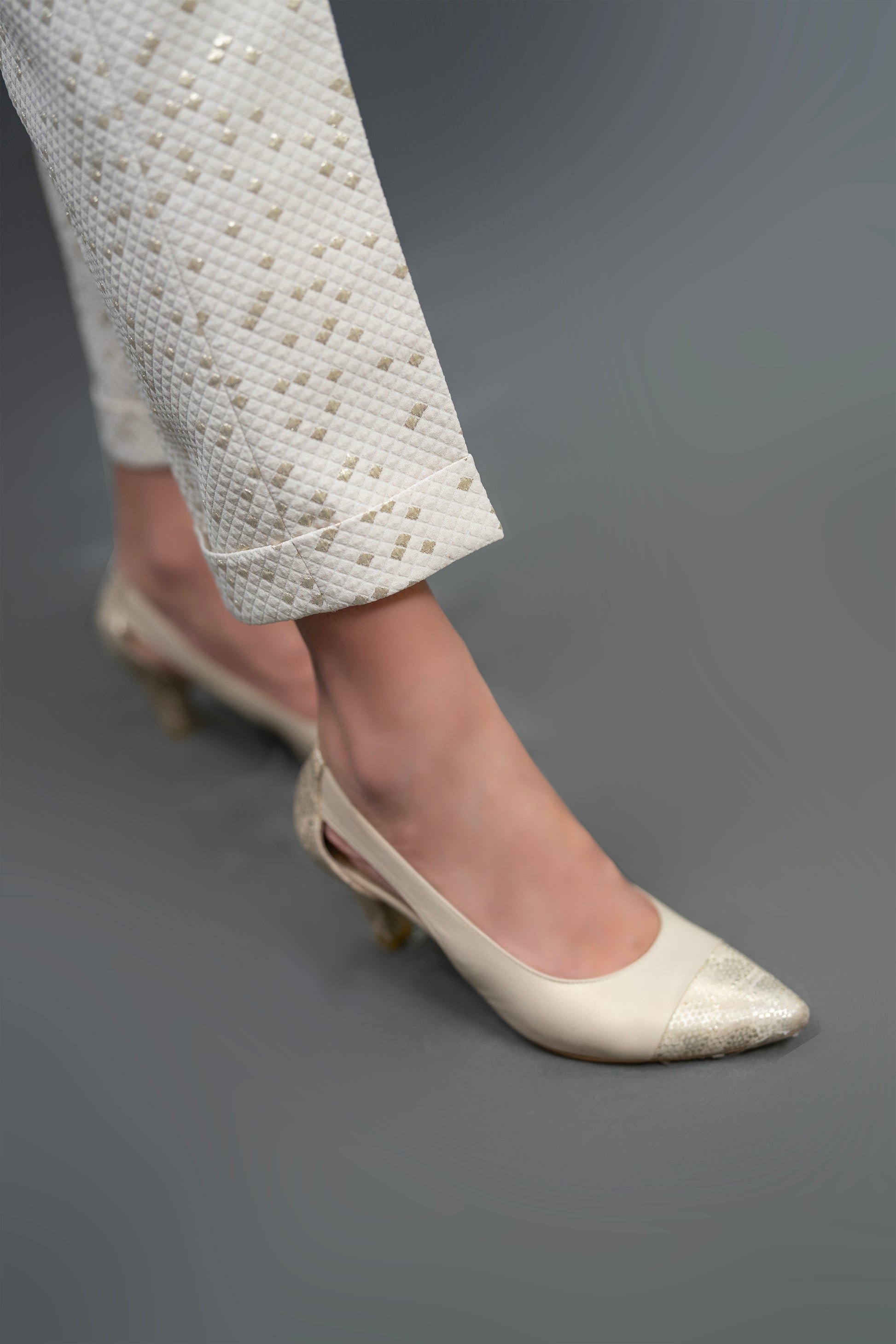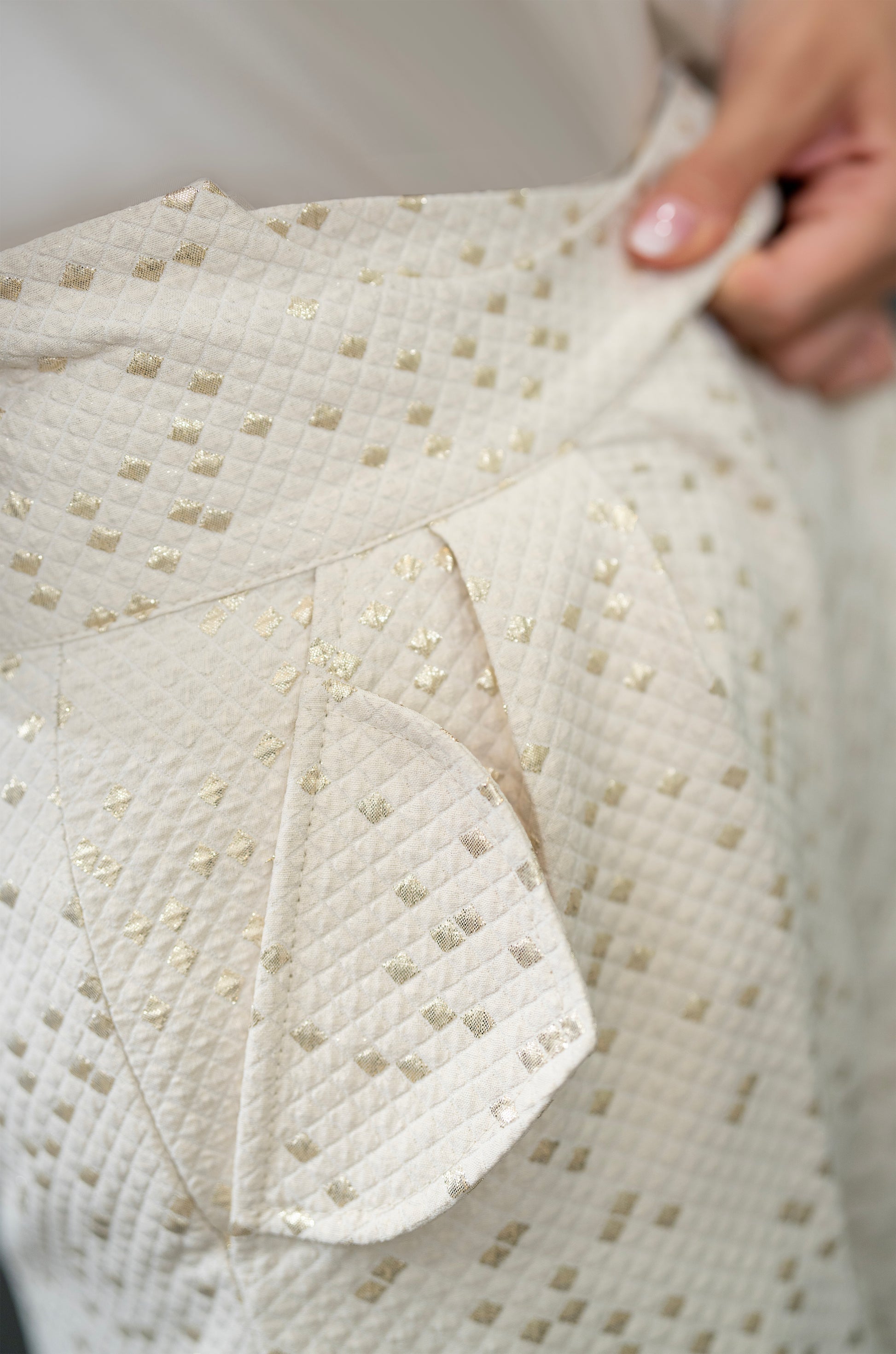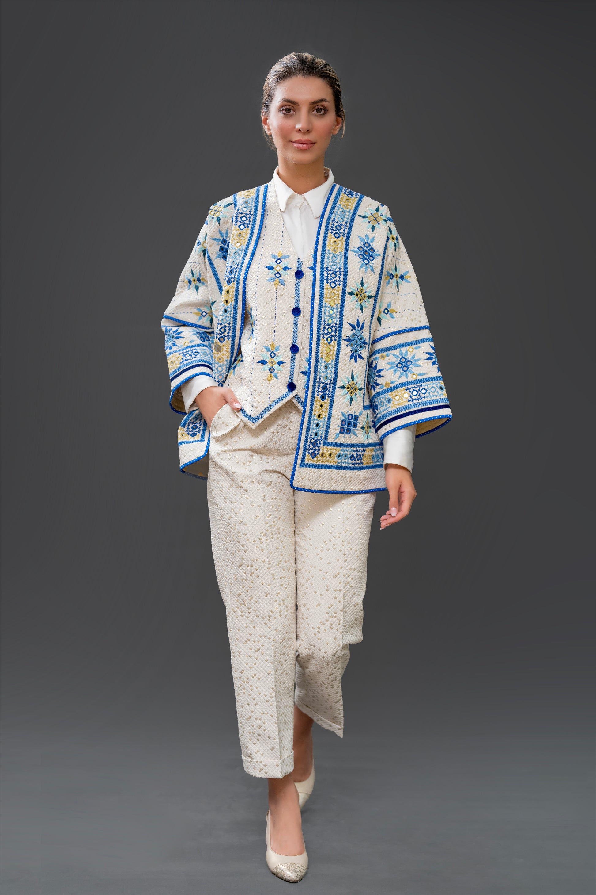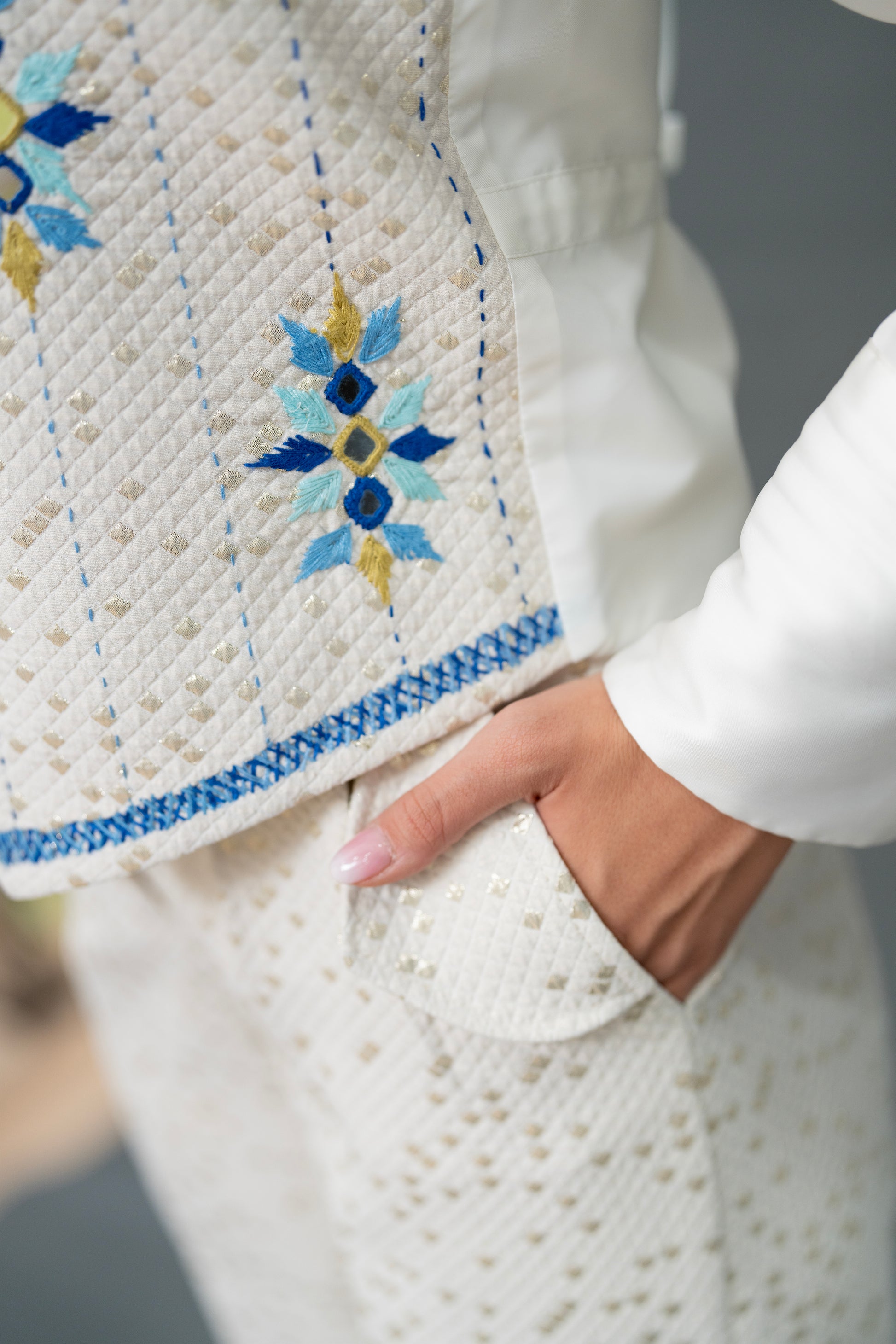 Elegant handmade three-piece set featuring a white textured fabric adorned with intricate blue and gold embroidery. Includes tailored pants, a fitted vest, and a matching open-front jacket.