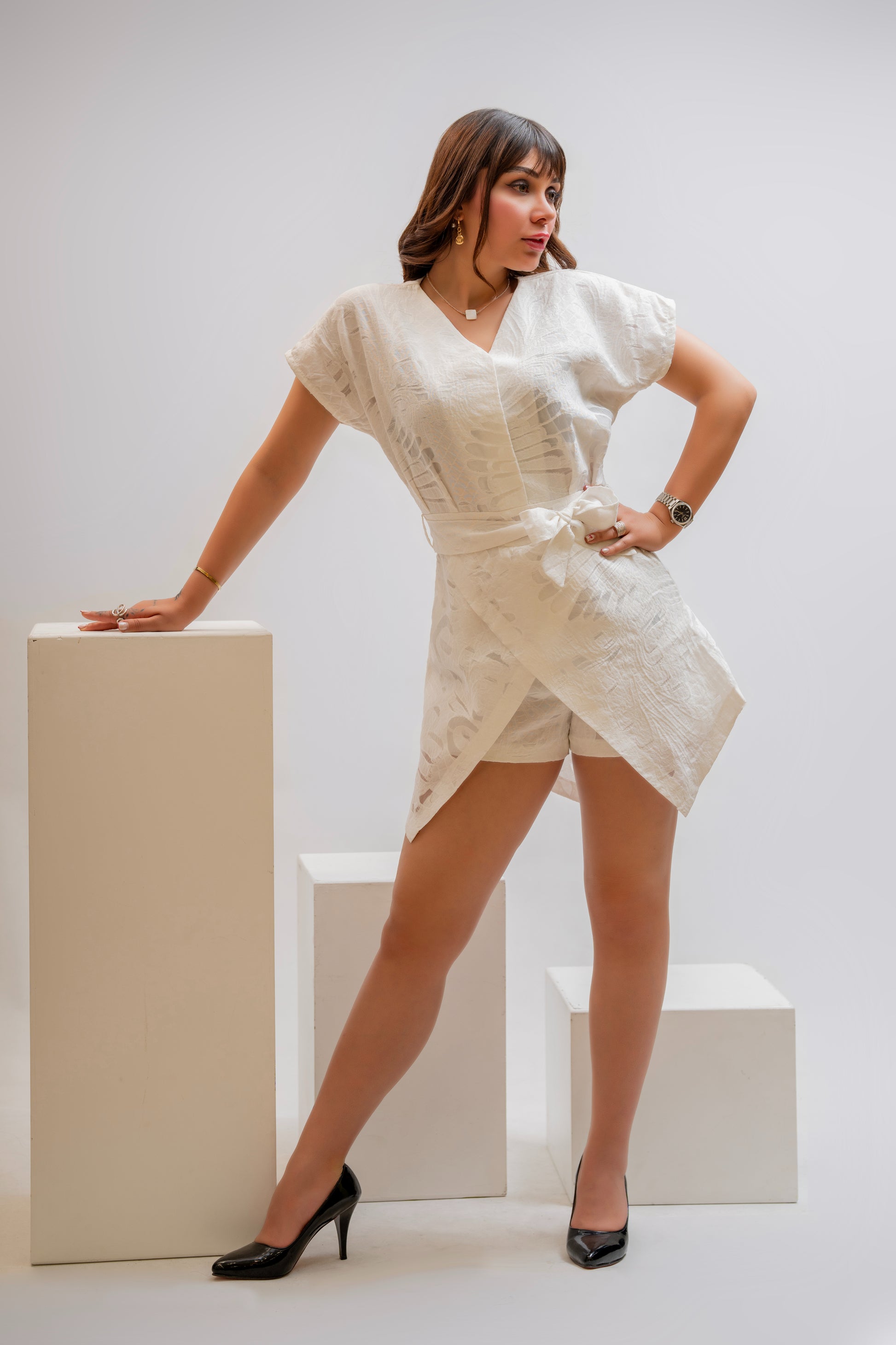 Elevate your summer style with this stunning white wrap mini dress, featuring delicate floral embroidery and a flattering tie waist. Lightweight, breathable, and elegant.