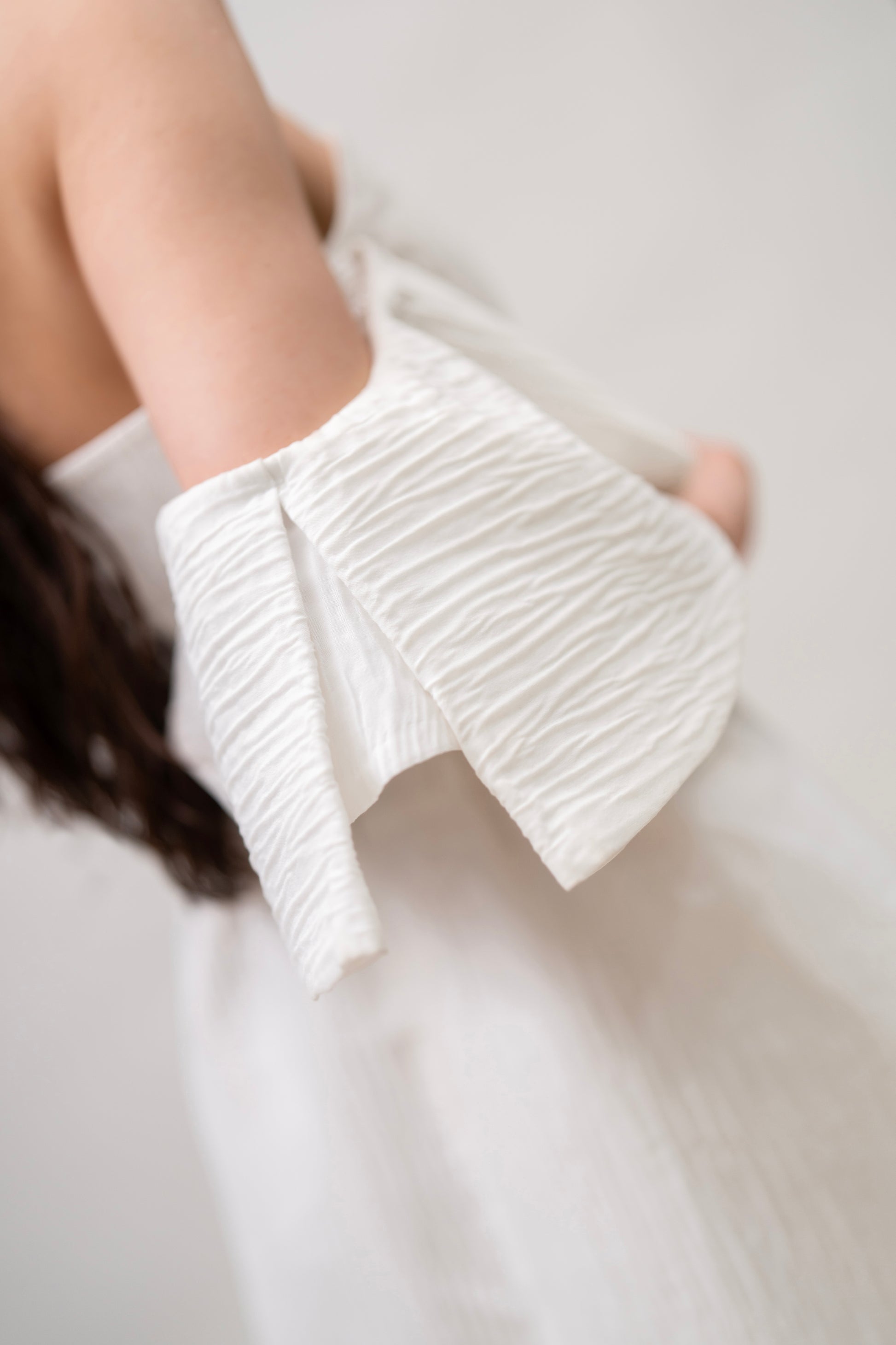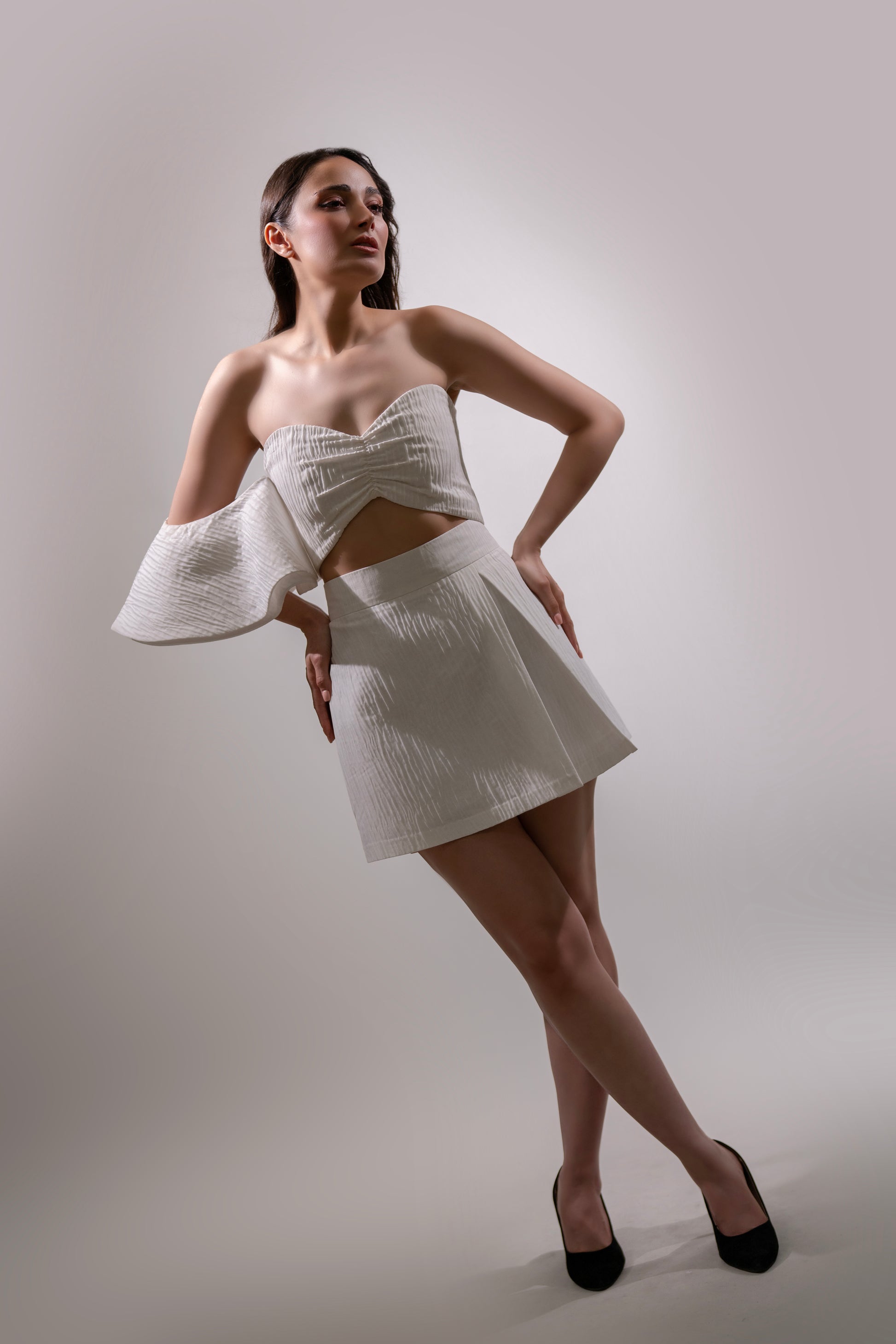Handmade white set with a one-sleeve crop top and matching mini skirt. Lightweight, elegant, and summer-ready.