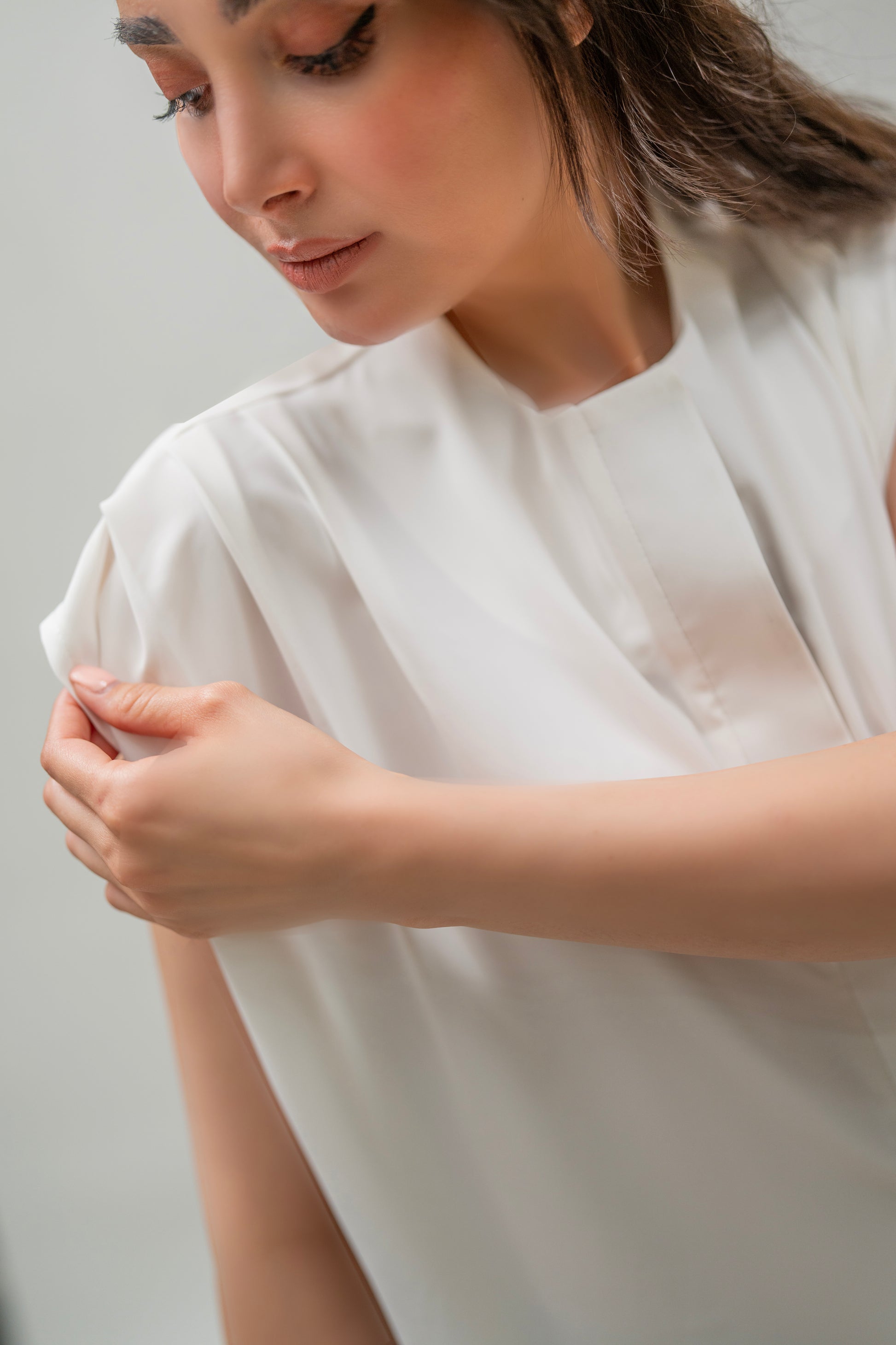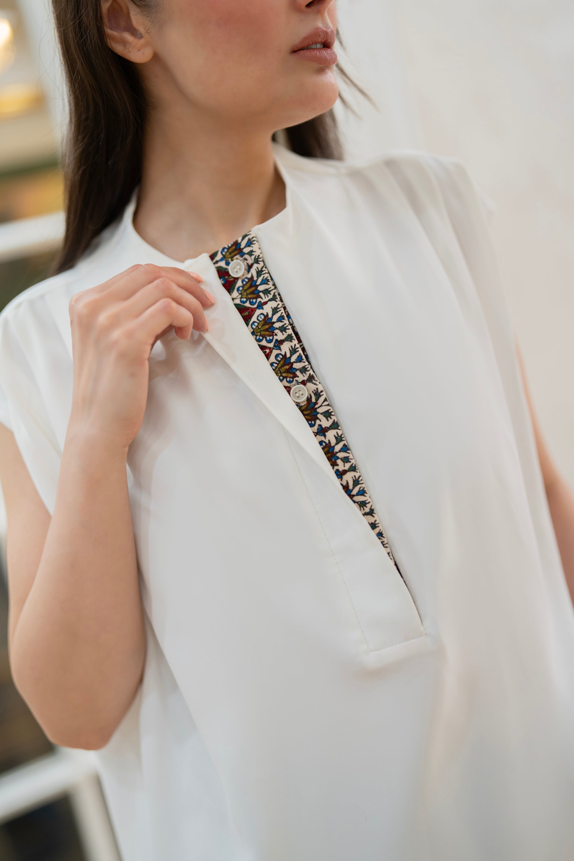 A flowy white sleeveless top featuring hand-printed traditional patterns on the placket and hem. Light, comfortable, and effortlessly chic.