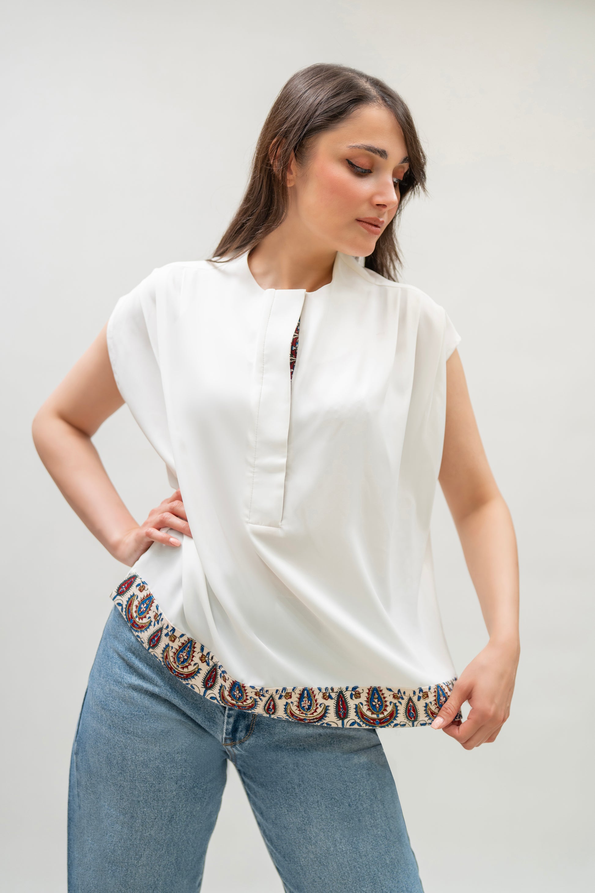 White Top with Traditional Printed Trim